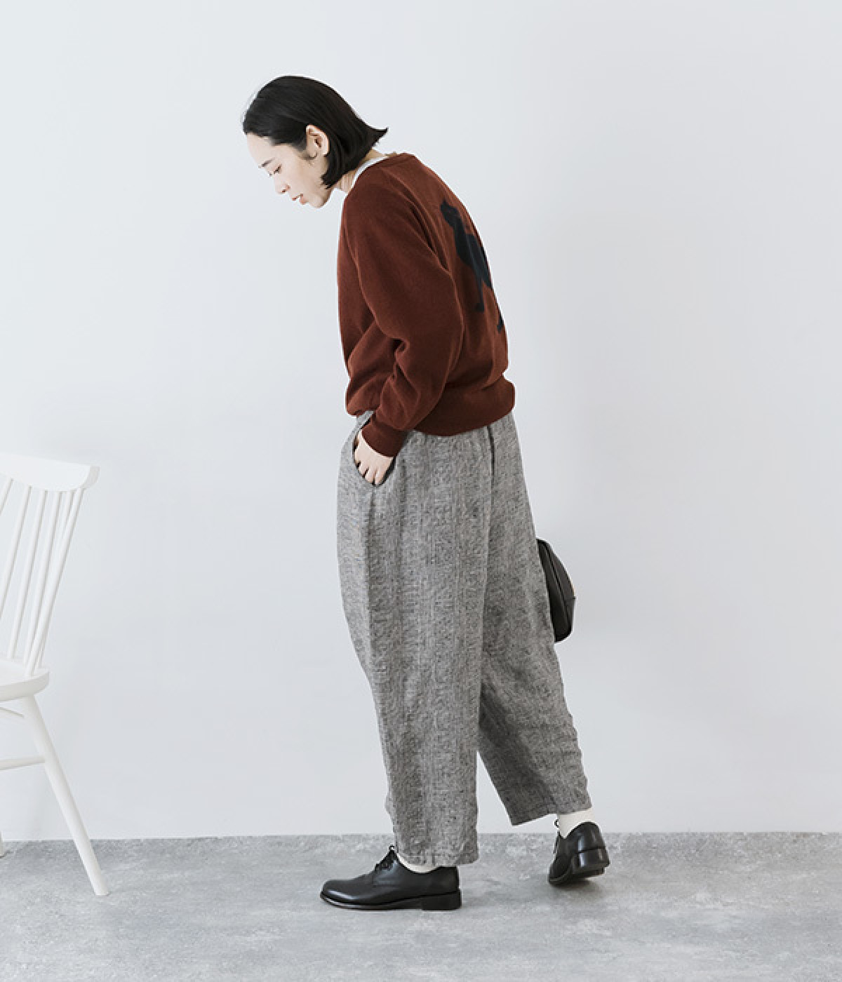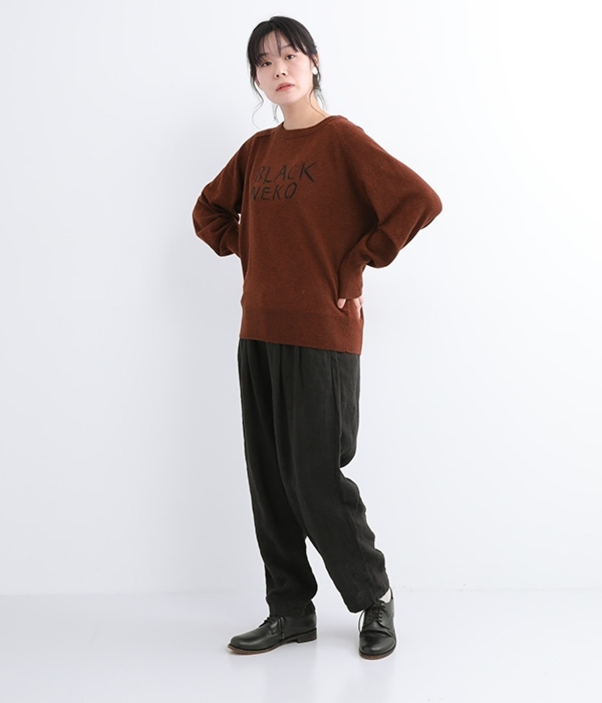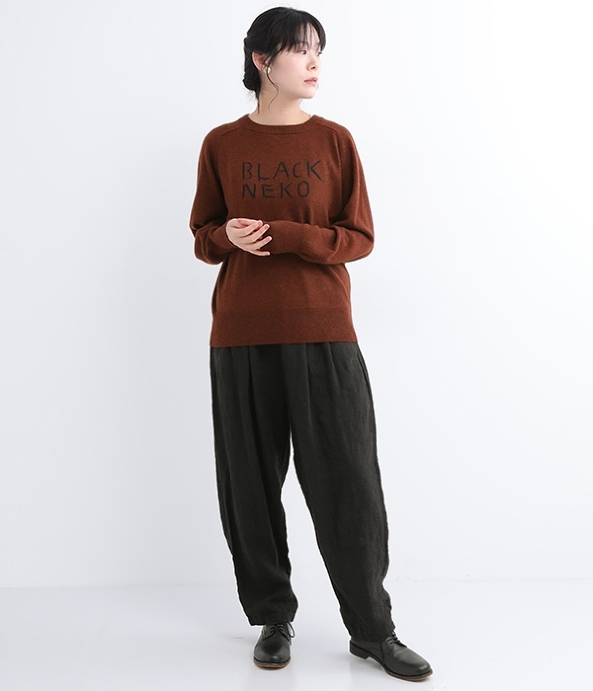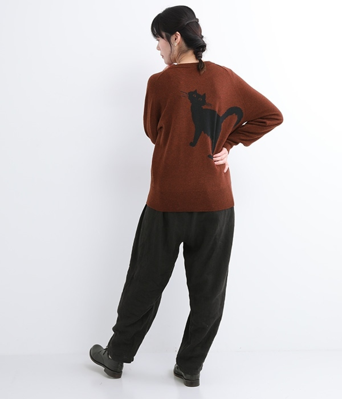 背中に大きく描かれた黒猫がインパクト抜群なニットプルオーバーです。ほっこりとあたたかみのある表情のニットと、走り書きのようなタッチのロゴとのコントラストで印象的なデザインに仕上げました。やわらかな風合いで着心地が良く、生地が厚すぎないのでジャケットなどアウターのインにも◎。