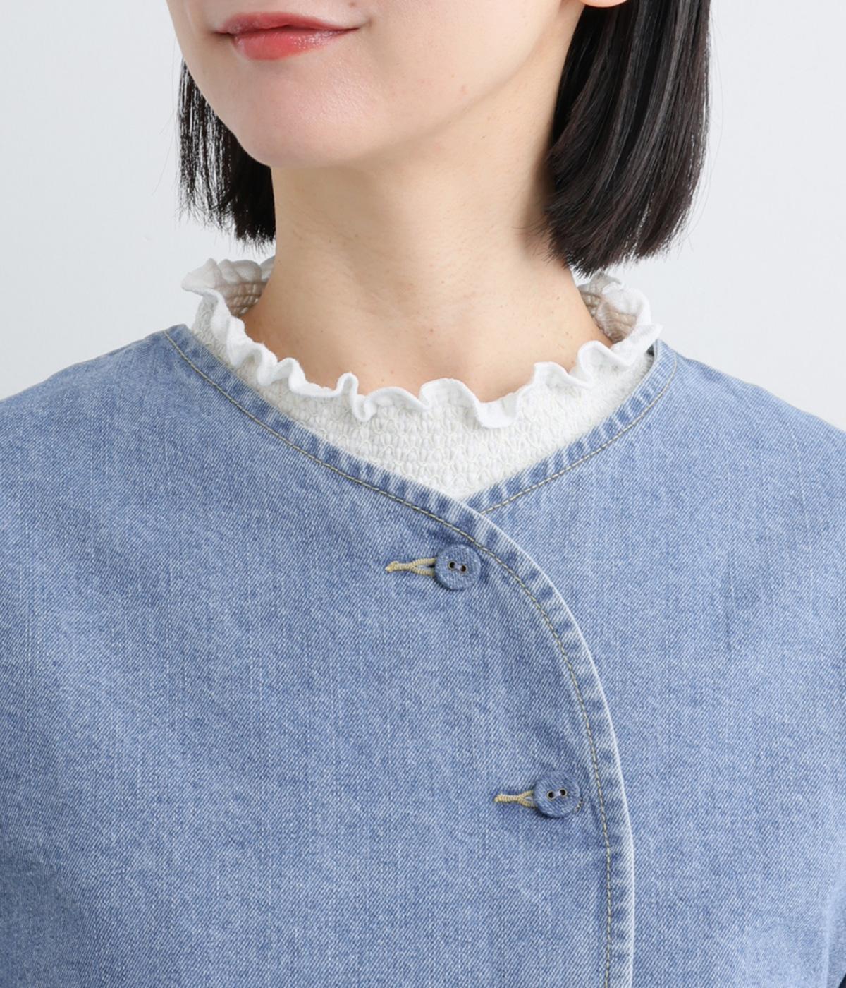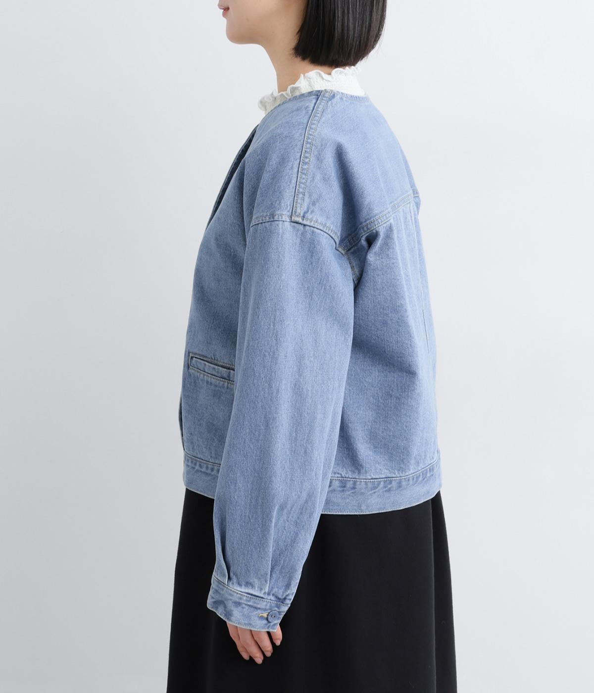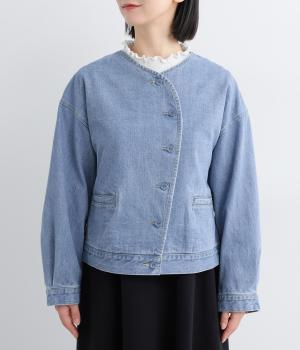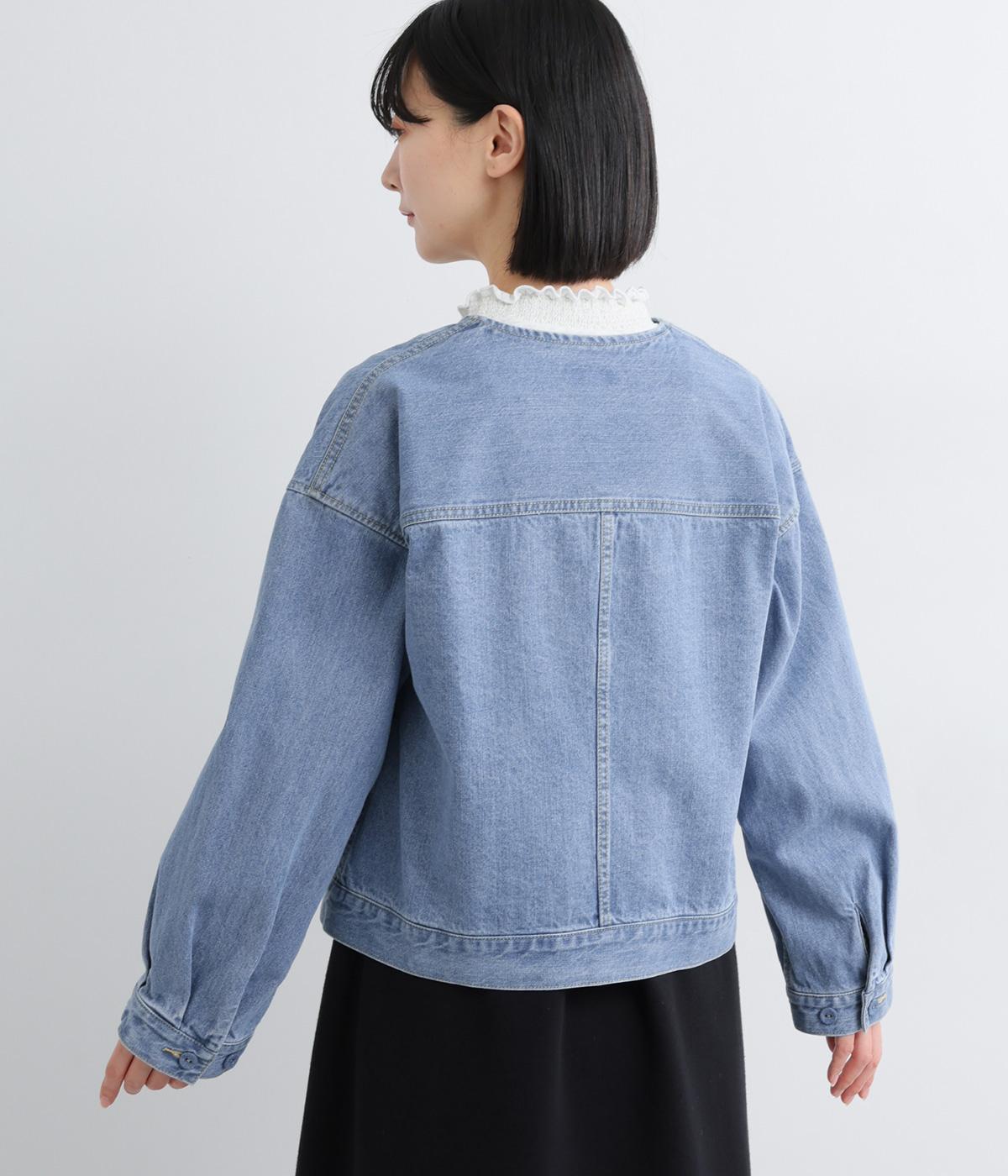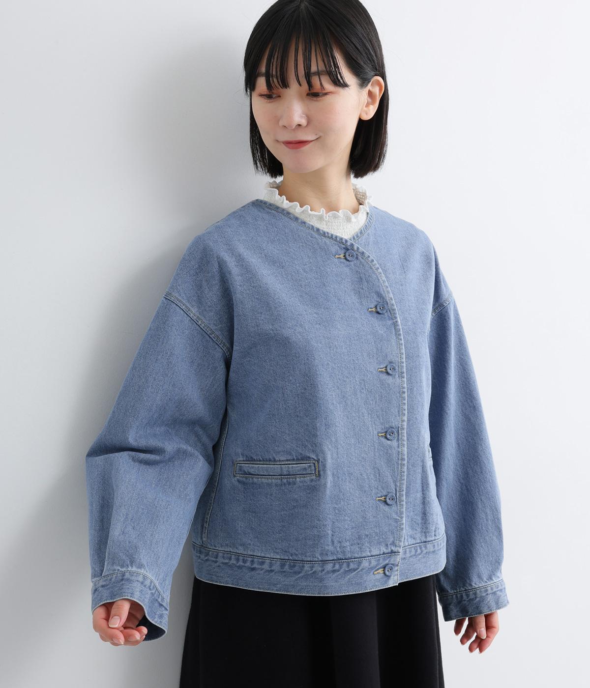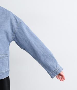 襟元から丸くカーブした前立て部分が印象的な、デニムジャケット。袖口にはタックとボタンを施し、ボリュームのあるデザインに。袖口ボタンの位置は調整できます。ボタン部分もデニム素材でまとめ、全体的に女性らしい雰囲気に仕上げています。