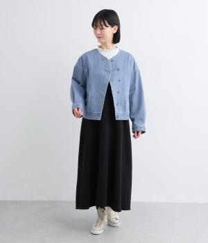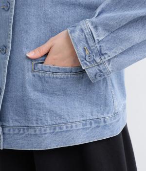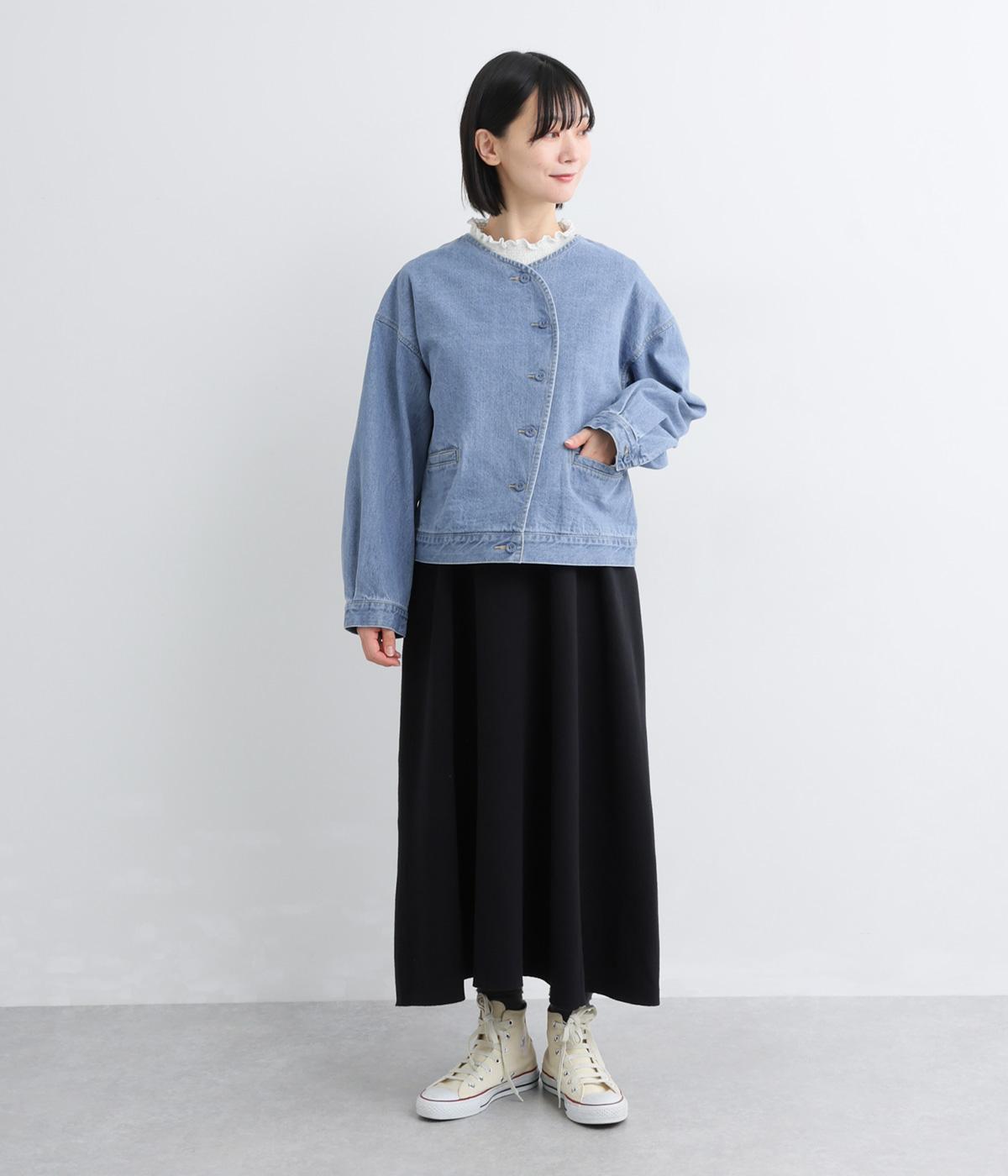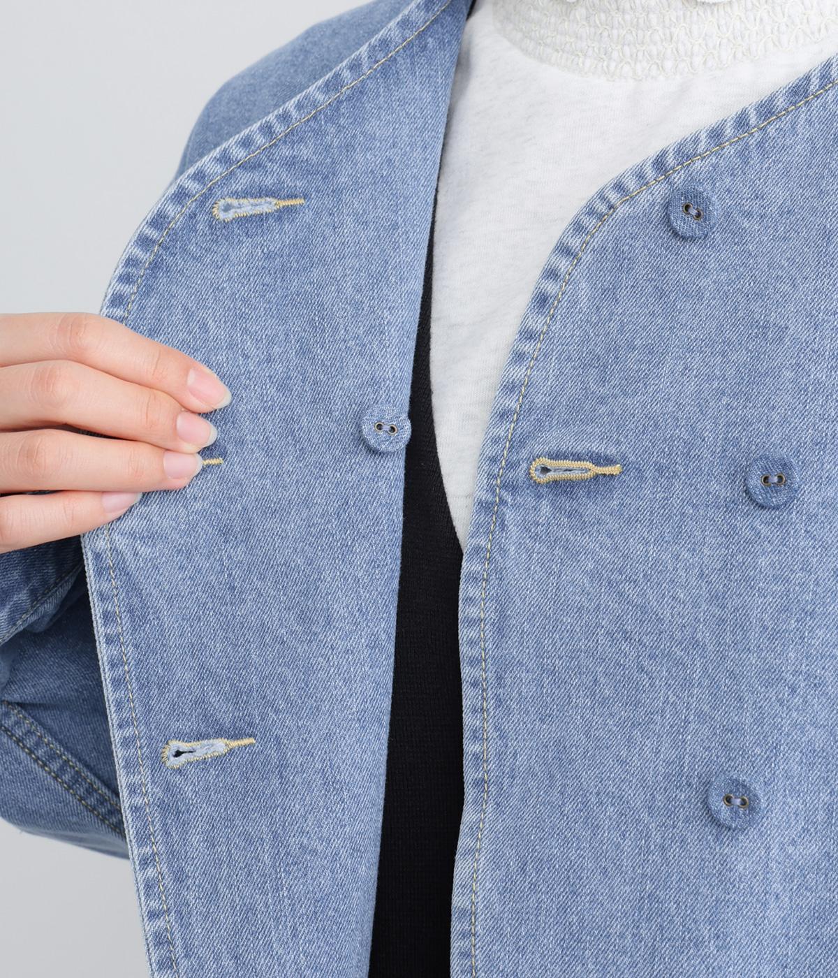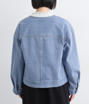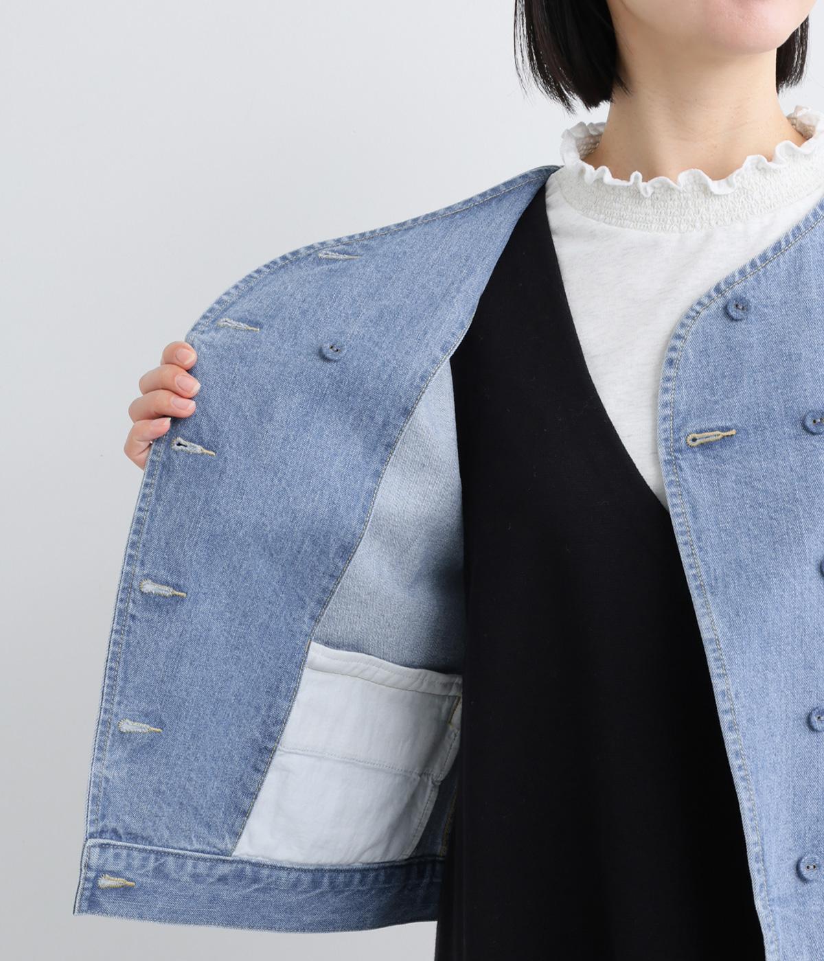 襟元から丸くカーブした前立て部分が印象的な、デニムジャケット。袖口にはタックとボタンを施し、ボリュームのあるデザインに。袖口ボタンの位置は調整できます。ボタン部分もデニム素材でまとめ、全体的に女性らしい雰囲気に仕上げています。