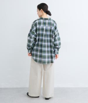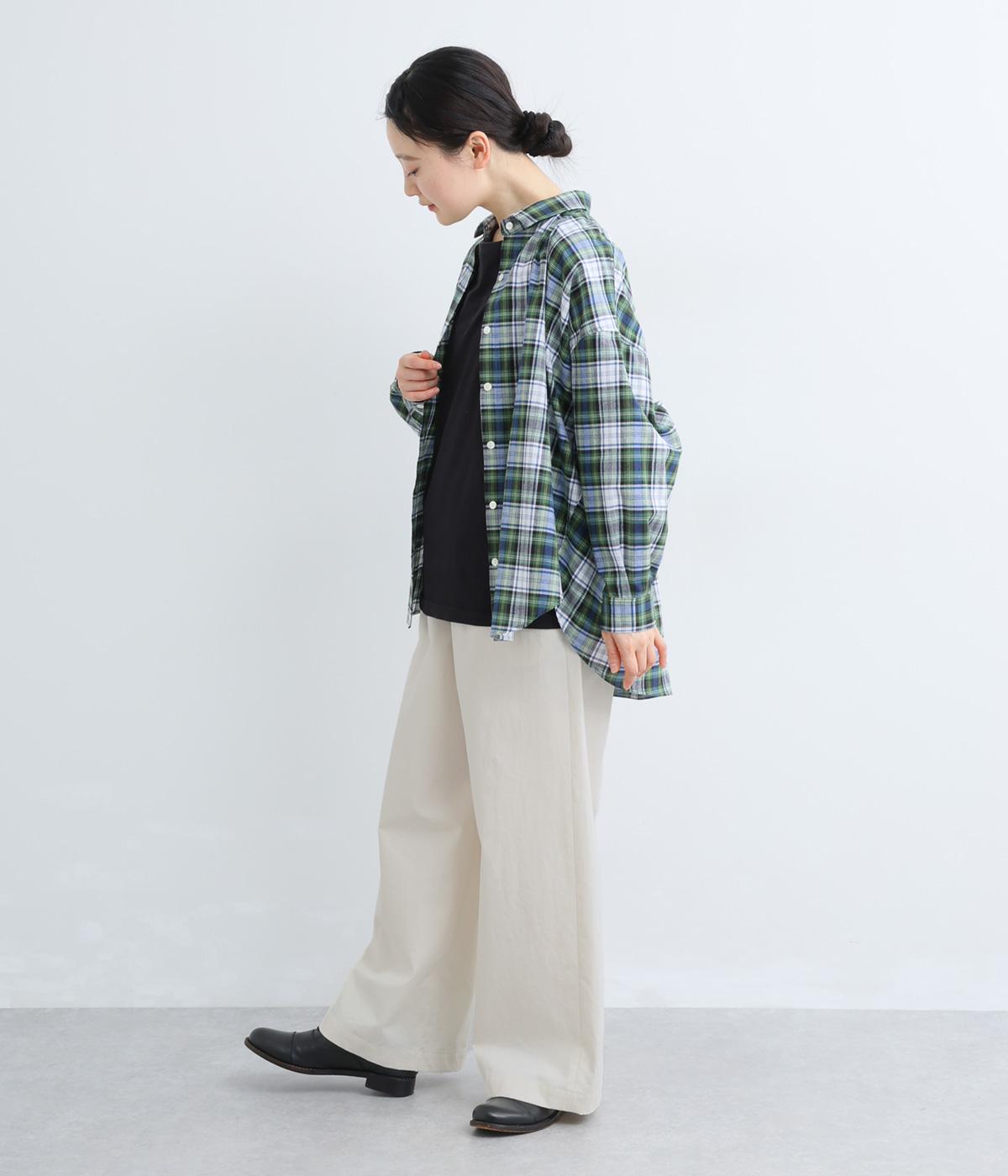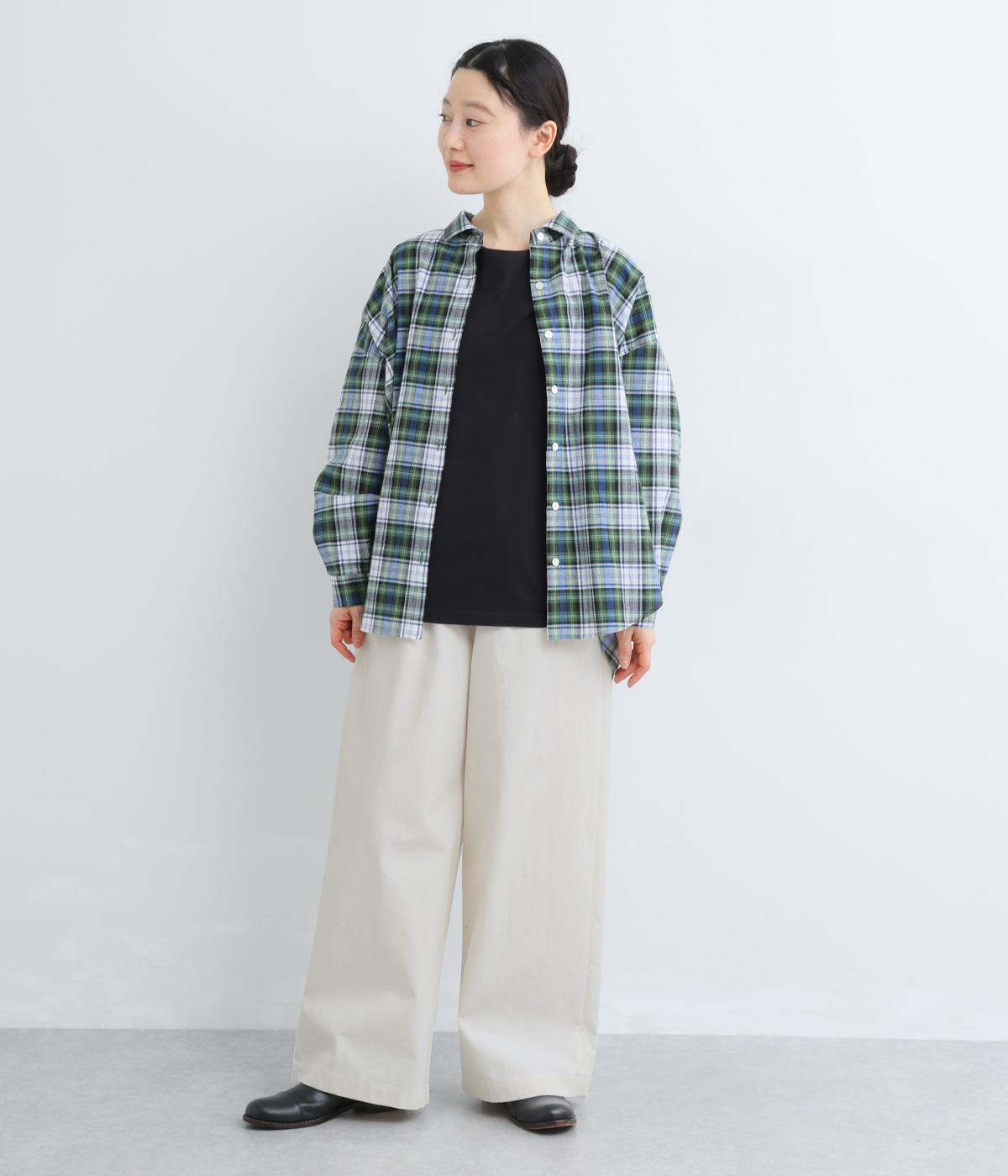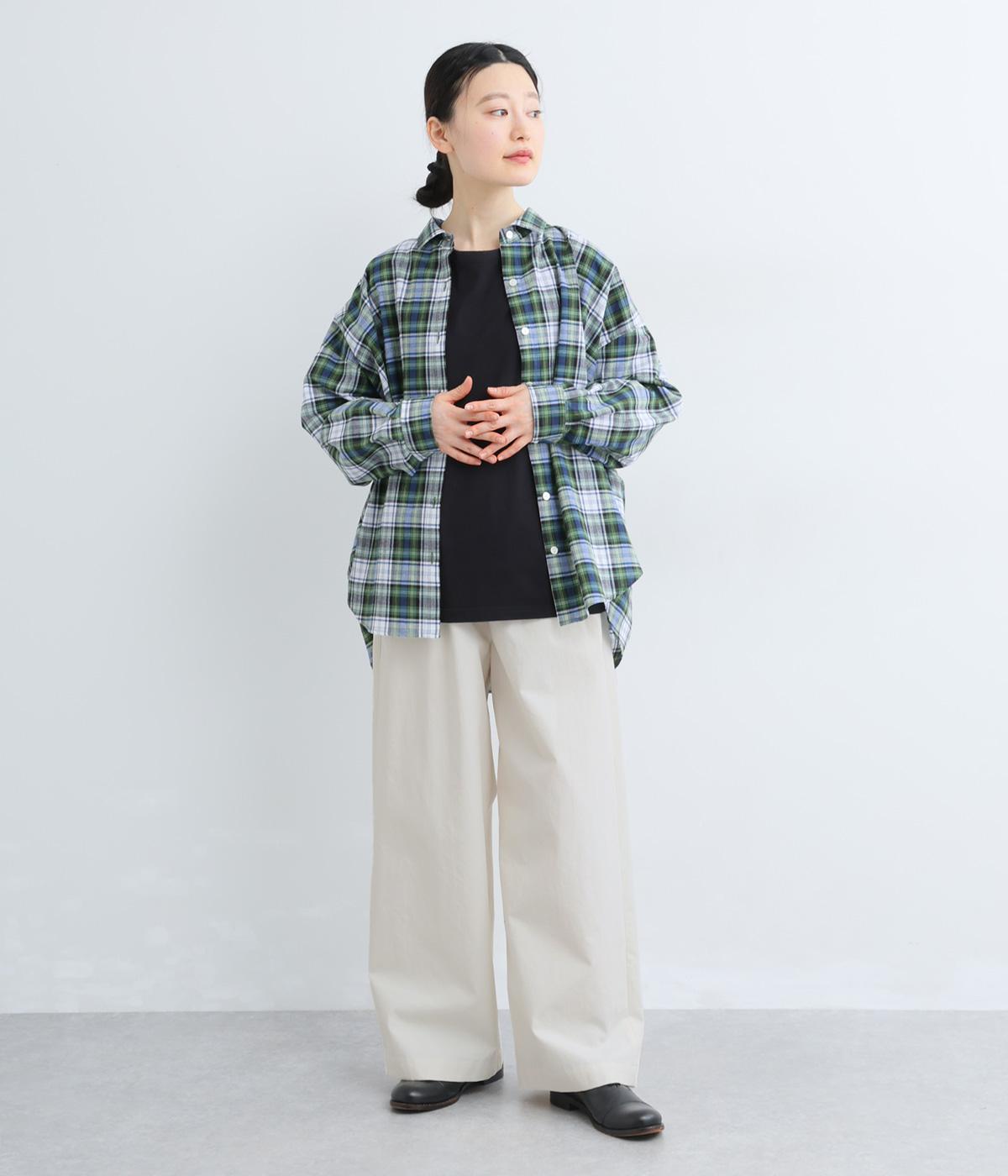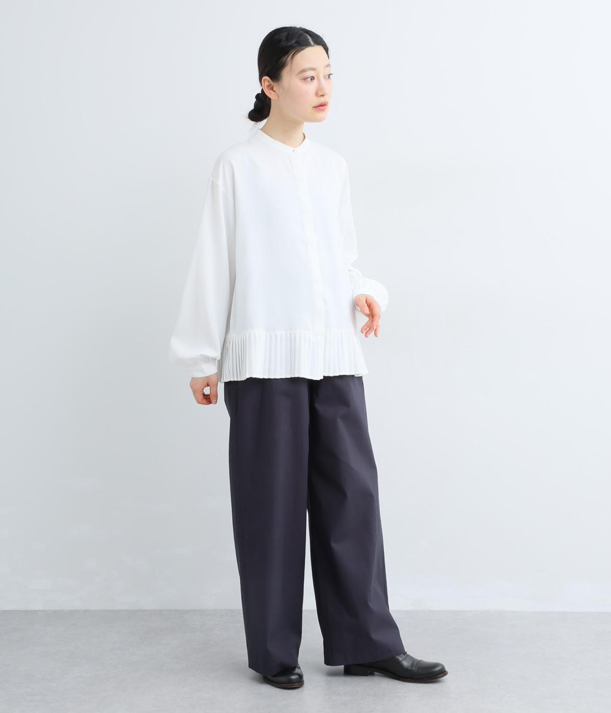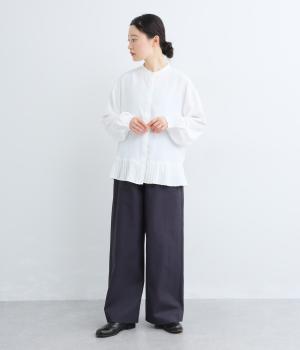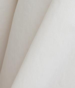 高密度なハリがシルエットを美しく保つコットンタイプライター生地を使用しています。さらりとドライな質感で、自然なシワ感が特徴です。マットでナチュラルな光沢が上品な印象の素材感です。