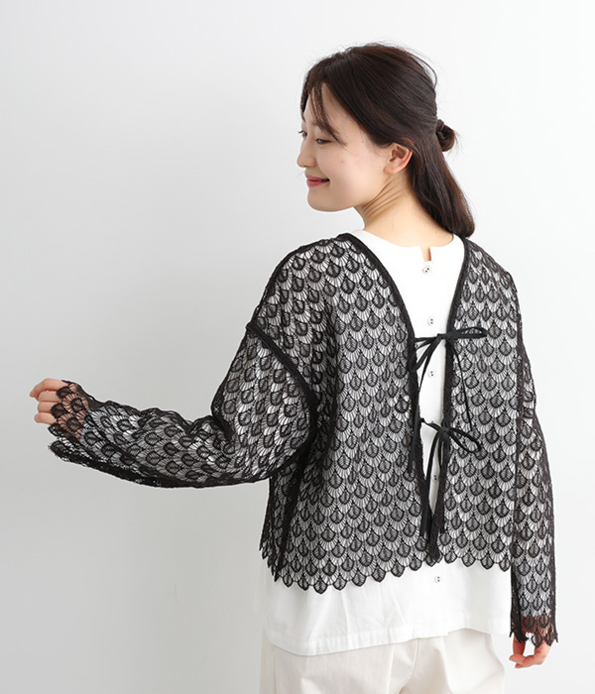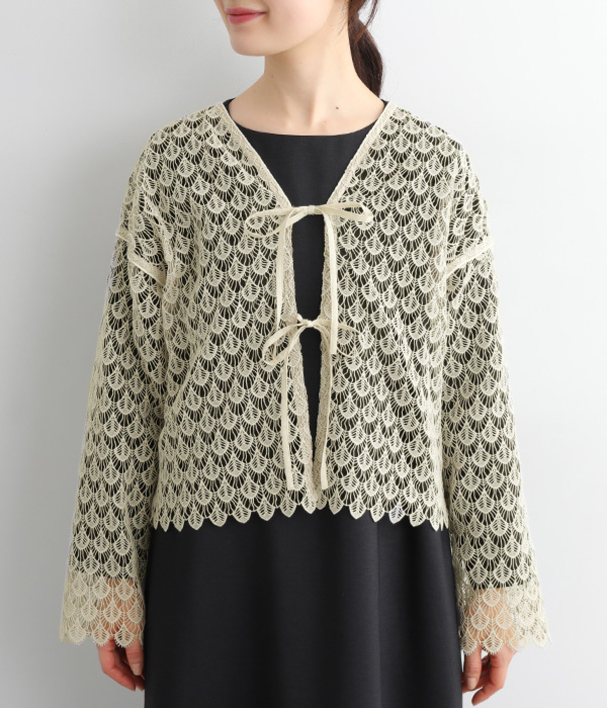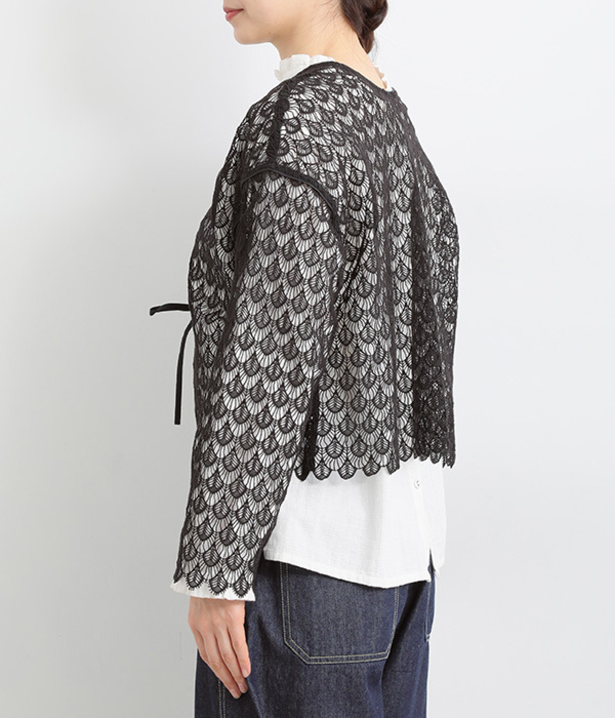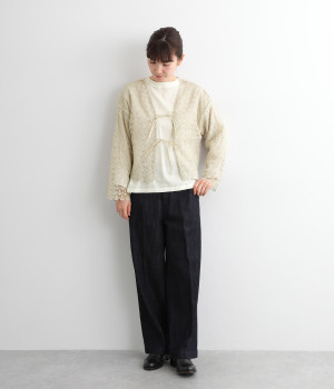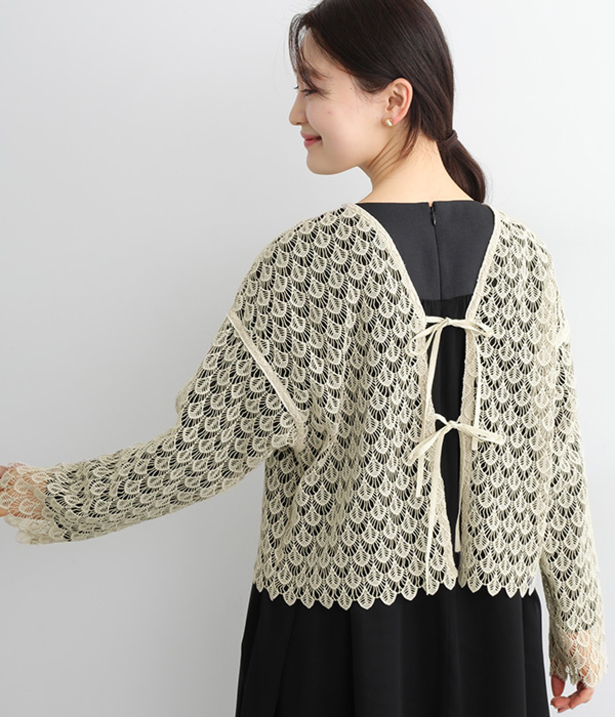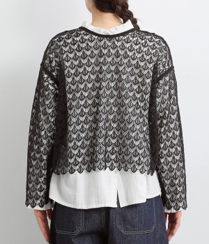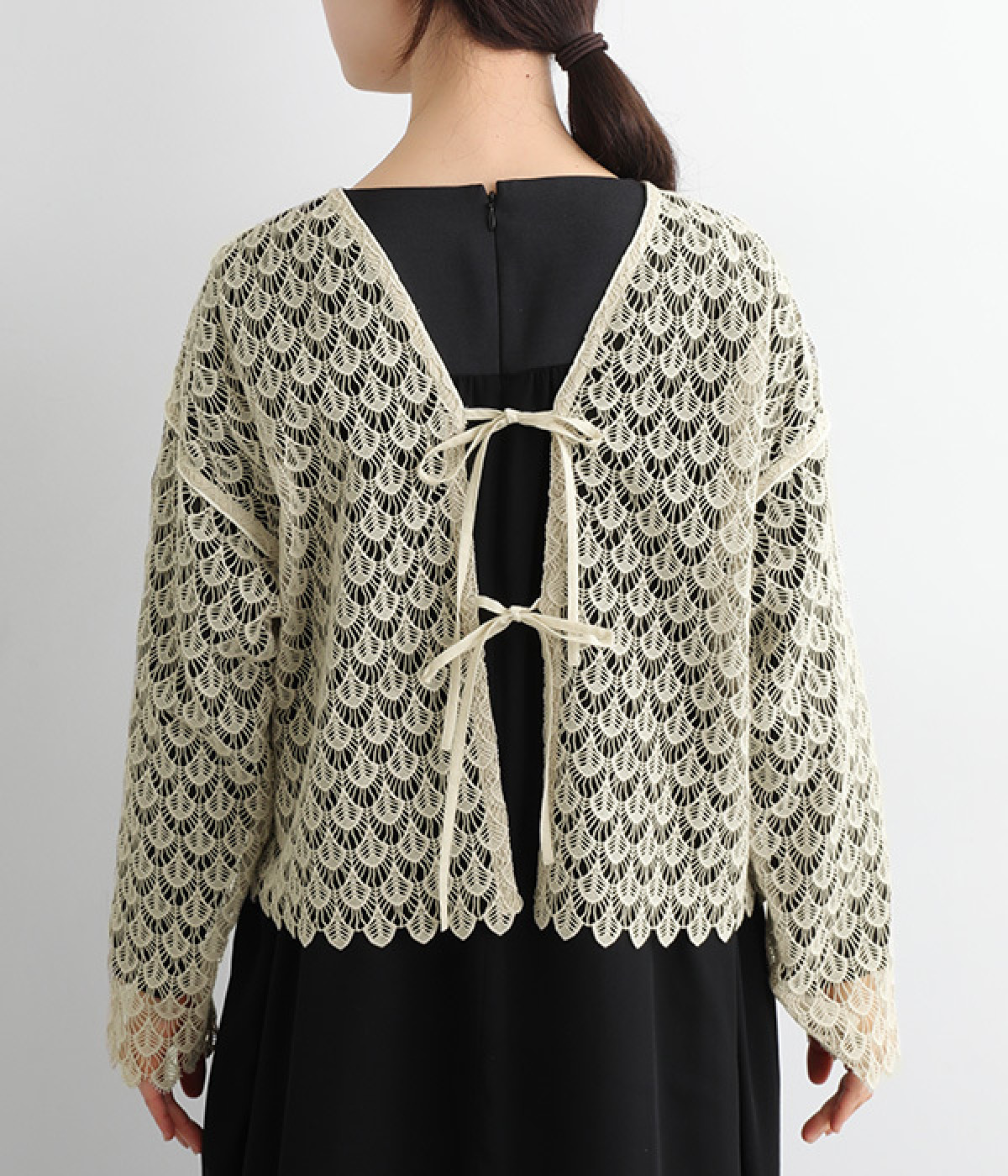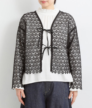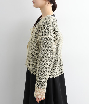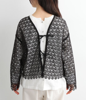 レースのみで仕立てた贅沢な一枚。カーディガンにしたり、後ろリボンのブラウスにしたりと、前後どちらでも着用できる2way仕様。クルーネックとVネックリボン、顔まわりの見え方にも変化をつけています。