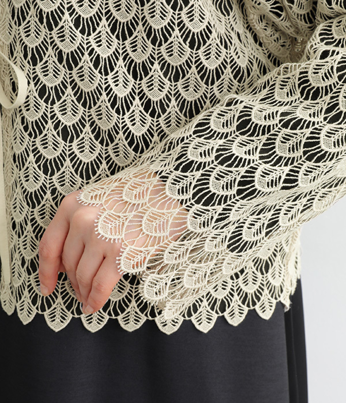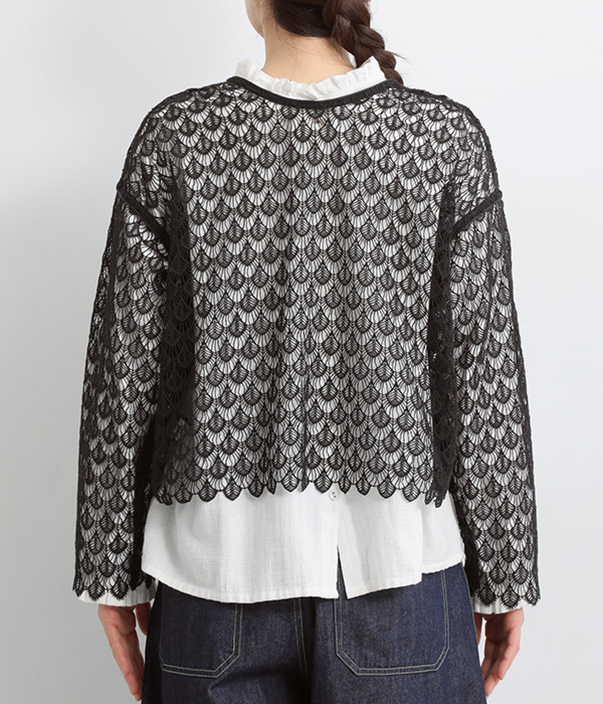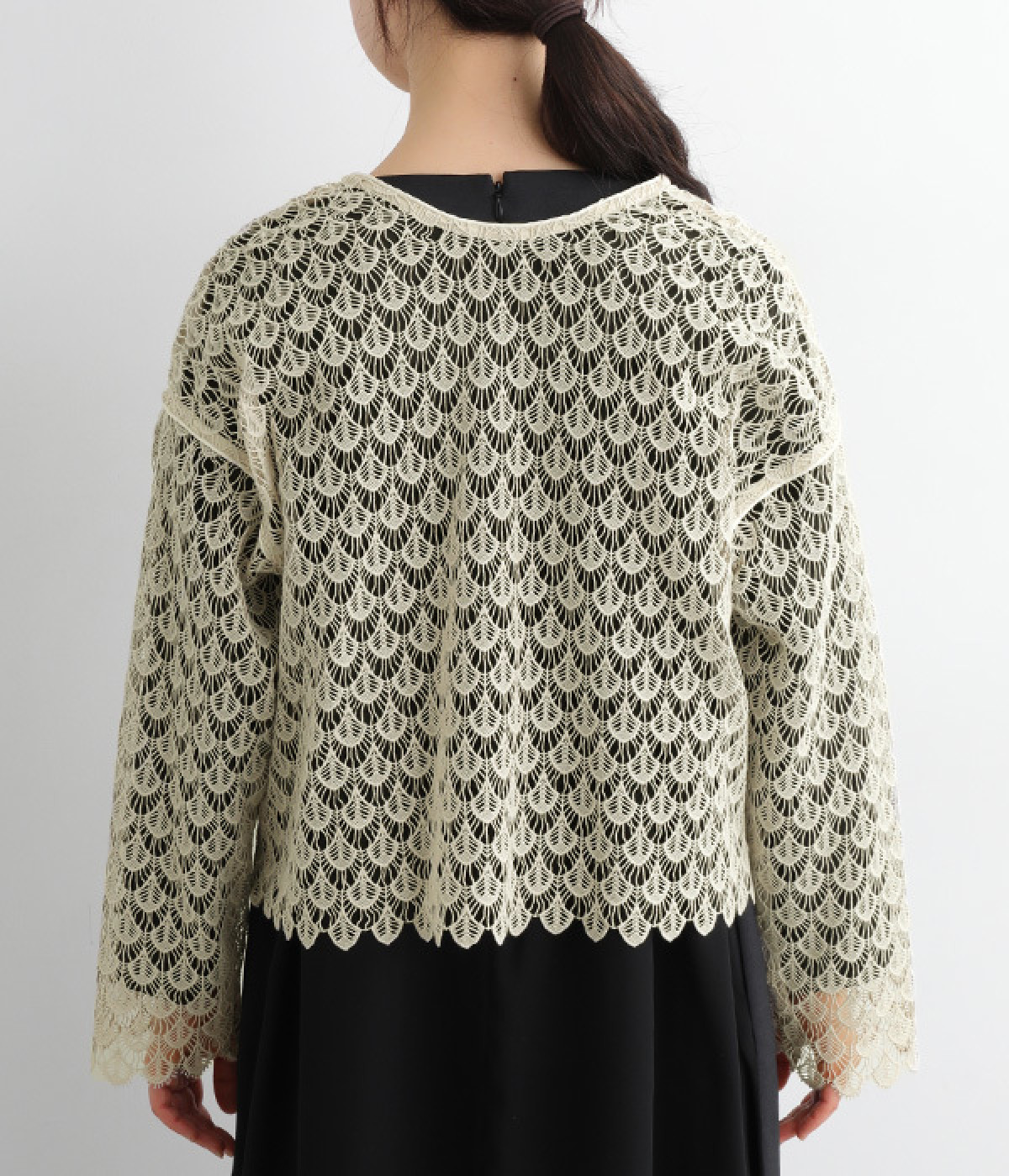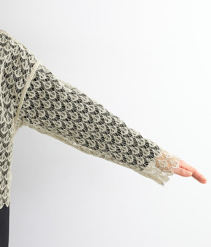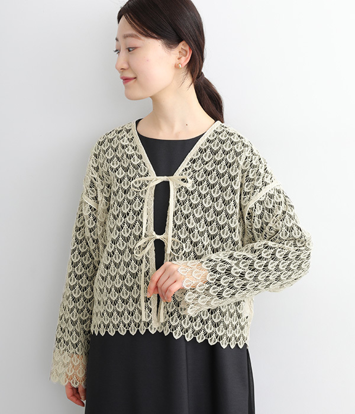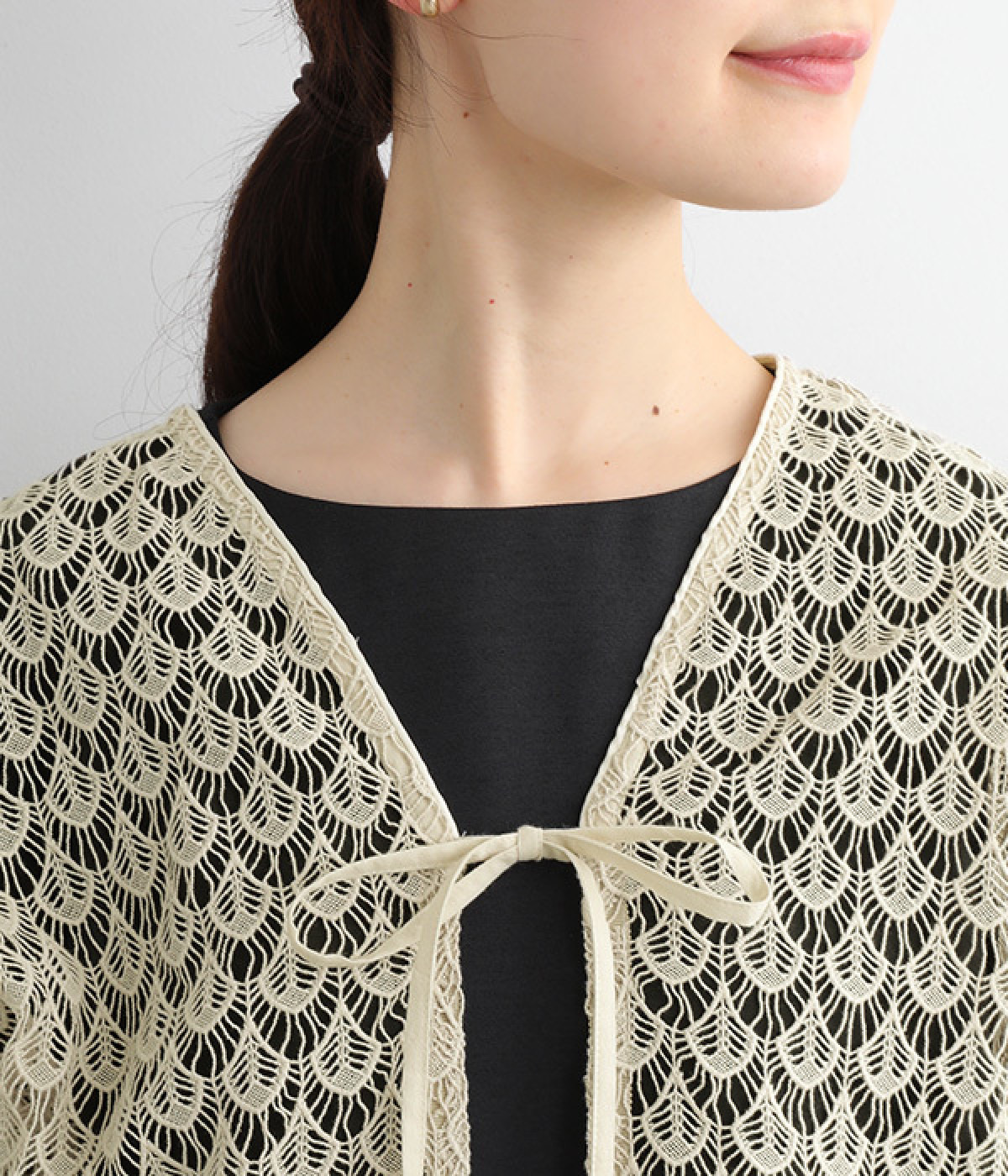 レースのみで仕立てた贅沢な一枚。カーディガンにしたり、後ろリボンのブラウスにしたりと、前後どちらでも着用できる2way仕様。クルーネックとVネックリボン、顔まわりの見え方にも変化をつけています。