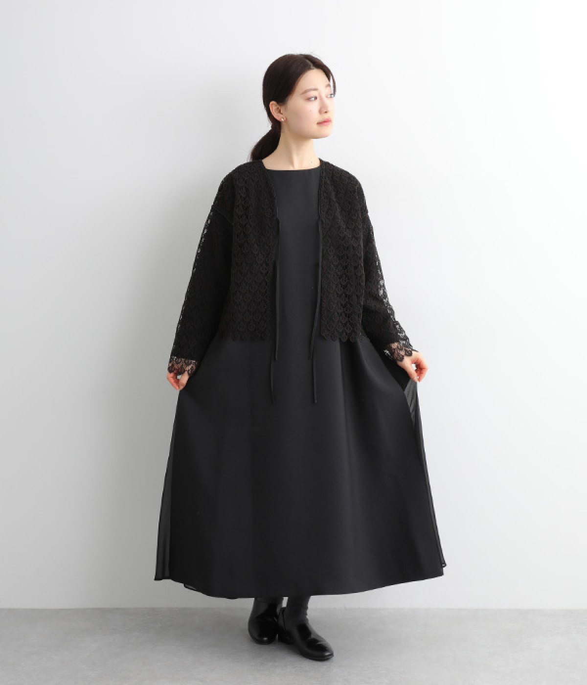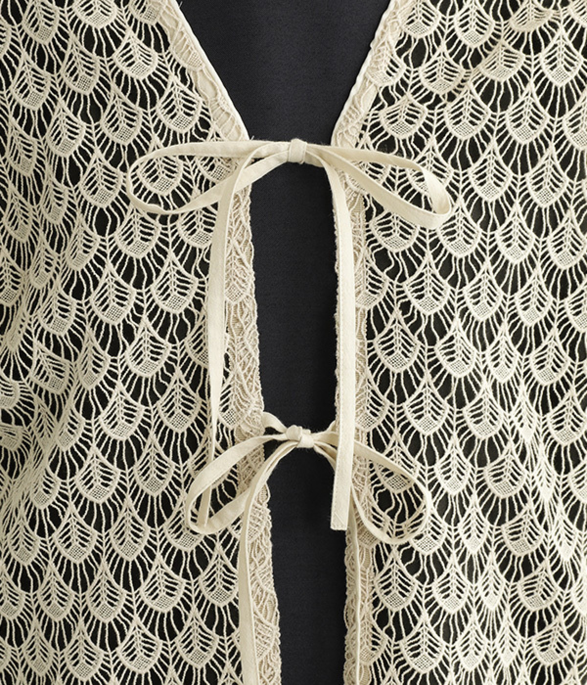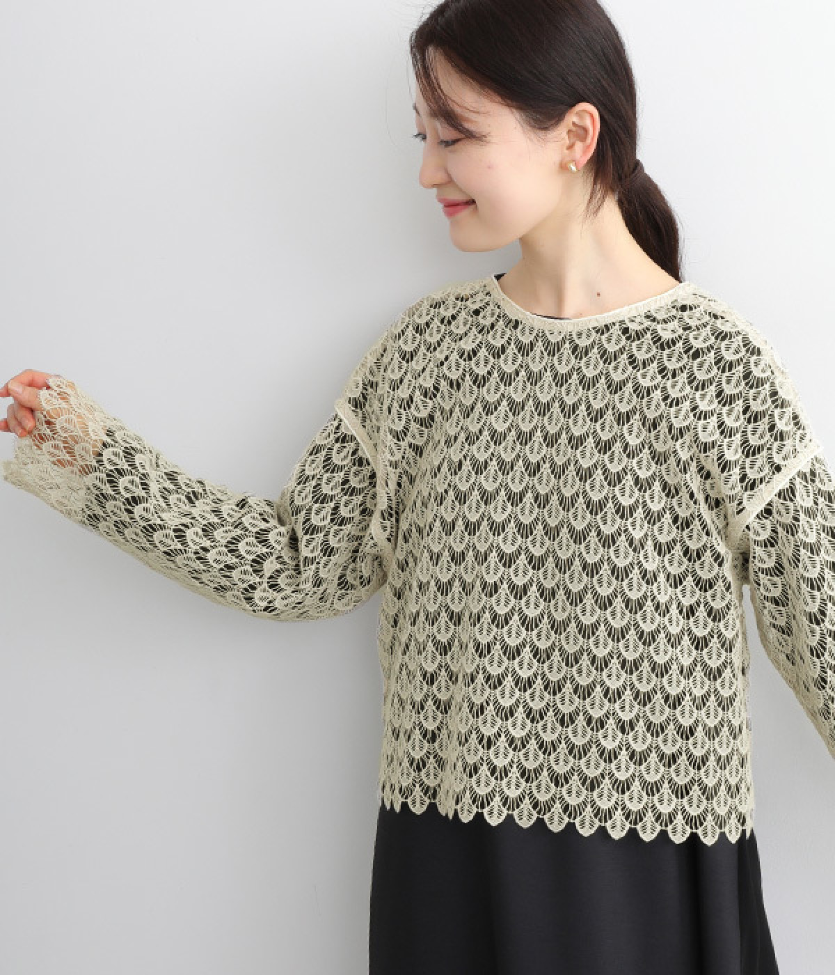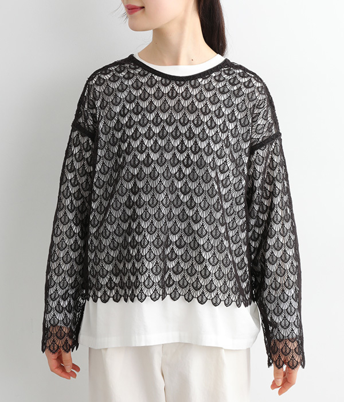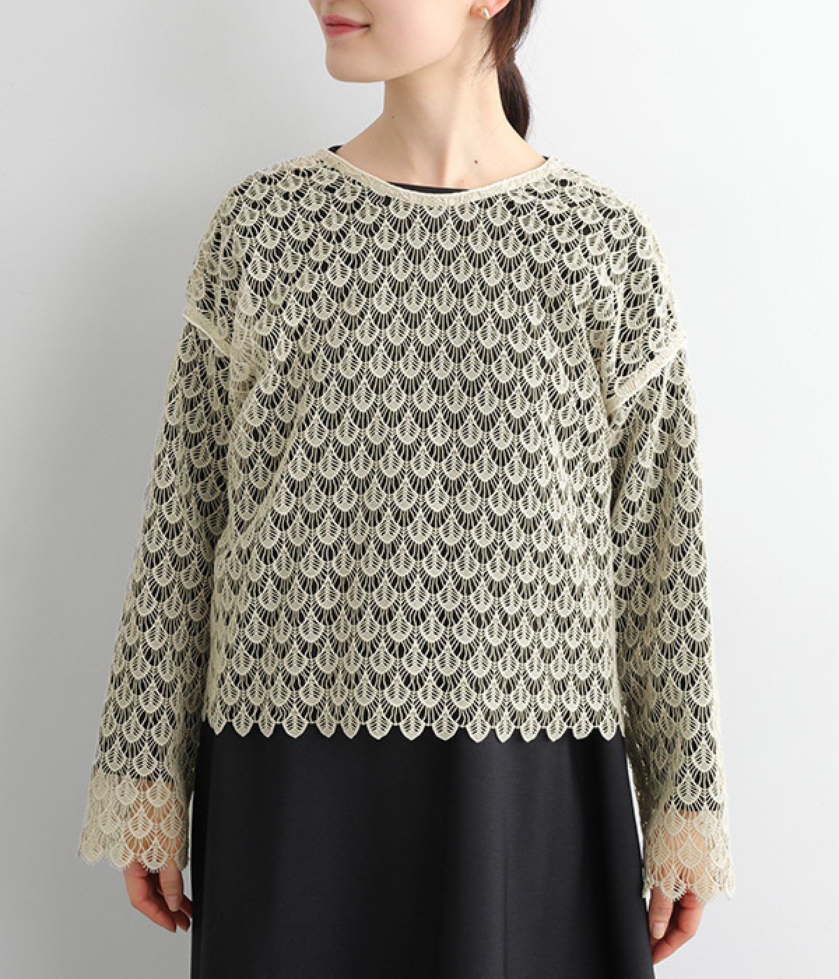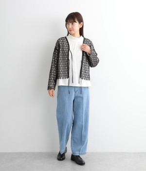 レースのみで仕立てた贅沢な一枚。カーディガンにしたり、後ろリボンのブラウスにしたりと、前後どちらでも着用できる2way仕様。クルーネックとVネックリボン、顔まわりの見え方にも変化をつけています。