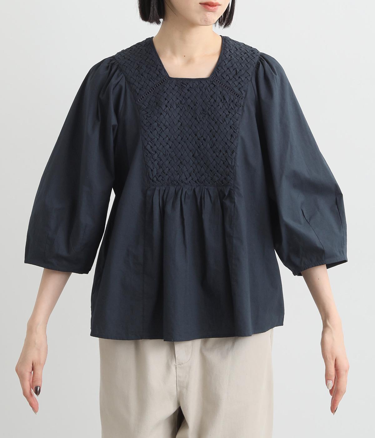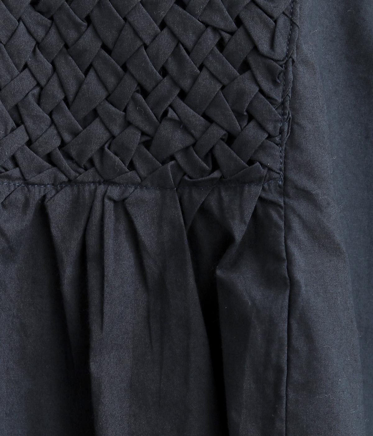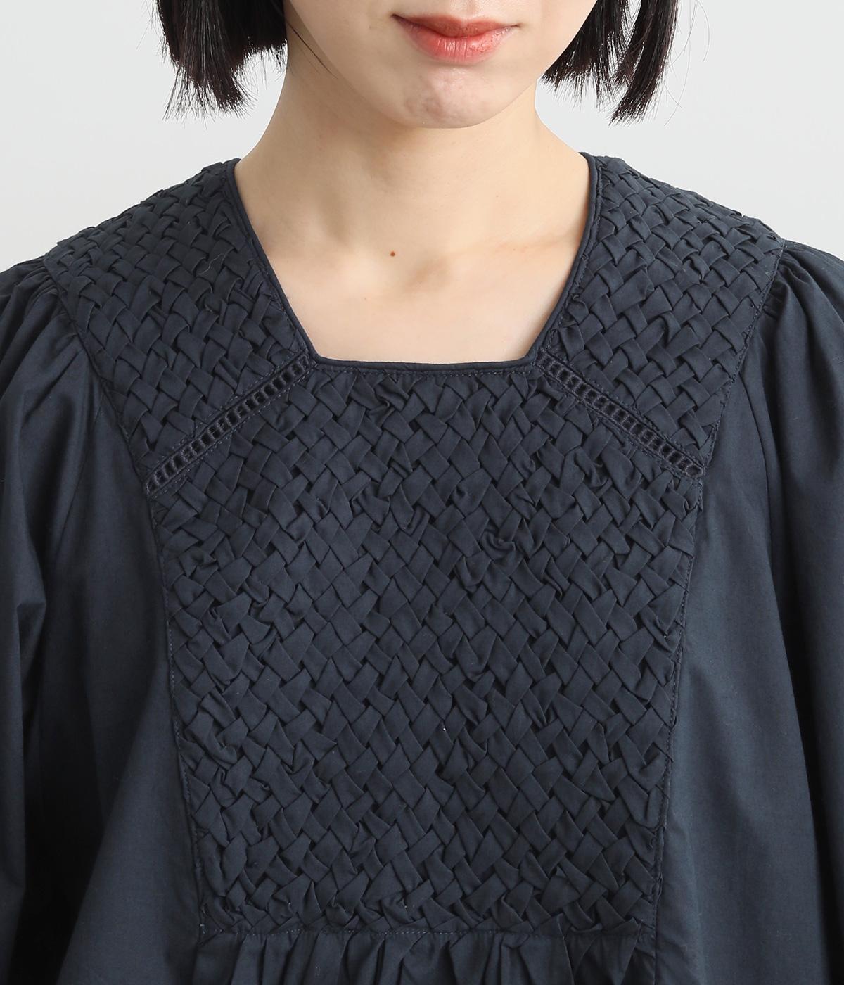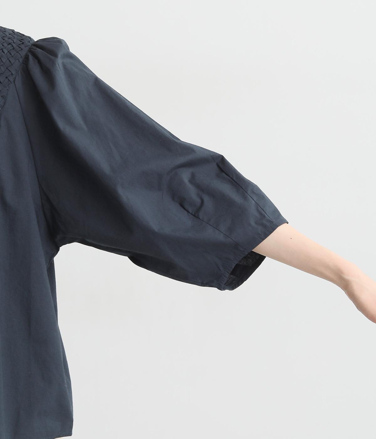 まるで生地を編み込んだようなスモッキング刺繍が目を引くブラウス。前後ヨーク下や肩に細かなギャザーを入れて、ゆとりのあるフォルムに仕上げています。袖口にはダーツをほどこして立体感をアップ。細かなディテールが映える、一枚で着映えするアイテムです。