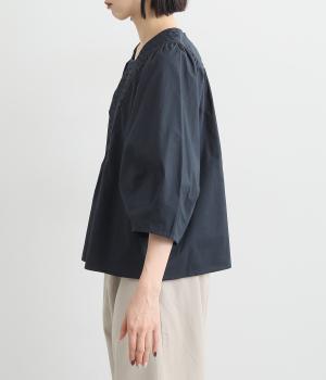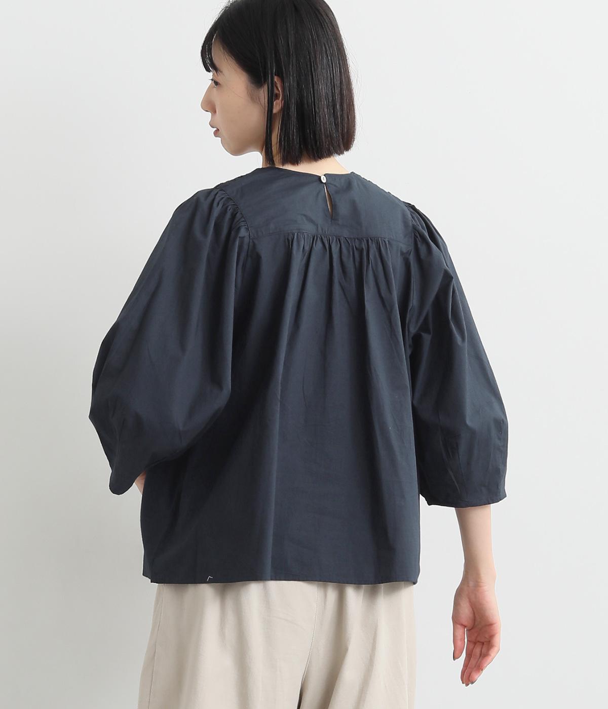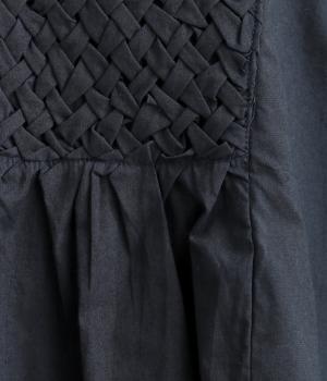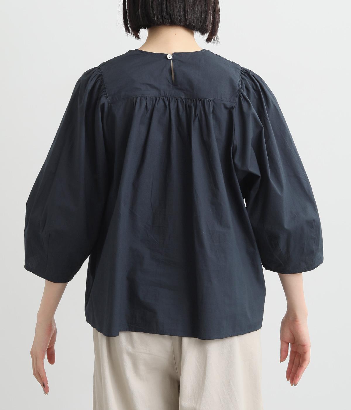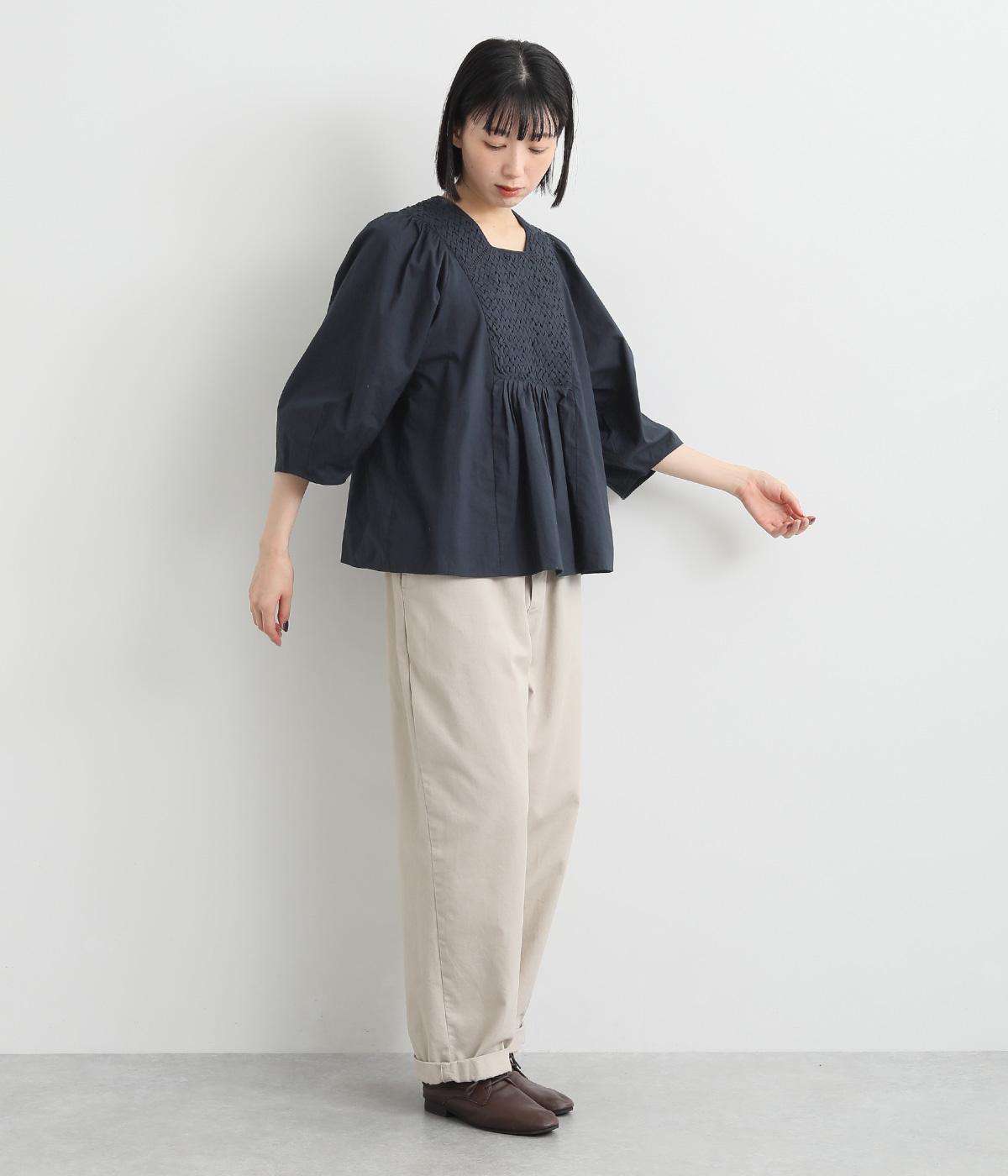 まるで生地を編み込んだようなスモッキング刺繍が目を引くブラウス。前後ヨーク下や肩に細かなギャザーを入れて、ゆとりのあるフォルムに仕上げています。袖口にはダーツをほどこして立体感をアップ。細かなディテールが映える、一枚で着映えするアイテムです。