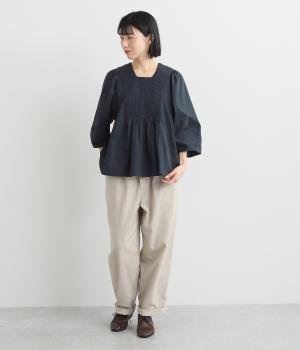 自然な佇まいとハリ感が特徴のコットン生地。手作業で仕上げられた、クラフト感のある刺しゅうがポイントです。刺しゅうの裏にやわらかな薄手の生地を重ねて肌触りを良くしています。