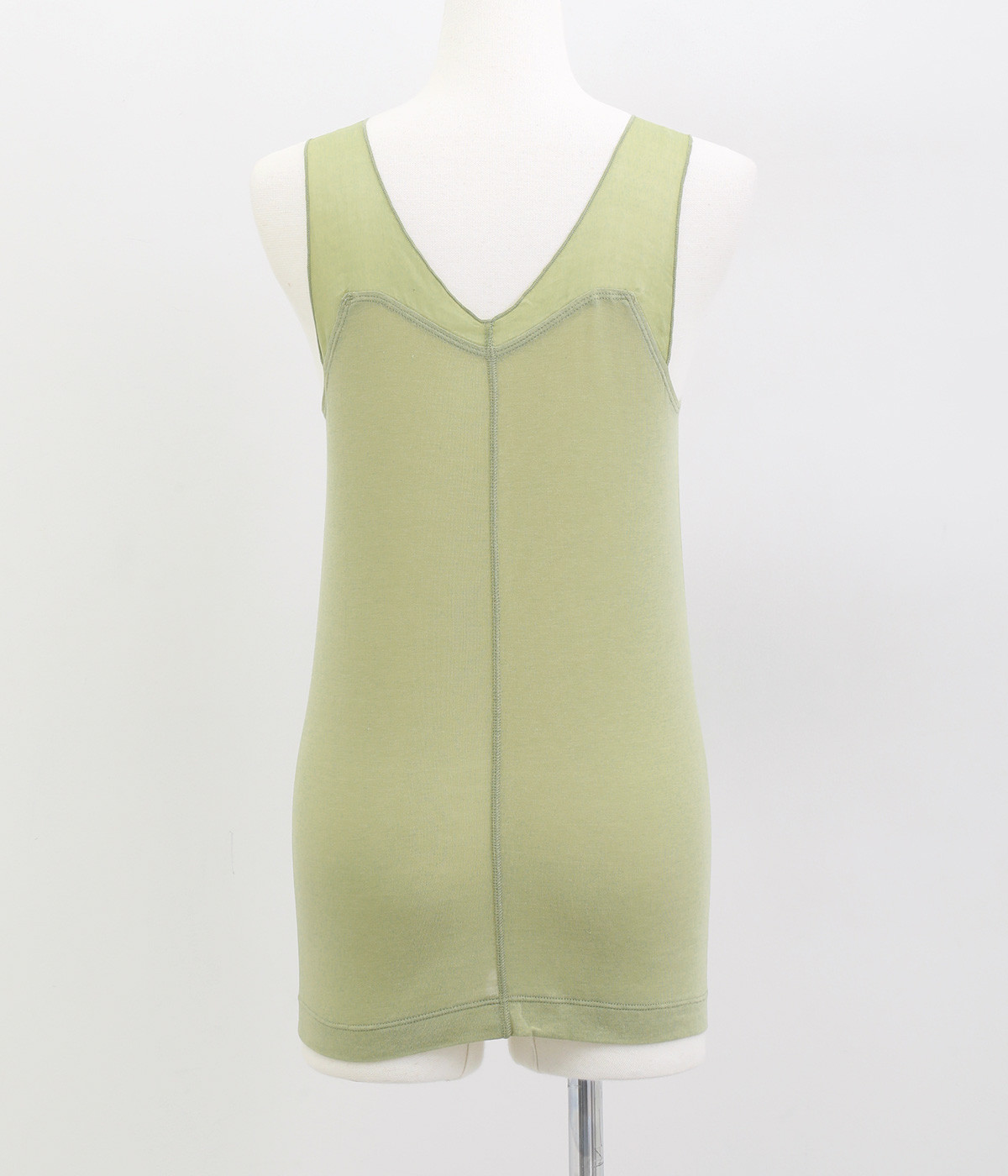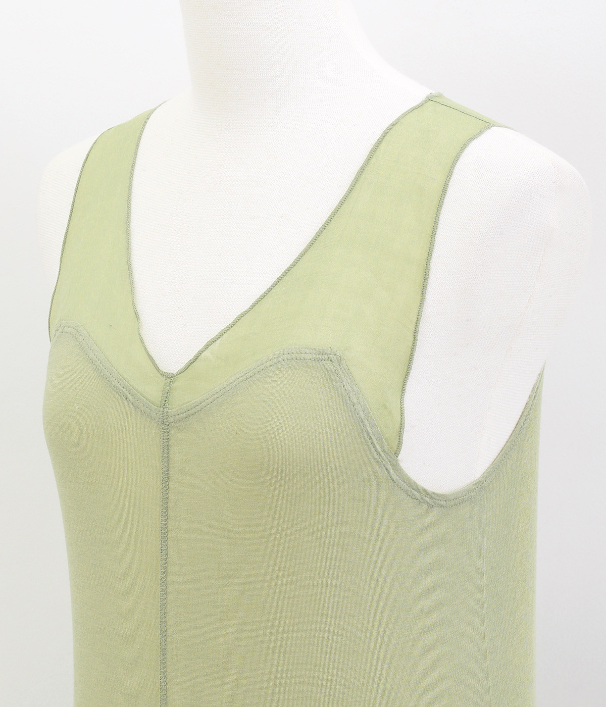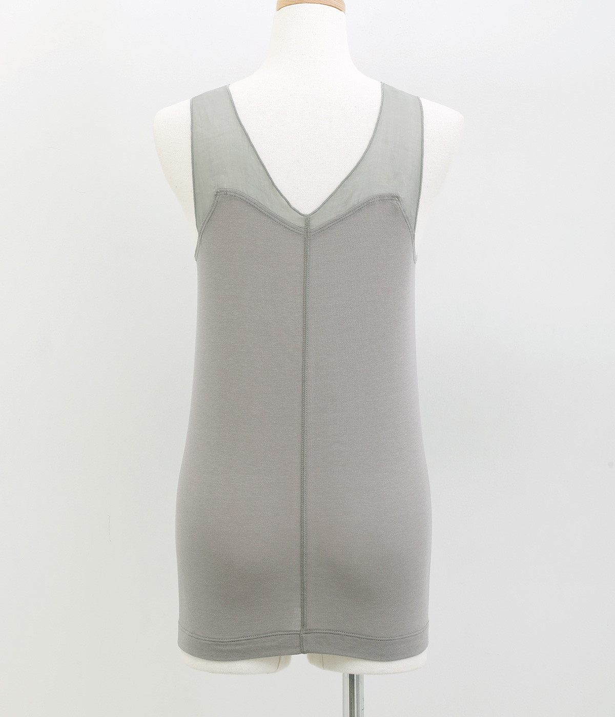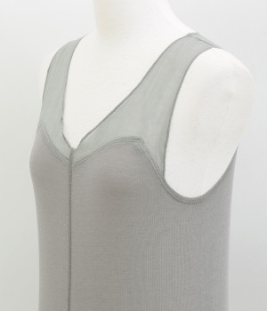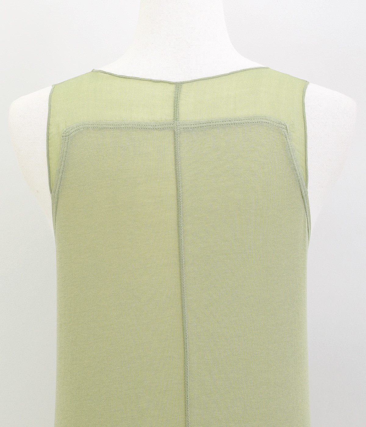 上身頃を布帛に切り替えた、異素材使いのタンクトップ。レイヤードした際にインナー見えを回避できる仕立てで、前後で襟ぐりを変えて2wayで楽しめます。襟ぐりや袖ぐりは繊細な素材とマッチするよう細いメロー仕立てにするなど、細部にもこだわりを。