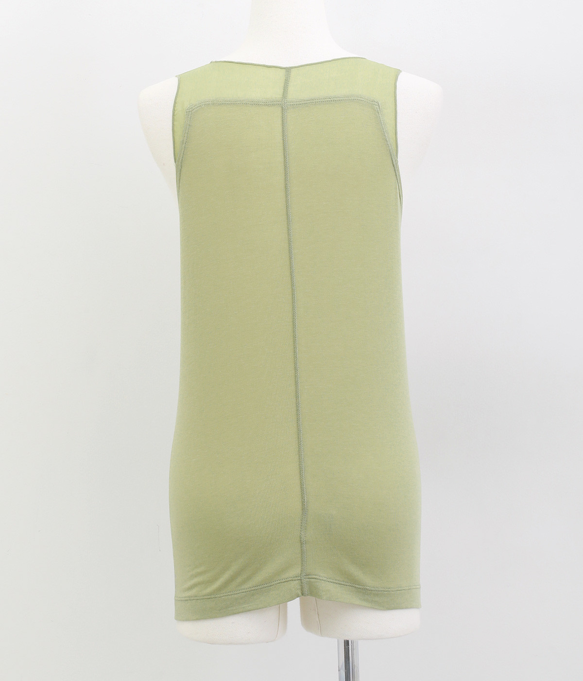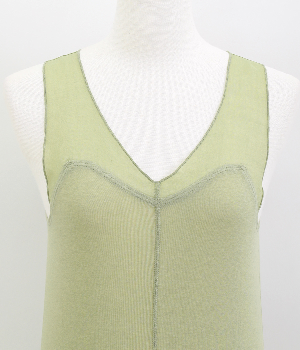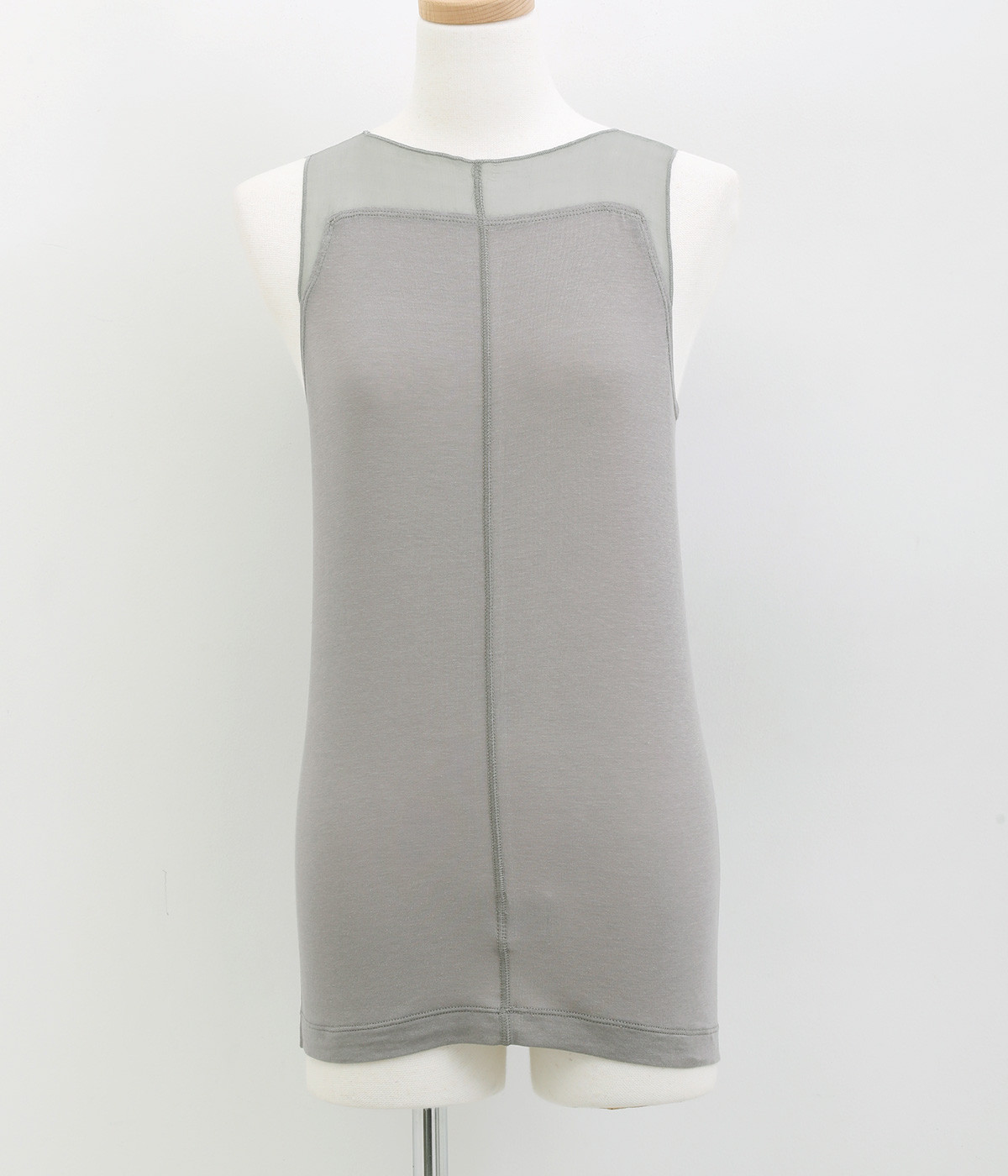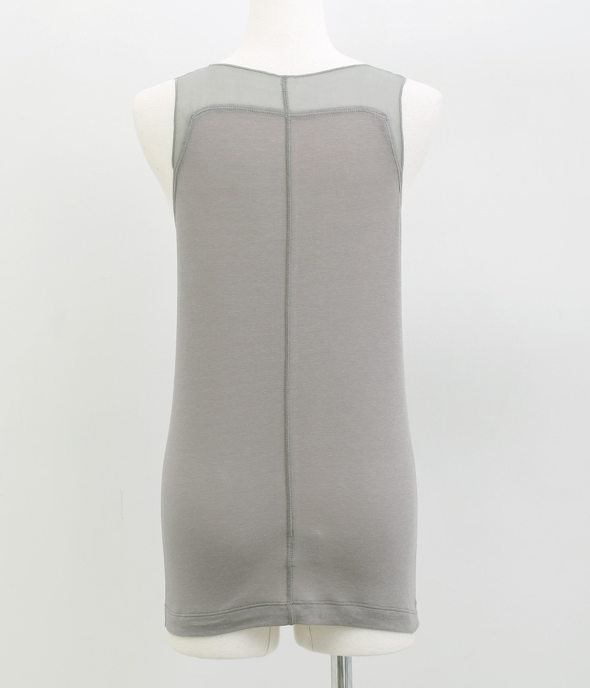 上身頃を布帛に切り替えた、異素材使いのタンクトップ。レイヤードした際にインナー見えを回避できる仕立てで、前後で襟ぐりを変えて2wayで楽しめます。襟ぐりや袖ぐりは繊細な素材とマッチするよう細いメロー仕立てにするなど、細部にもこだわりを。