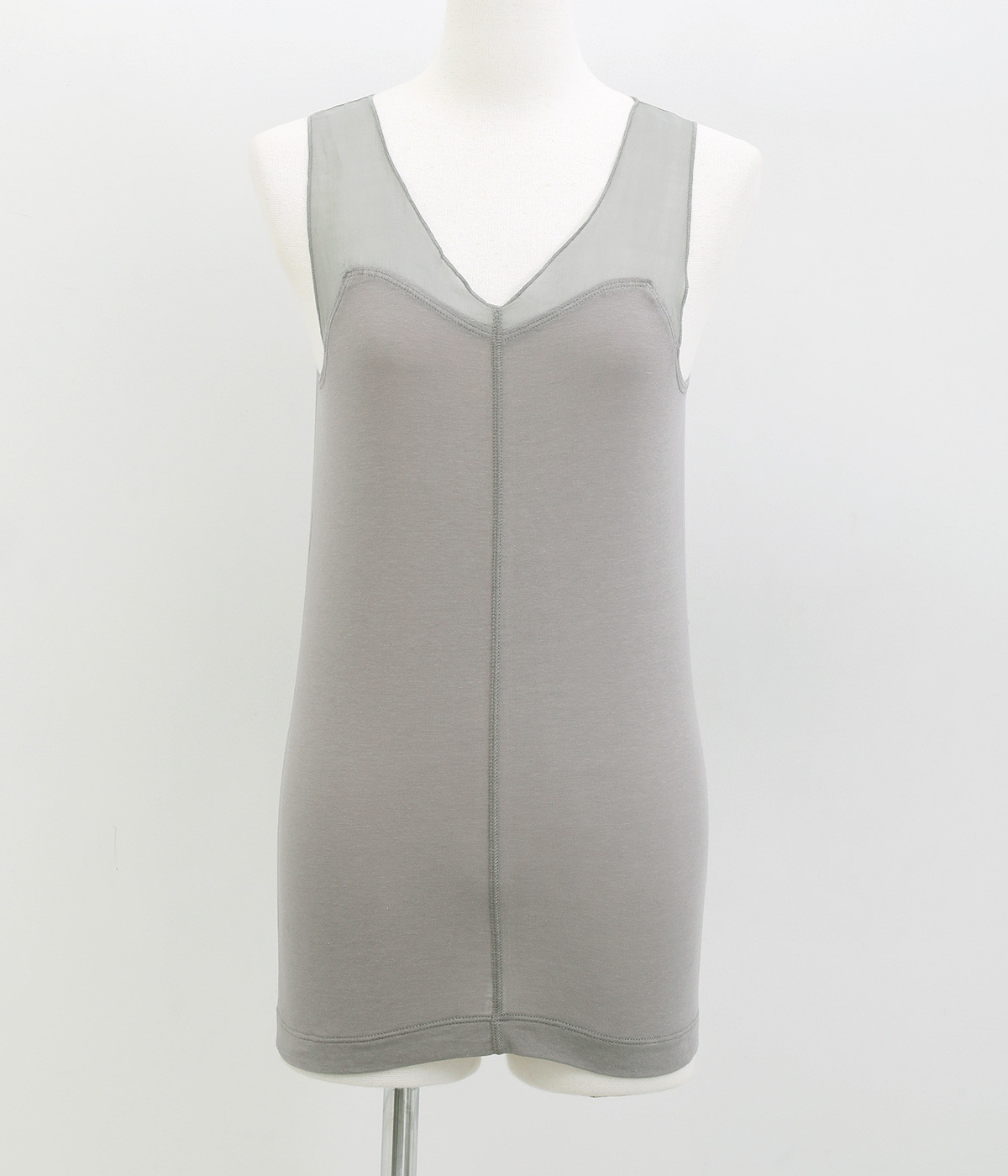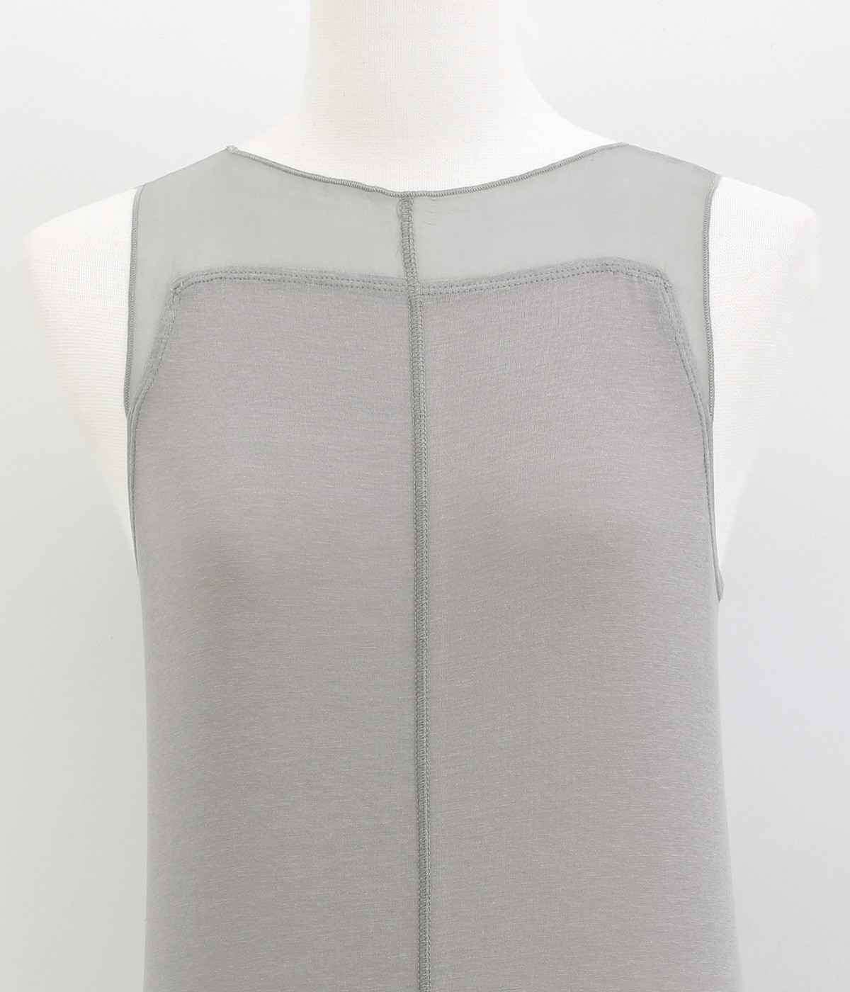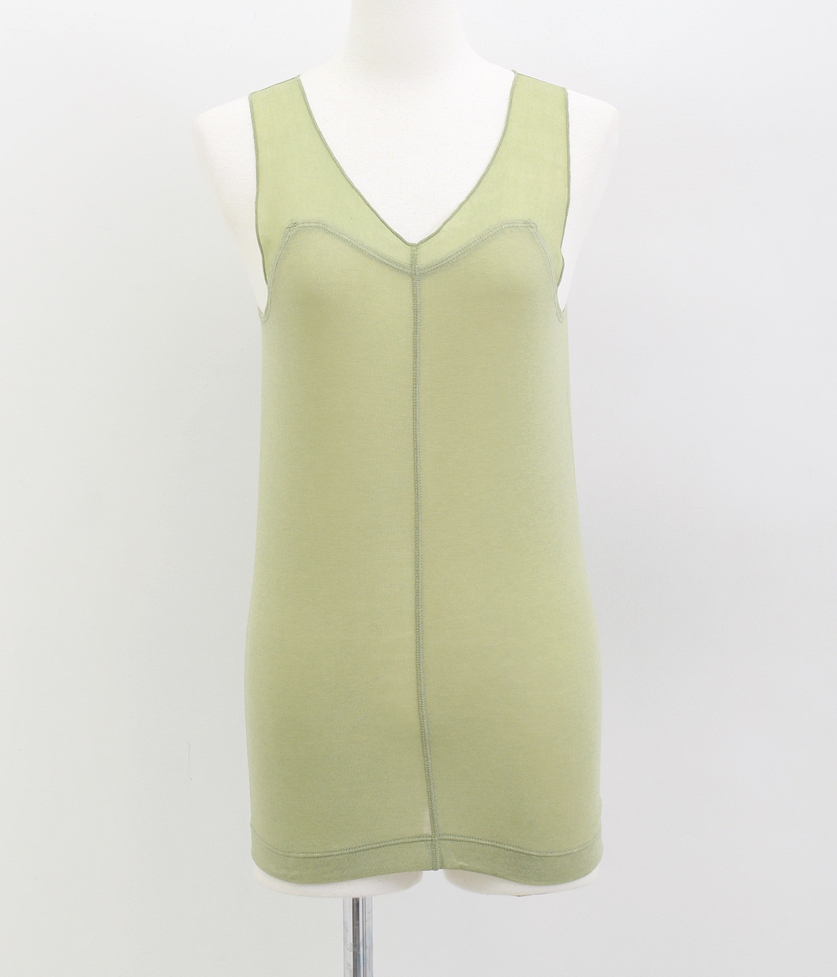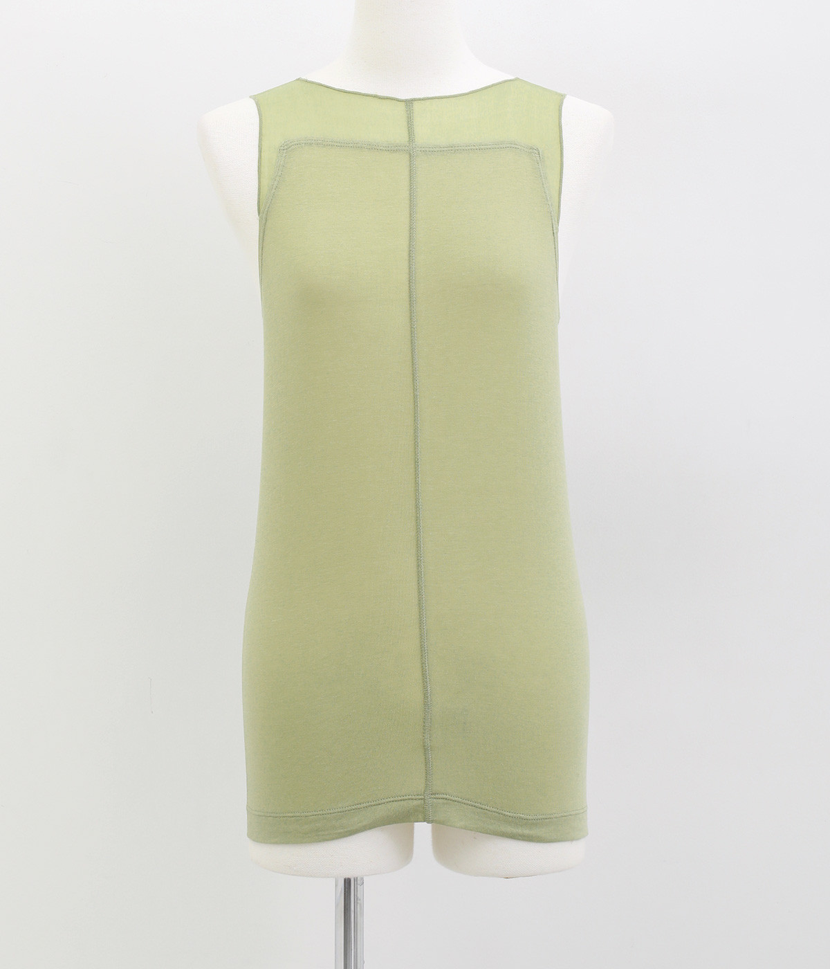 上身頃を布帛に切り替えた、異素材使いのタンクトップ。レイヤードした際にインナー見えを回避できる仕立てで、前後で襟ぐりを変えて2wayで楽しめます。襟ぐりや袖ぐりは繊細な素材とマッチするよう細いメロー仕立てにするなど、細部にもこだわりを。
