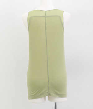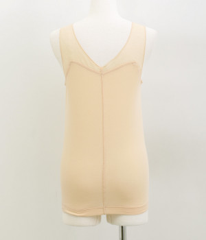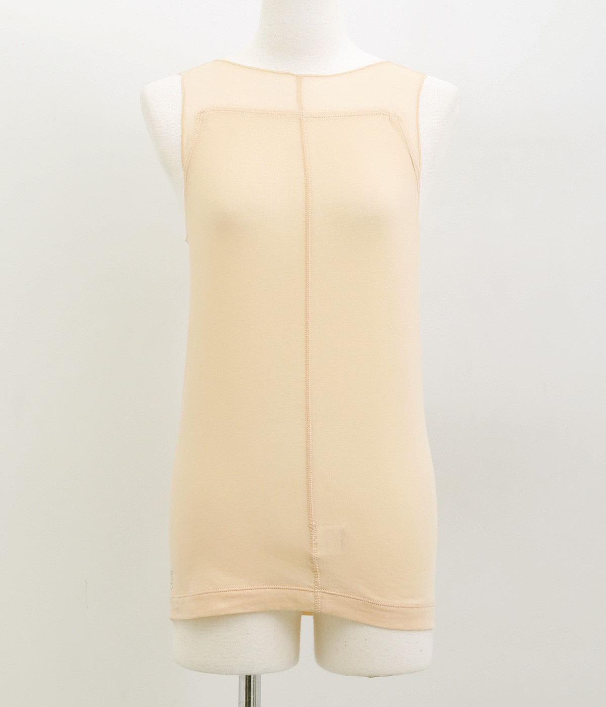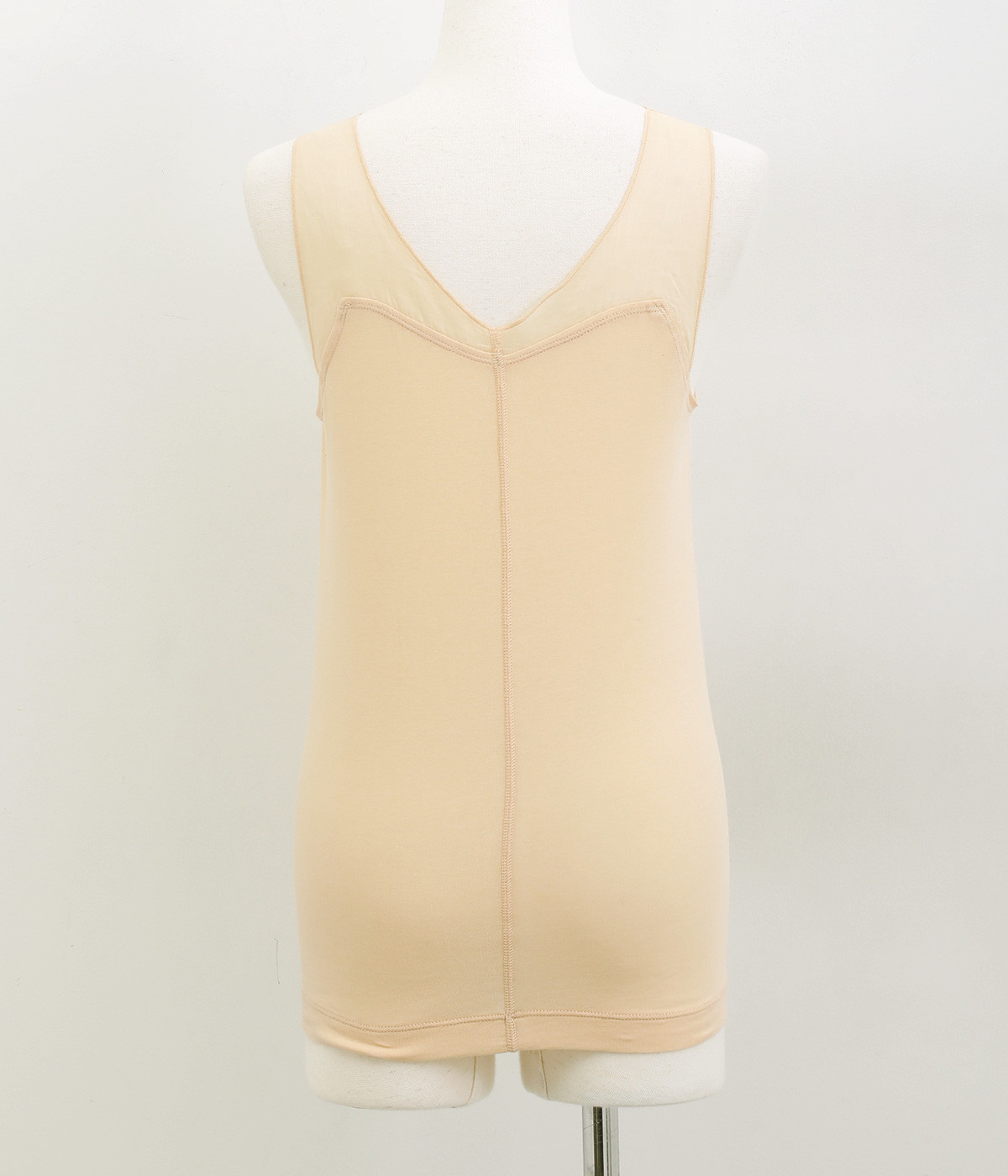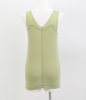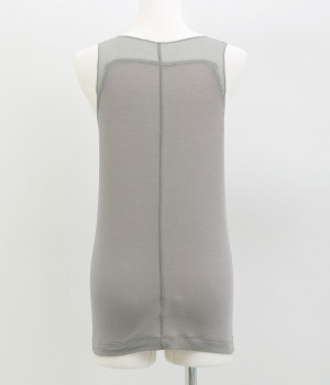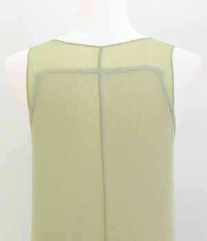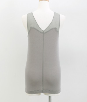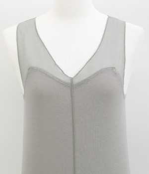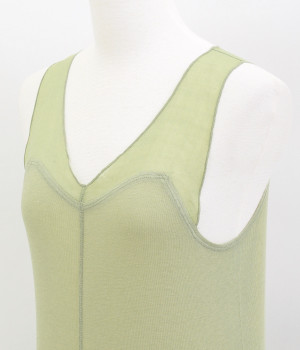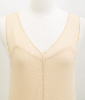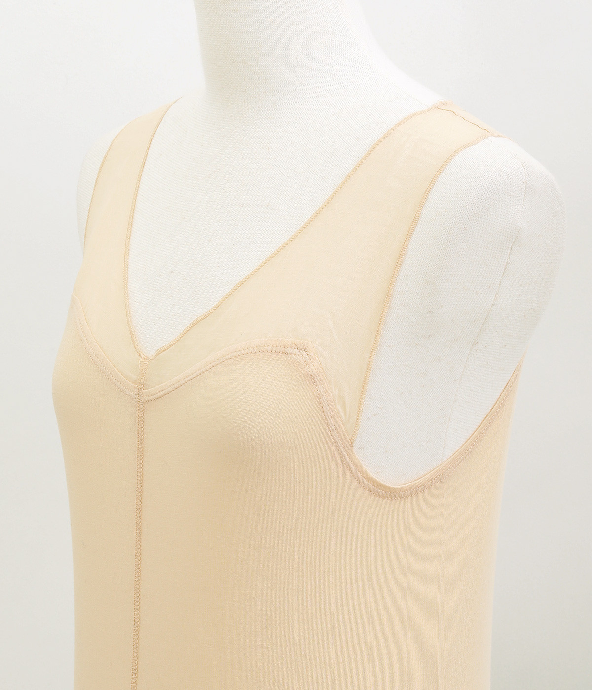 上身頃を布帛に切り替えた、異素材使いのタンクトップ。レイヤードした際にインナー見えを回避できる仕立てで、前後で襟ぐりを変えて2wayで楽しめます。襟ぐりや袖ぐりは繊細な素材とマッチするよう細いメロー仕立てにするなど、細部にもこだわりを。
