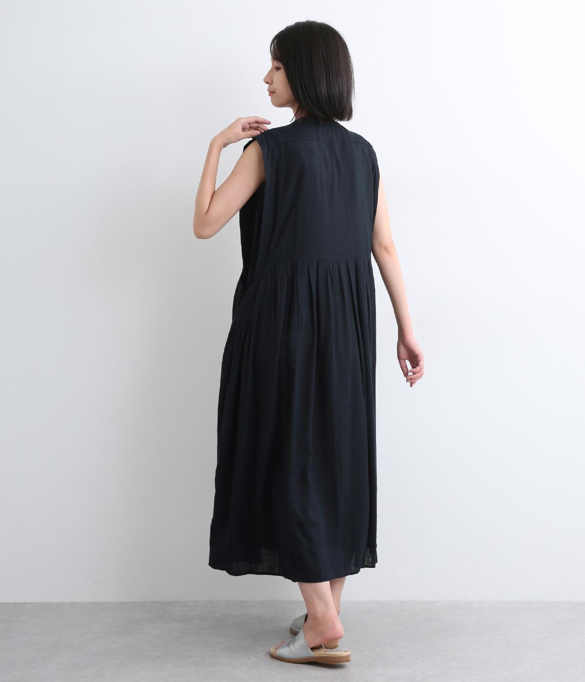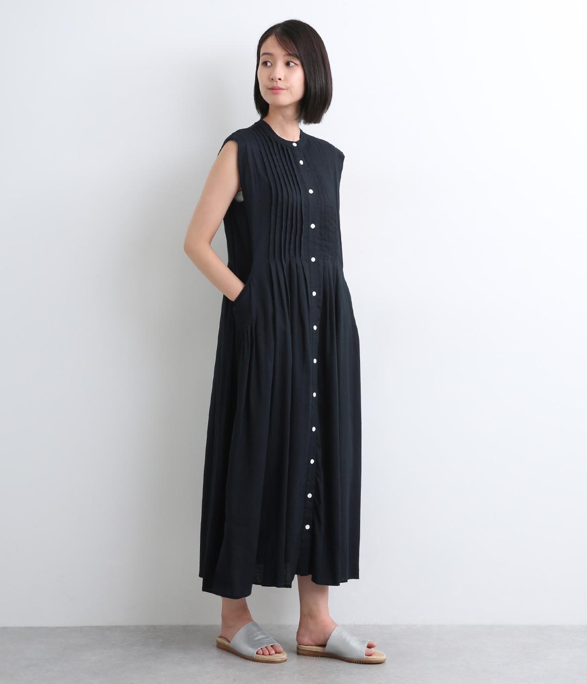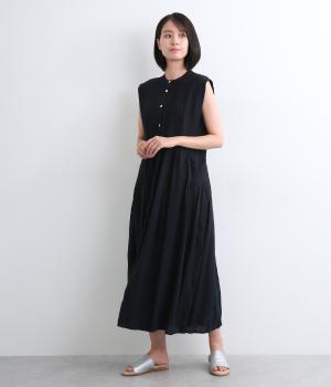 汗ばむ季節も涼しく着用できる、スリーブレスタイプのワンピースです。フロント開きなのでロングジレのように羽織るのもおすすめ。胸元のタック使いがアンティークな雰囲気を醸し出し、お洒落な雰囲気もアップ。実用性とデザイン性を両立させたポケット口のタックも注目ポイント。