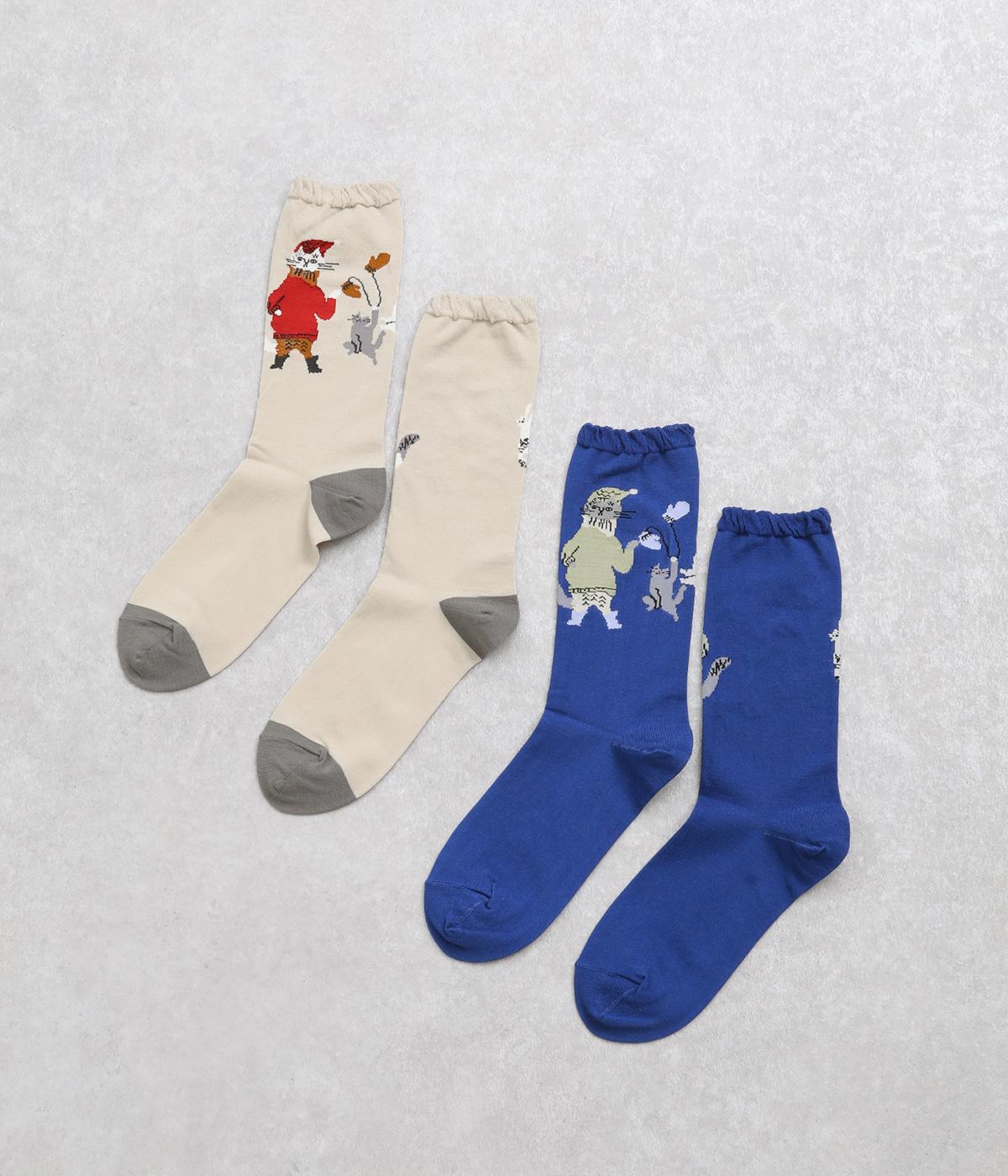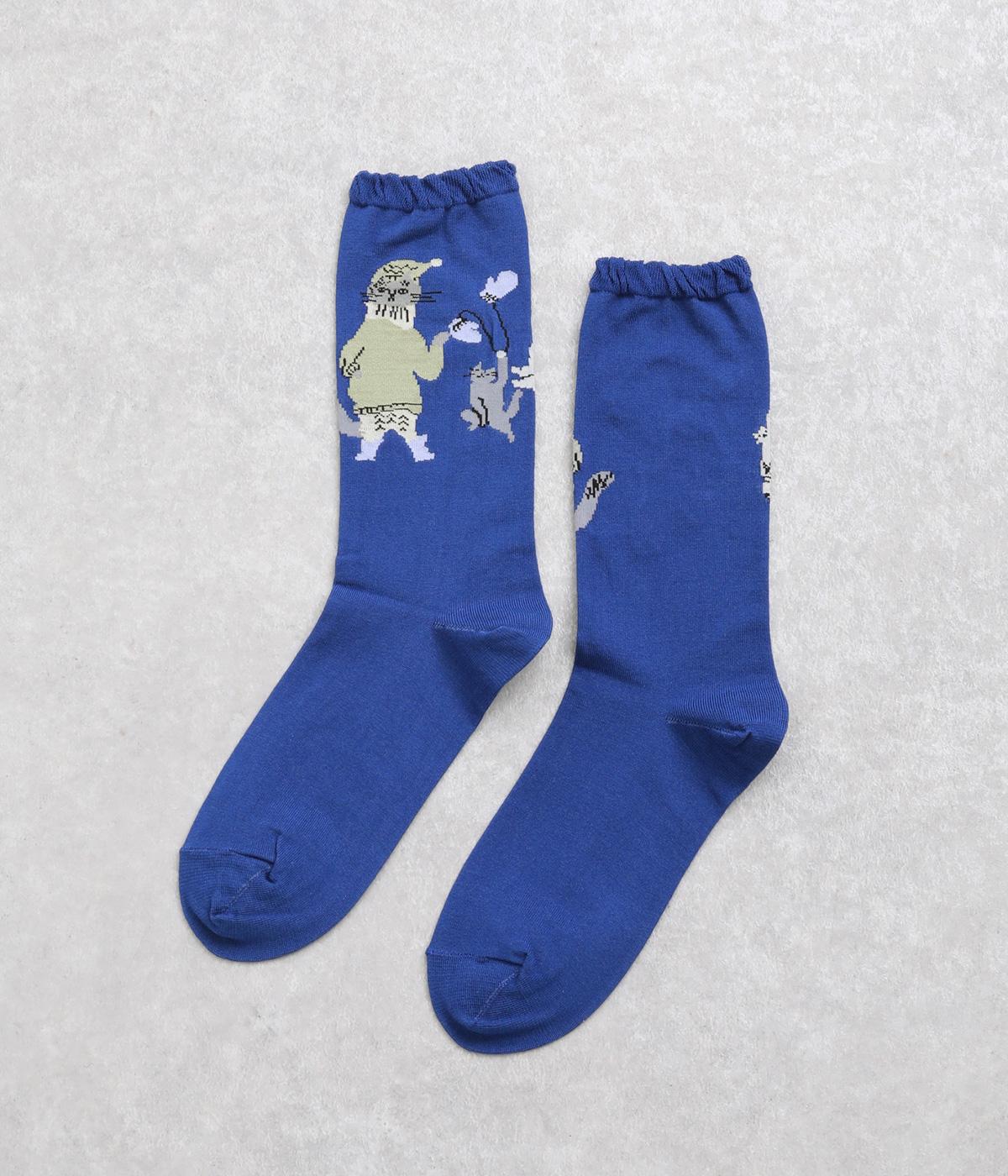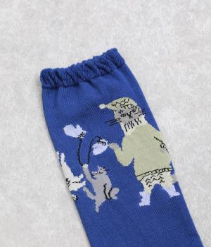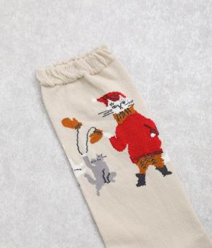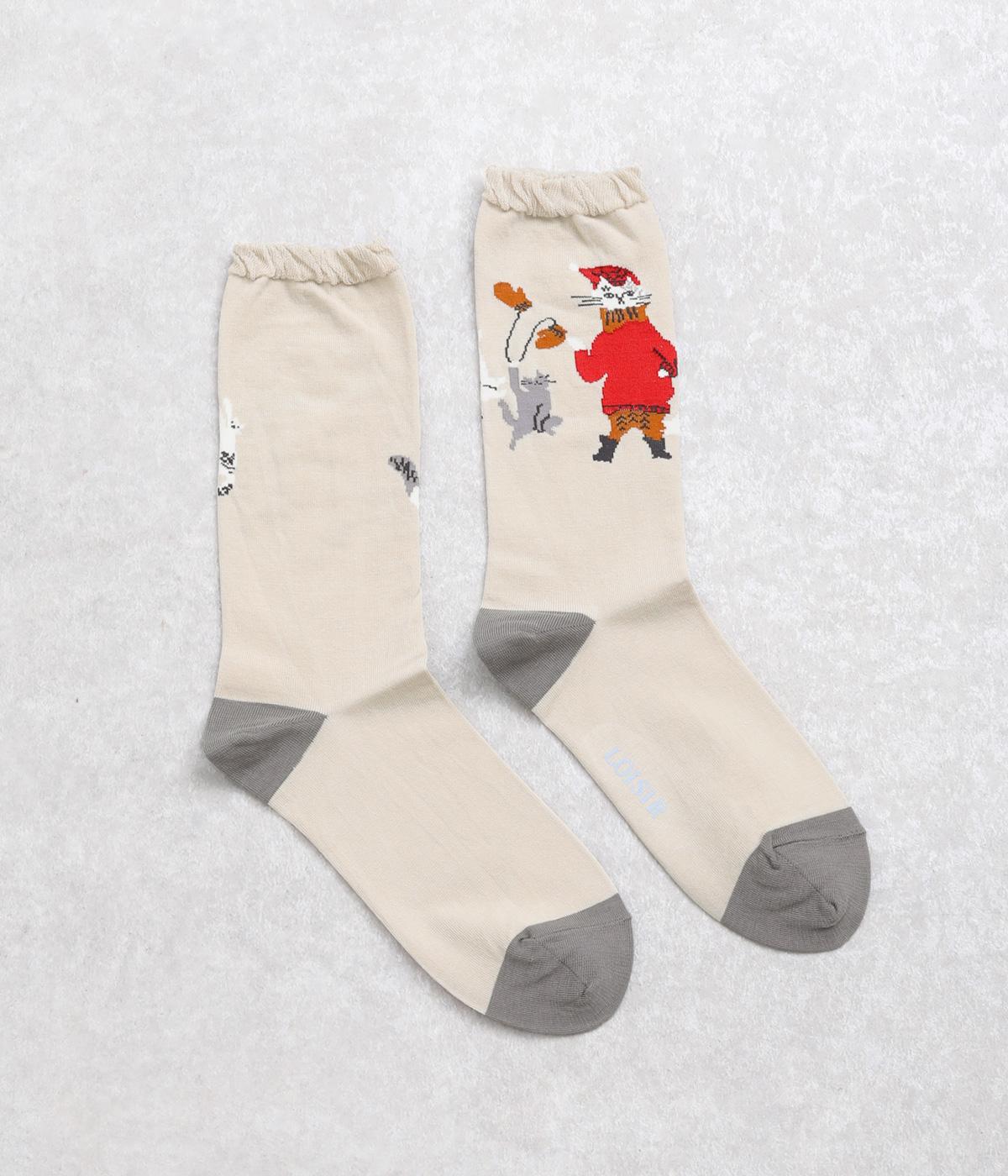 冬の空の下で遊ぶネコたちを描いた、見ているだけで心がほぐれる愛らしいデザインです。柄がサイドにくるように配置されており、歩くたびに小さな物語を感じさせます。はき口はやわらかな編み立てなので、締めつけ感が少ないのも◎。コーディネートのさりげないアクセントにおすすめの一足です。
