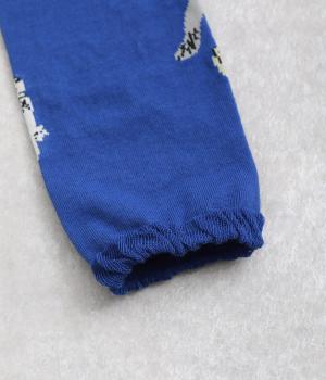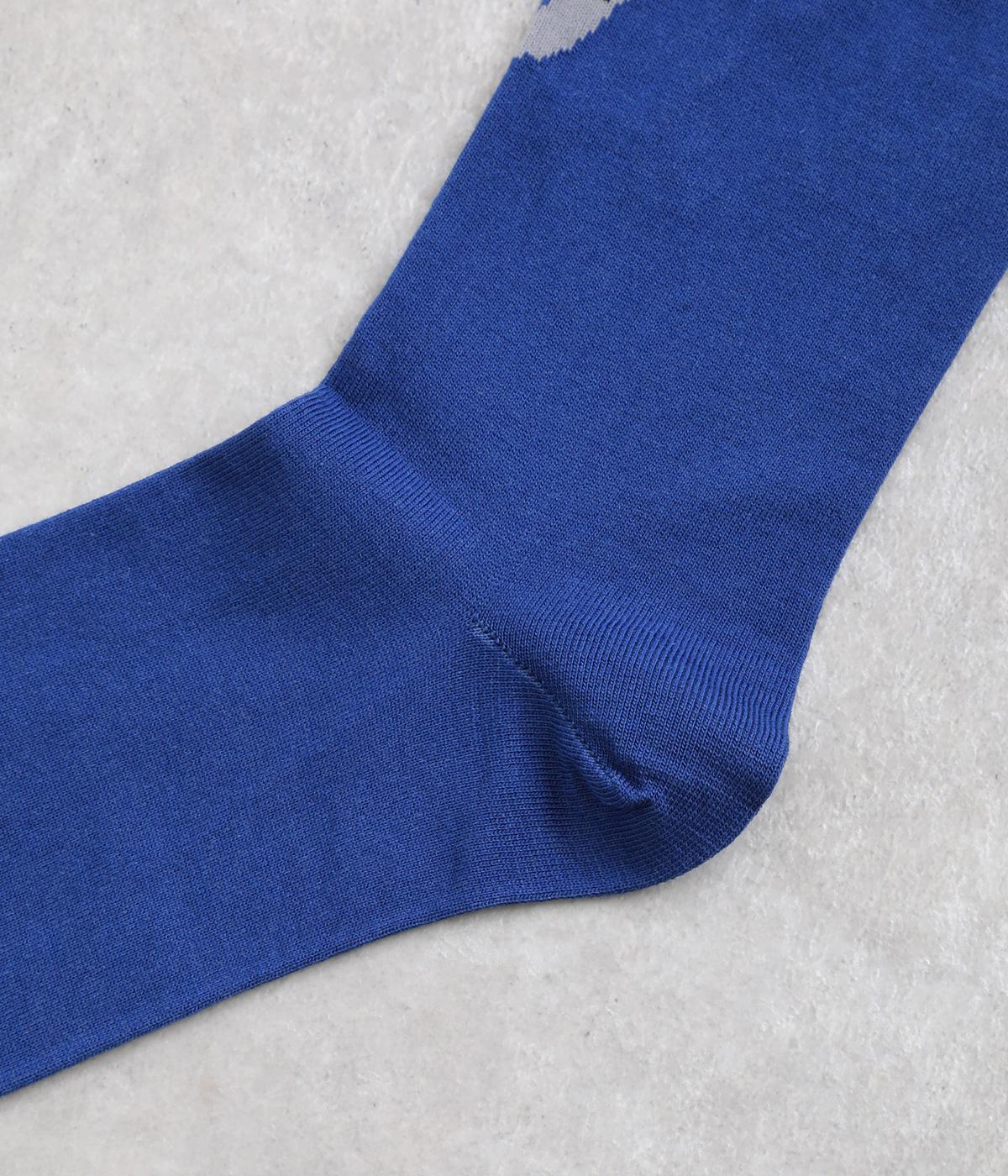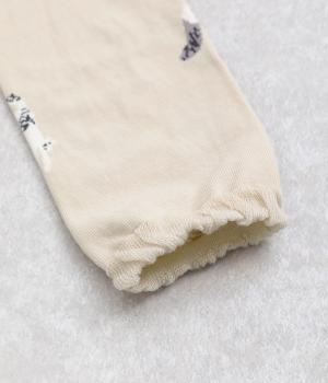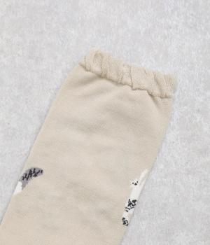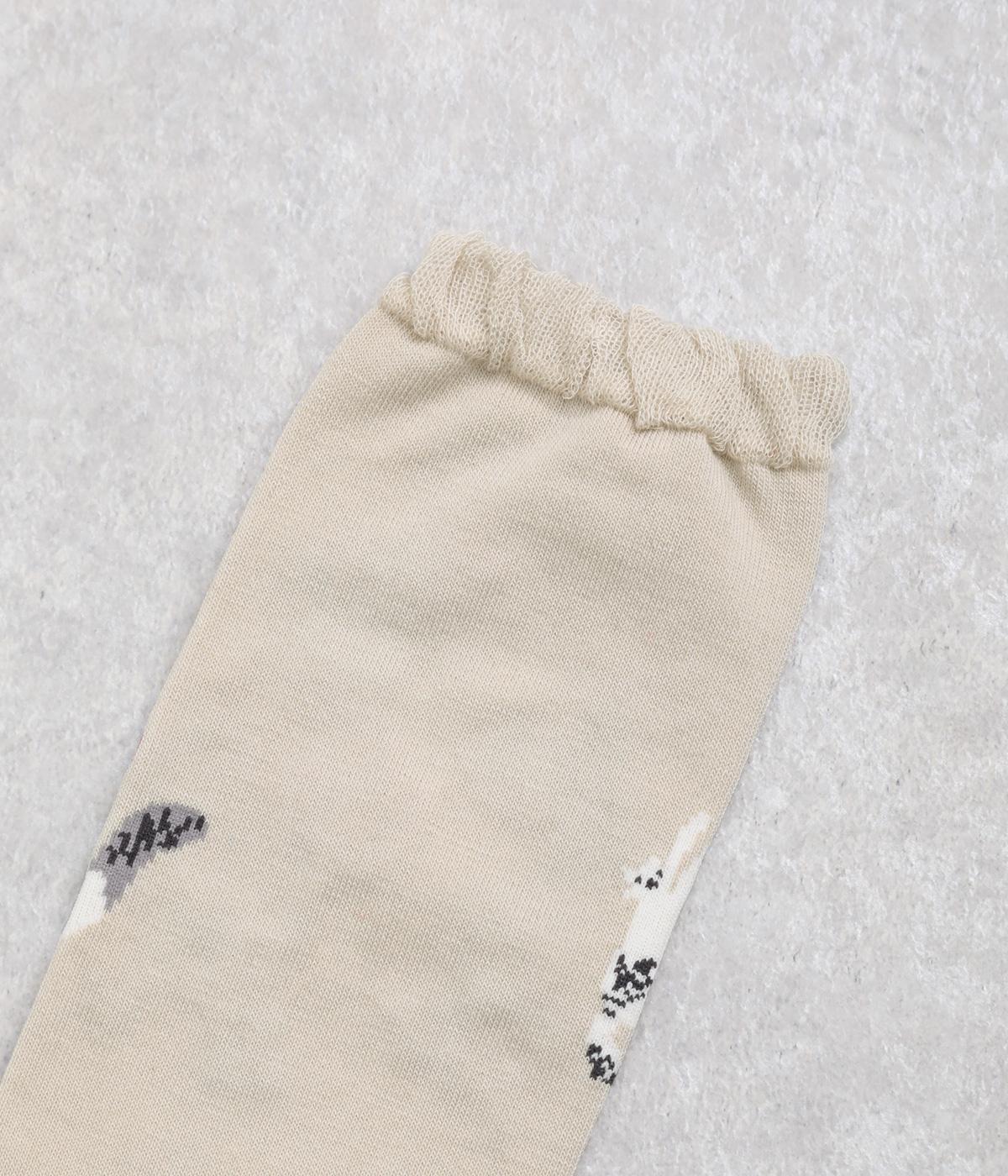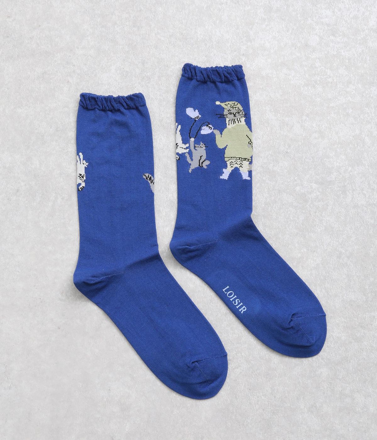 冬の空の下で遊ぶネコたちを描いた、見ているだけで心がほぐれる愛らしいデザインです。柄がサイドにくるように配置されており、歩くたびに小さな物語を感じさせます。はき口はやわらかな編み立てなので、締めつけ感が少ないのも◎。コーディネートのさりげないアクセントにおすすめの一足です。