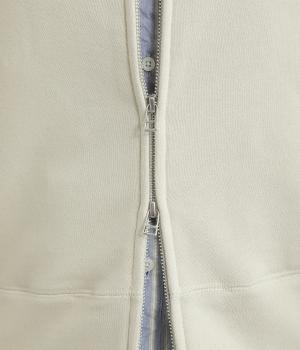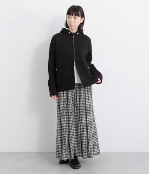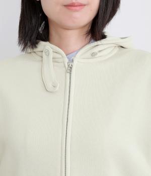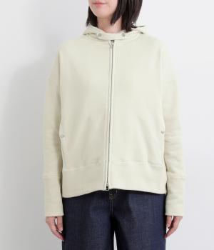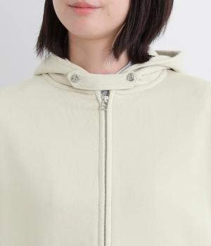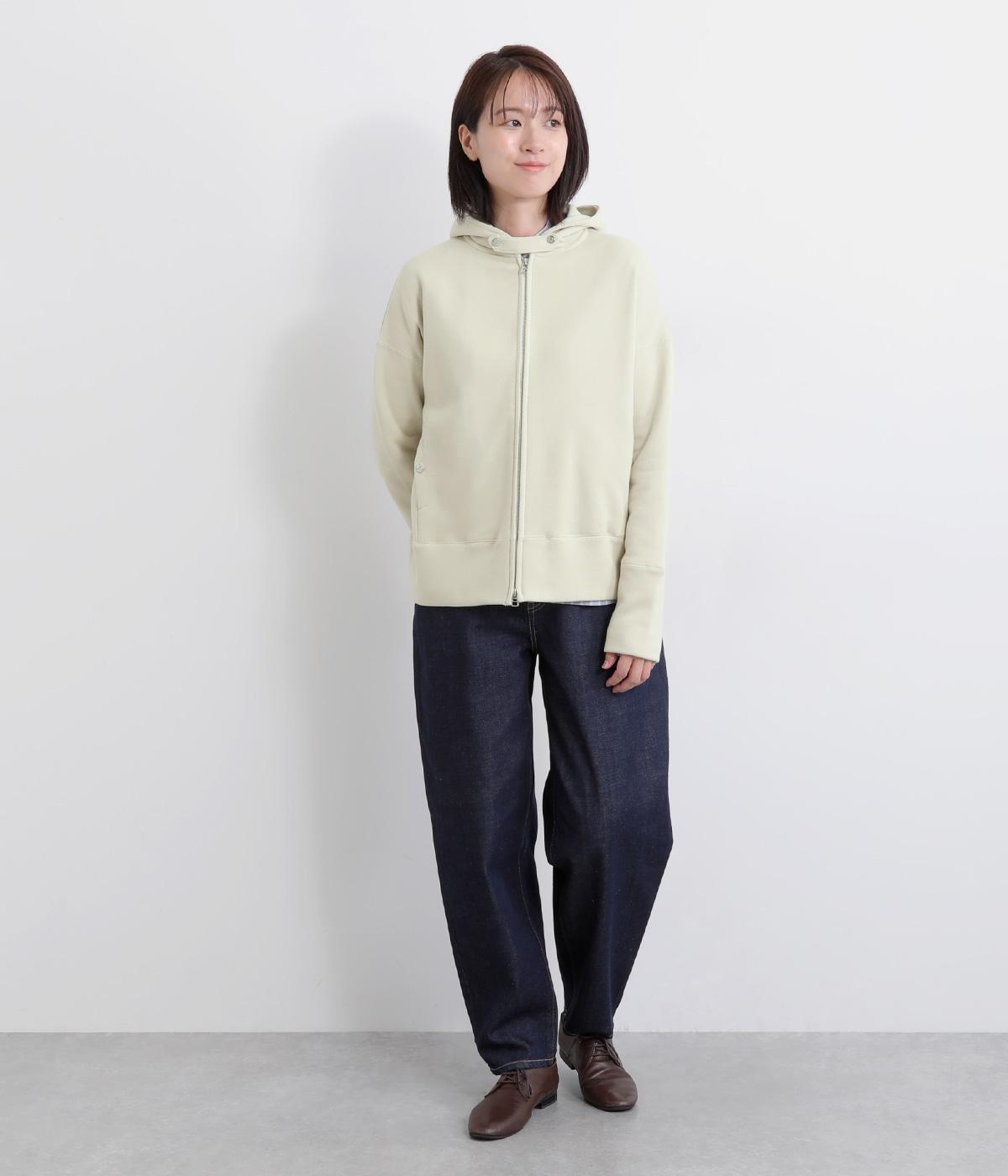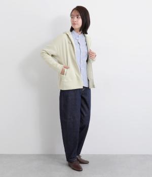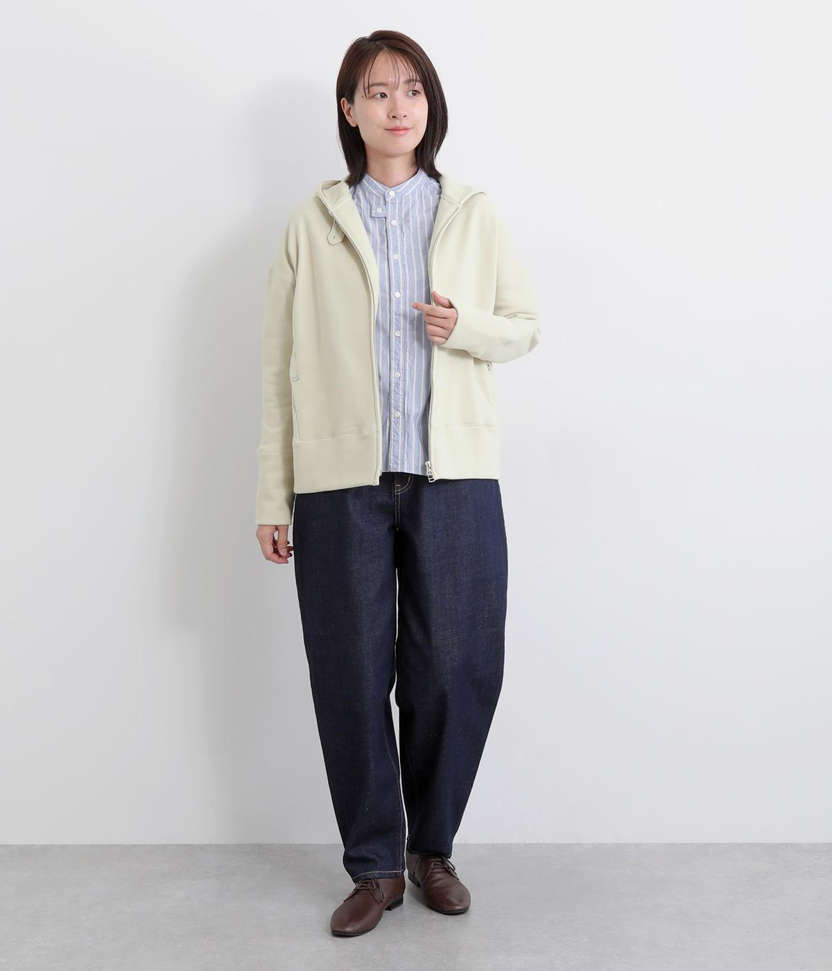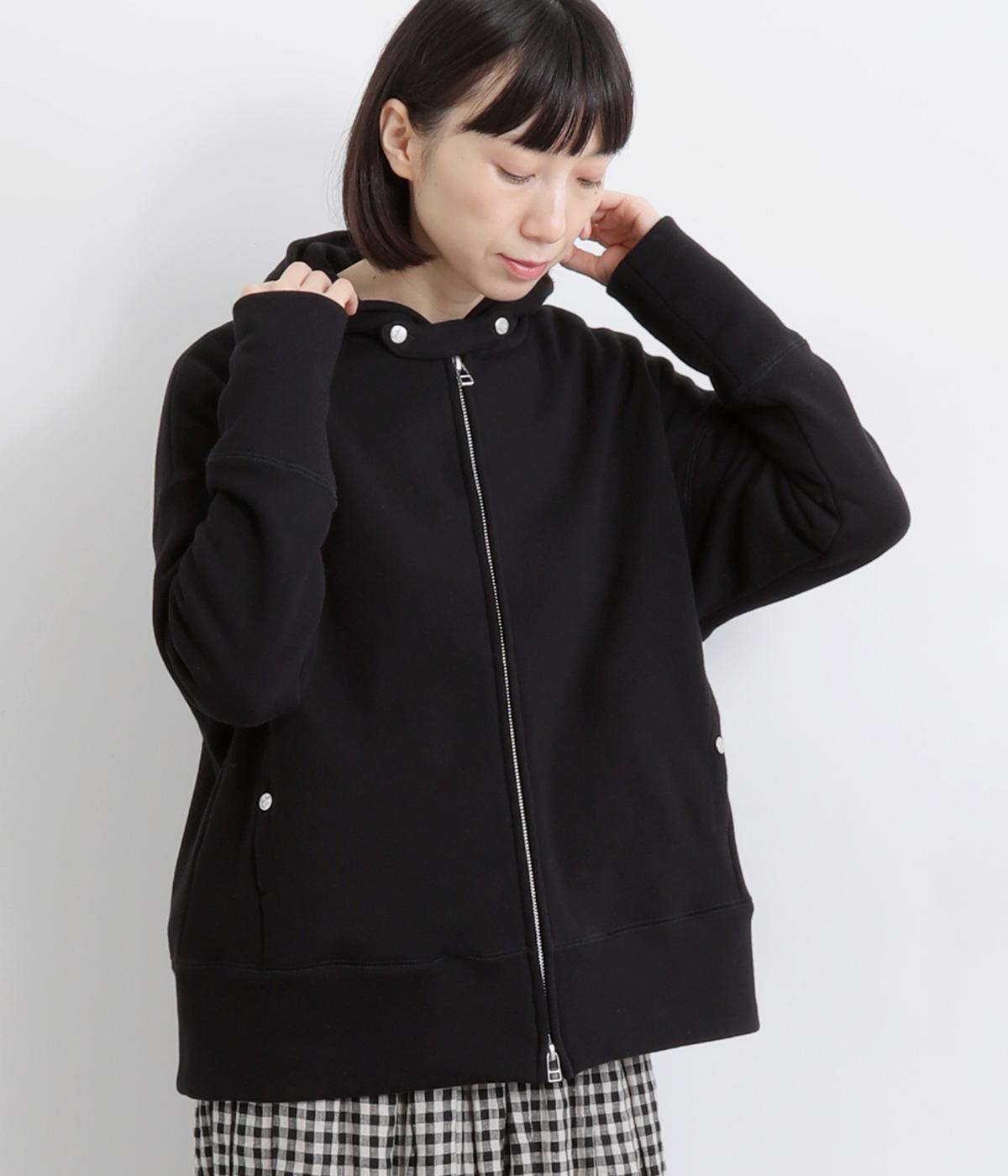 ジップタイプのフーディパーカーはラフに羽織りやすく、すっきりしたシルエットが◎。襟ぐりのベルトは風をシャットアウトするだけでなくお洒落ポイントにも。メタルボタンのアクセントがきいています。