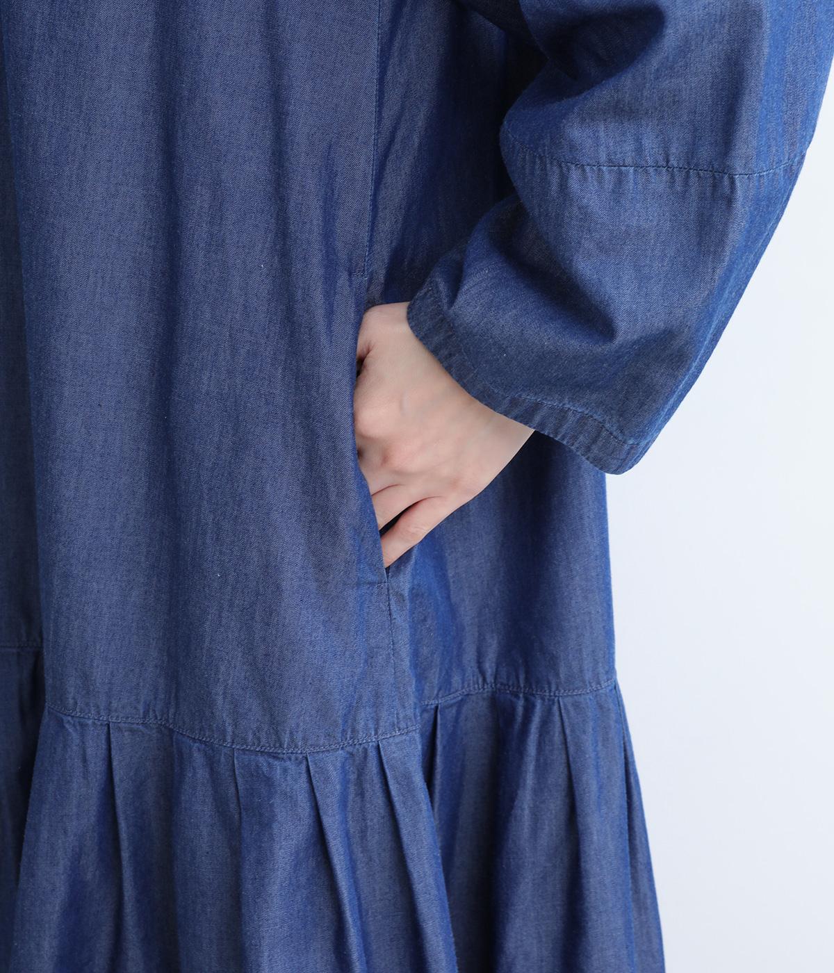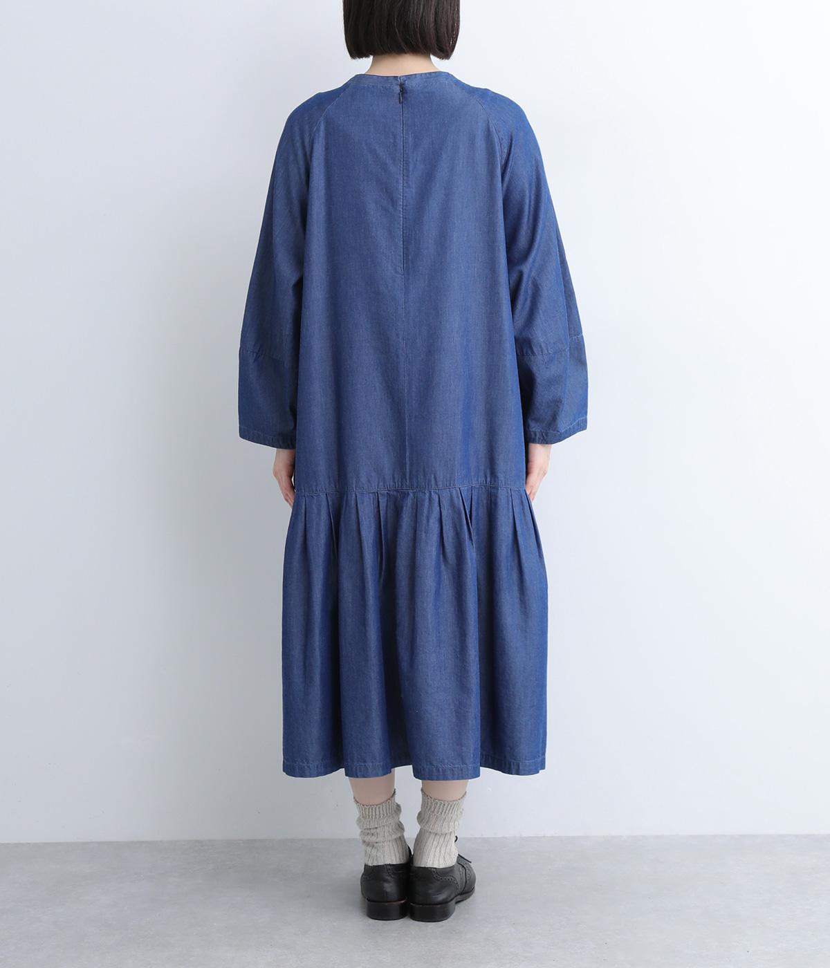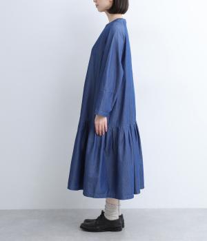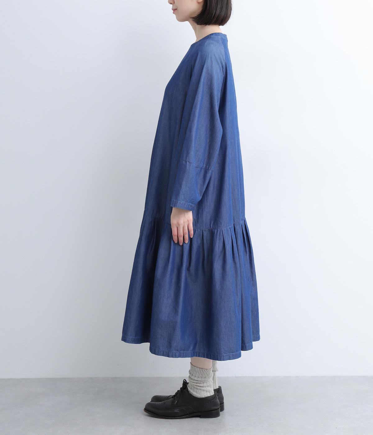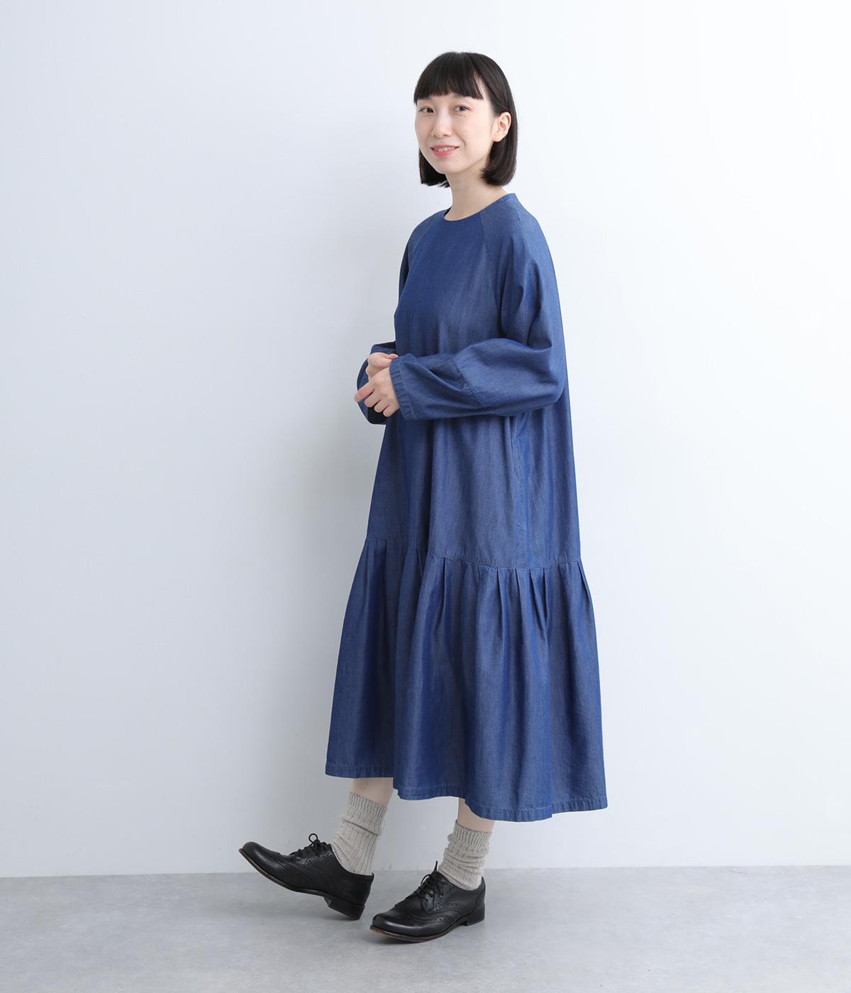 ミディ丈仕上げの軽やかさが新鮮なデニムワンピース。身頃下で切り替えたティアードデザインで軽快な印象に仕上げています。後ろ襟を高くしたクラシックなクルーネックに、ふんわりやさしいランタン袖が◎。カジュアルに着まわしやすい一枚です。