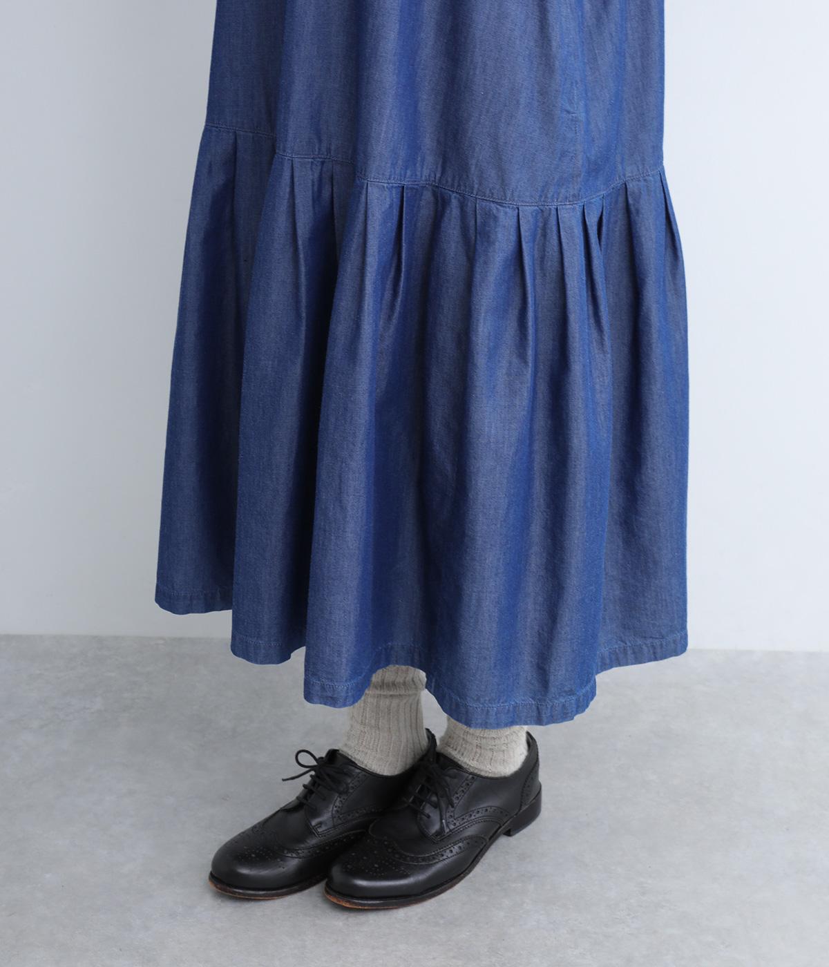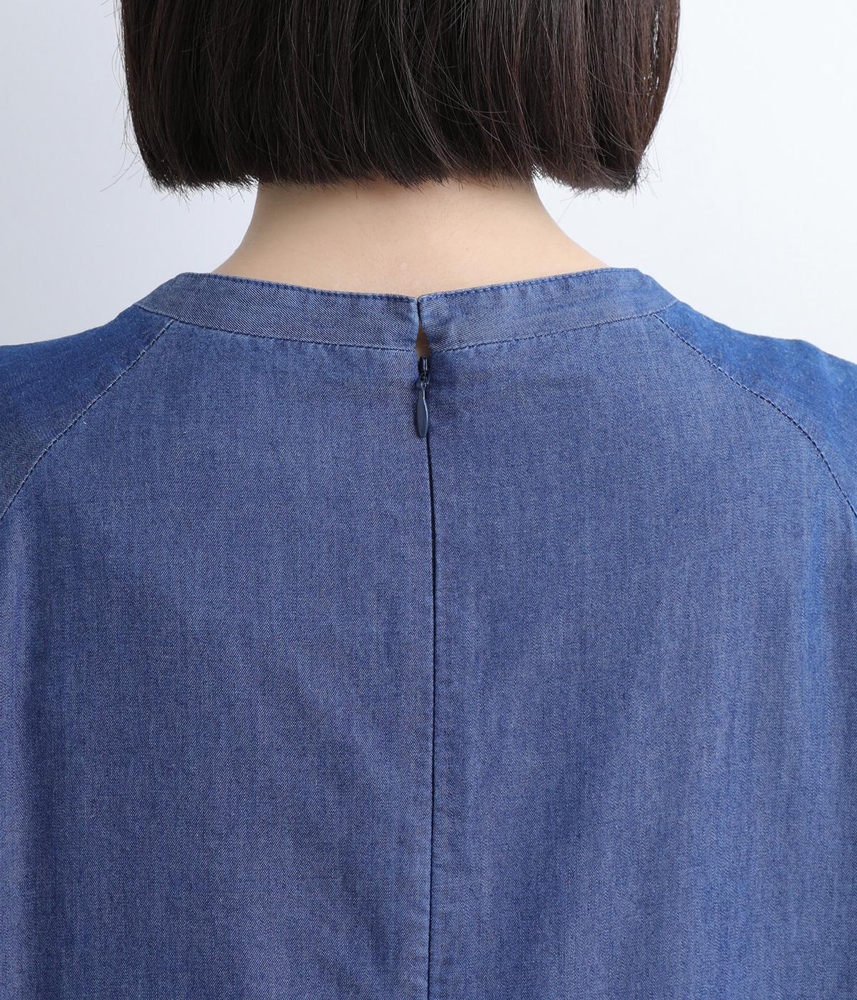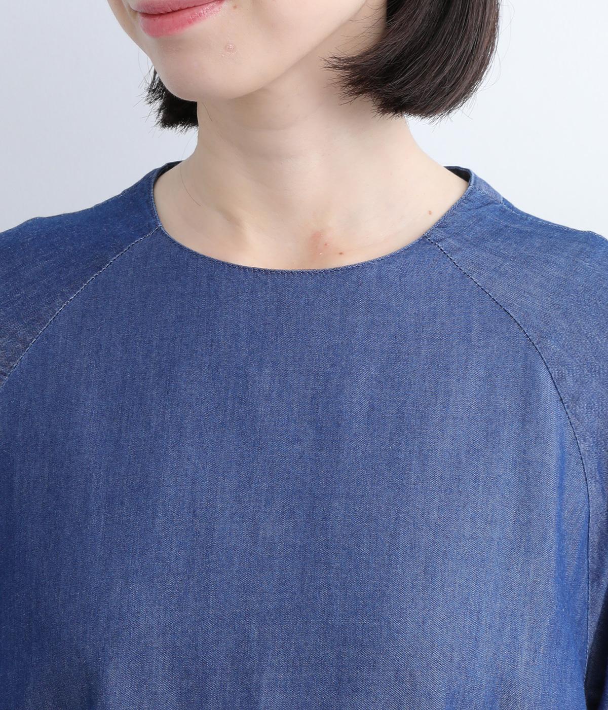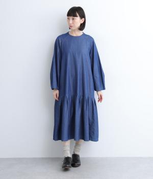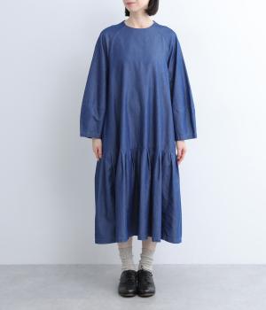 ミディ丈仕上げの軽やかさが新鮮なデニムワンピース。身頃下で切り替えたティアードデザインで軽快な印象に仕上げています。後ろ襟を高くしたクラシックなクルーネックに、ふんわりやさしいランタン袖が◎。カジュアルに着まわしやすい一枚です。