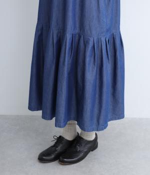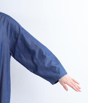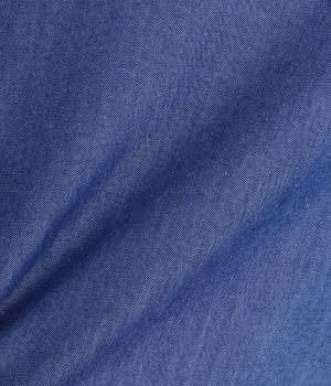 コットンと再生繊維を混紡した糸で仕立てたライトデニム。経糸はインディゴ染め、緯糸は白色の糸を使用した、軽くてやわらかな風合いと、上品な光沢感が特徴です。風になびく様子が優雅な印相に。