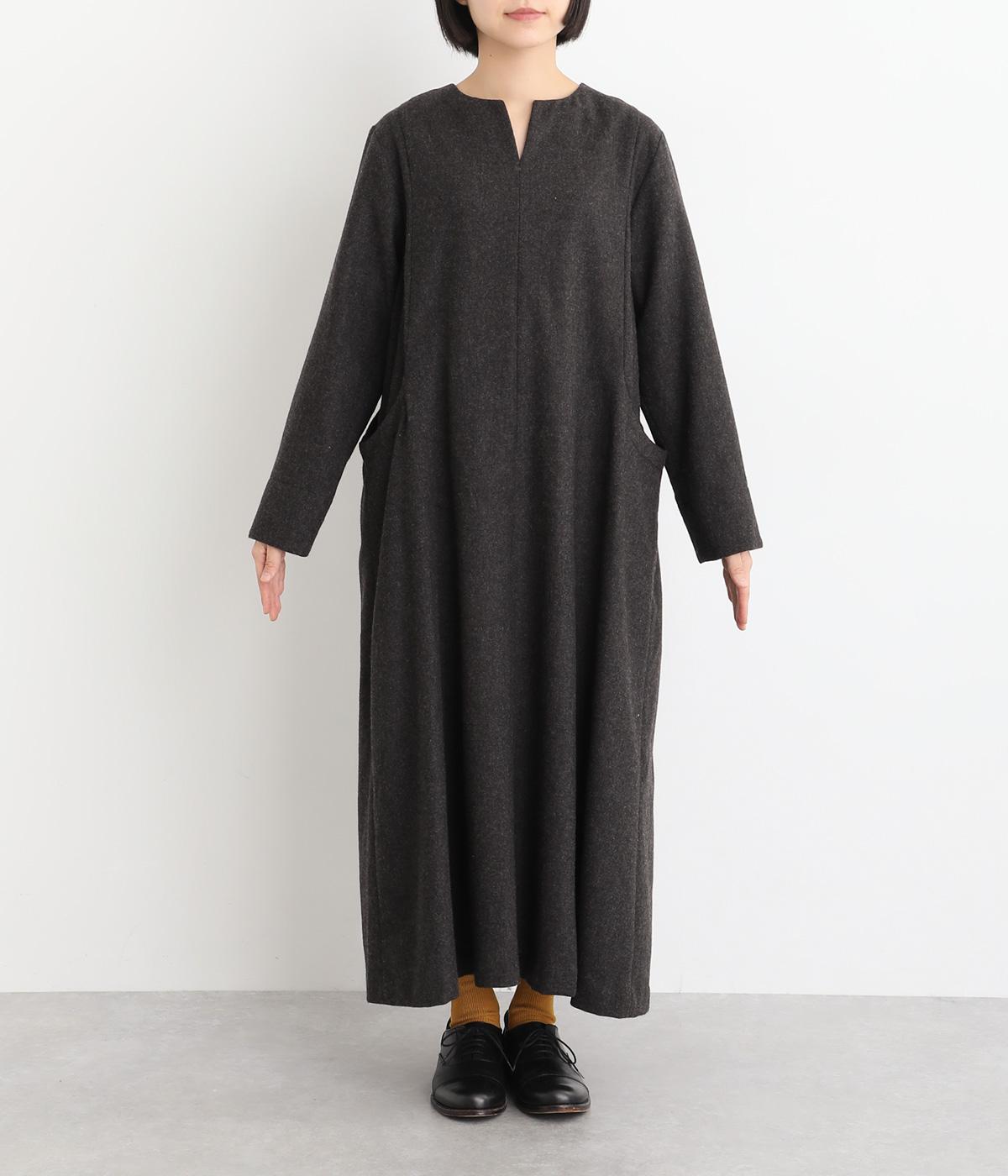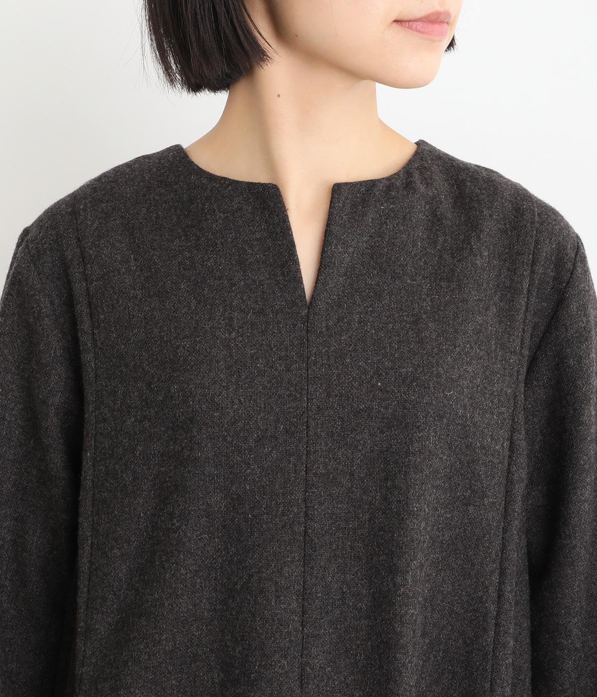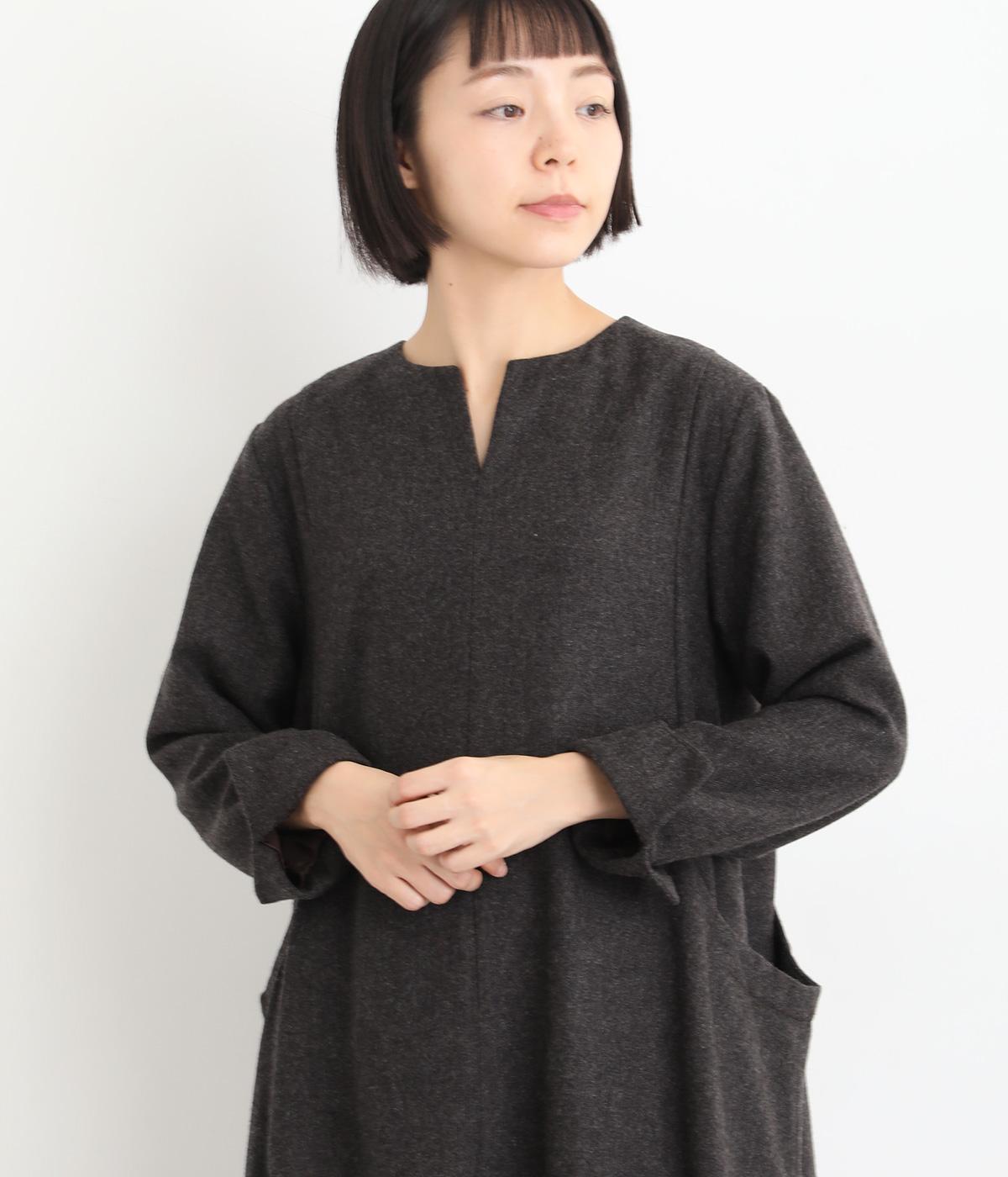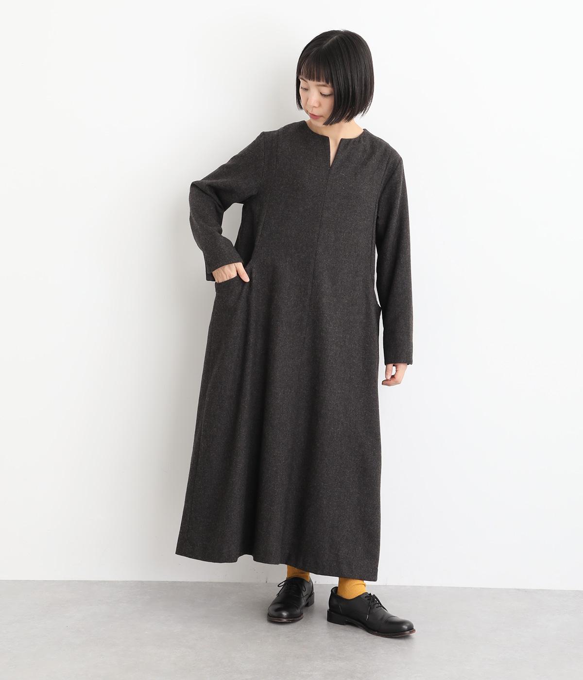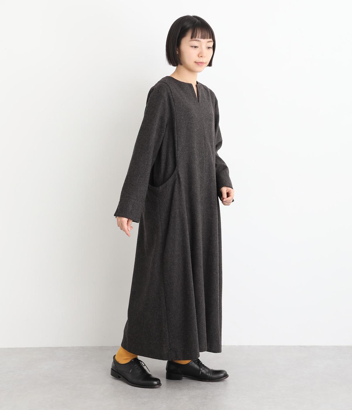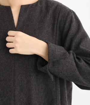 首元を上品に見せるキーネックに、ゆるやかなAラインを合わせた、シンプルながらも存在感のあるワンピースです。袖はセットインで端正に仕上げ、袖口のスリットによって折り返しアレンジもたのしめます。ポケット位置に切り替えを入れることで立体感を持たせ、洗練された印象に。