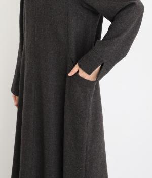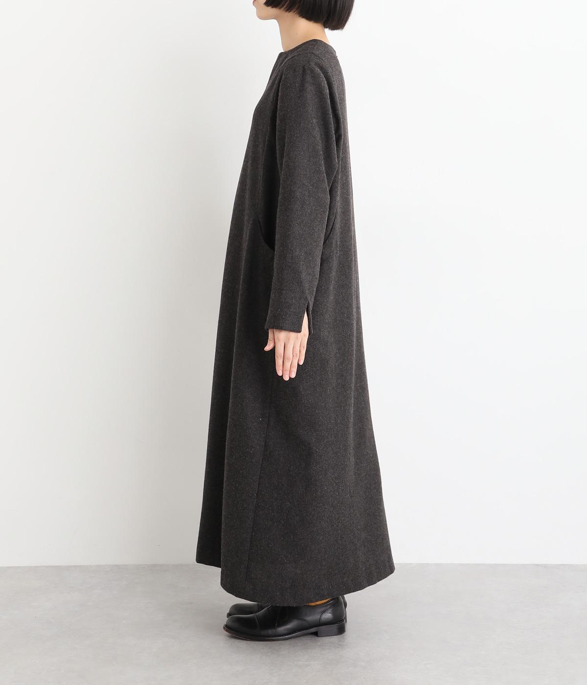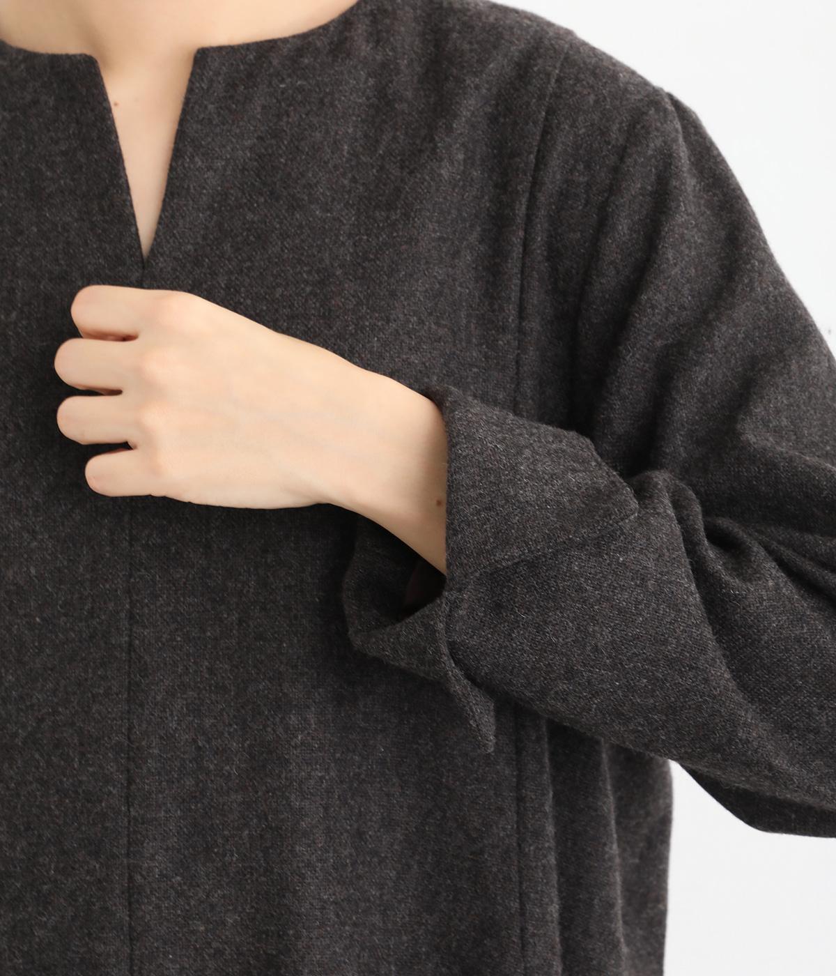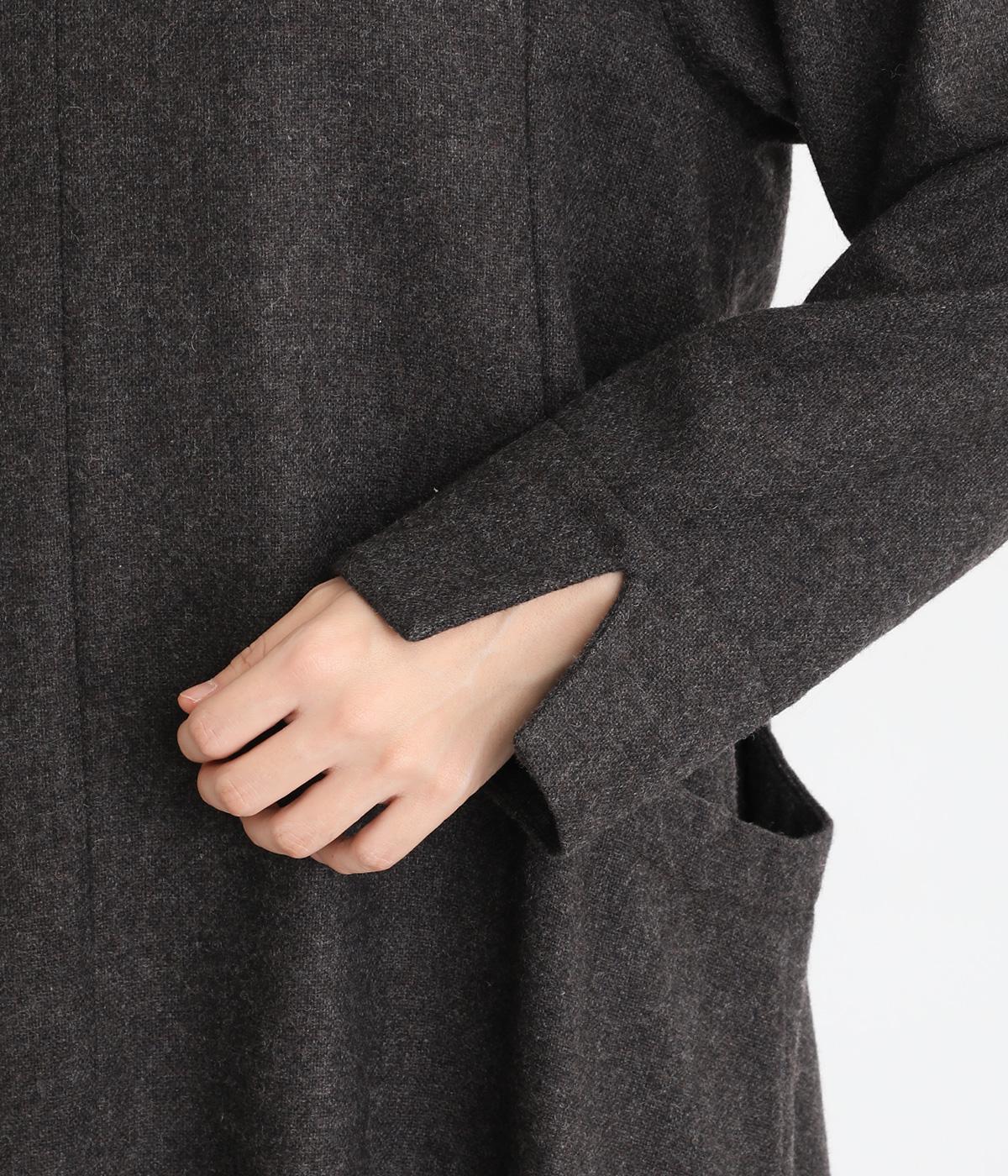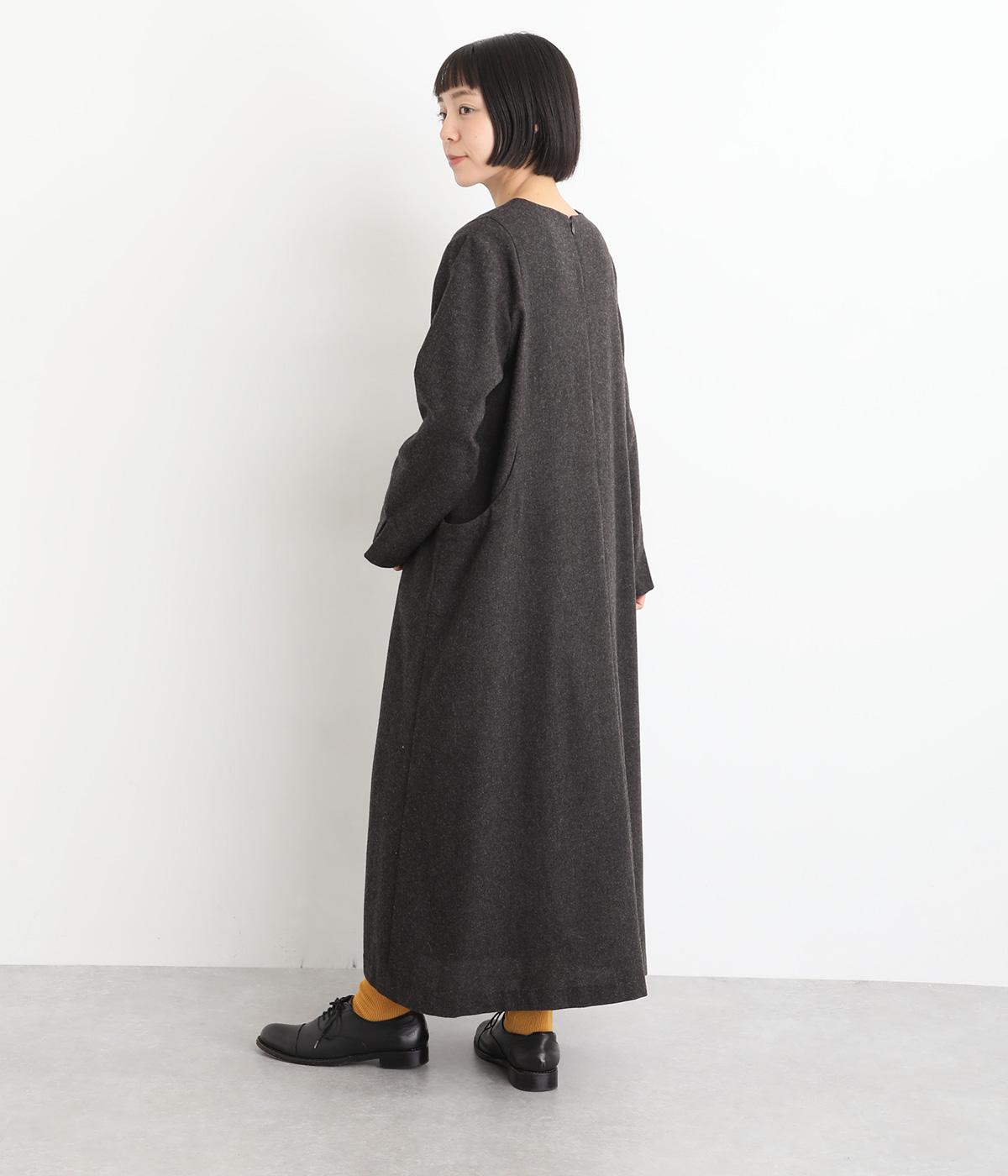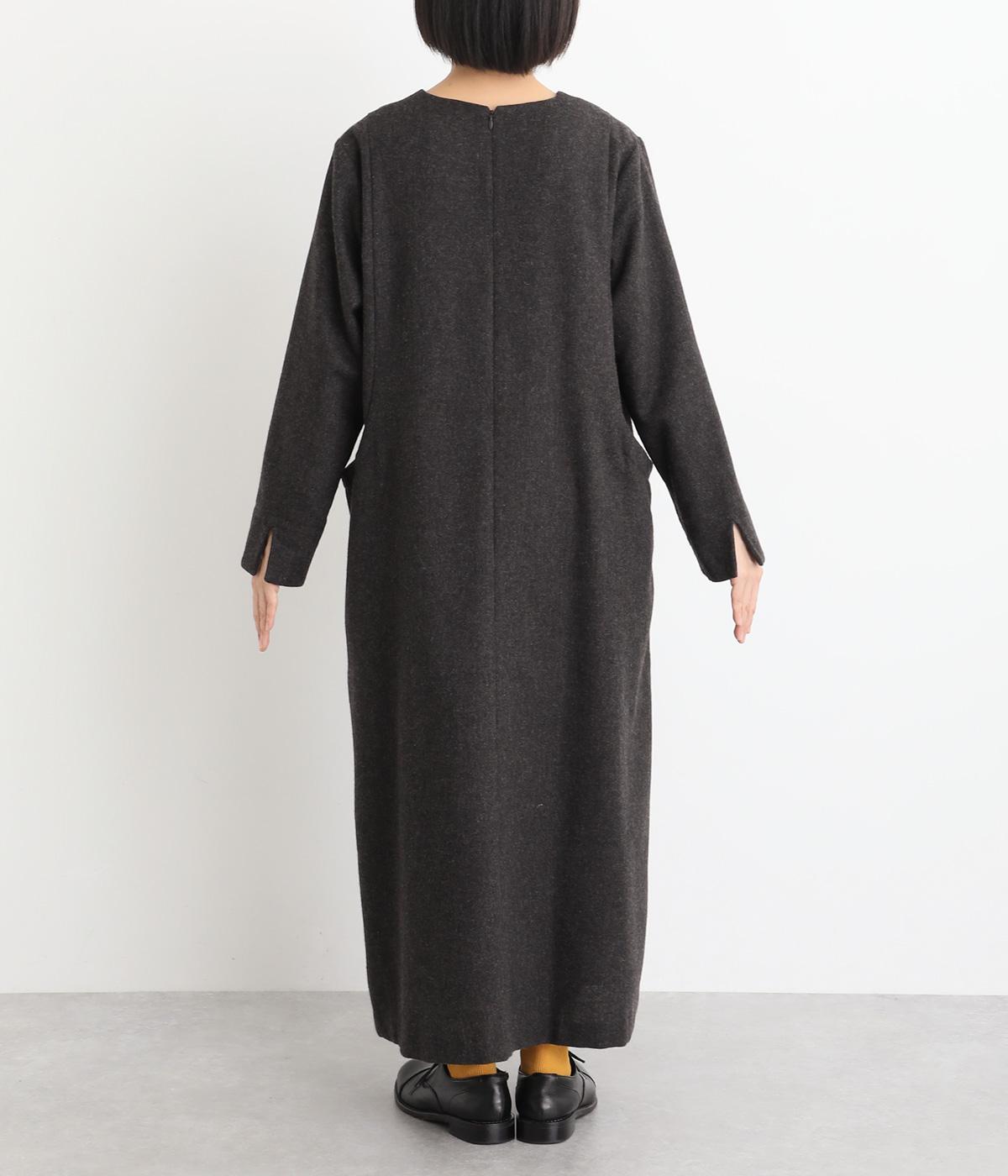 首元を上品に見せるキーネックに、ゆるやかなAラインを合わせた、シンプルながらも存在感のあるワンピースです。袖はセットインで端正に仕上げ、袖口のスリットによって折り返しアレンジもたのしめます。ポケット位置に切り替えを入れることで立体感を持たせ、洗練された印象に。