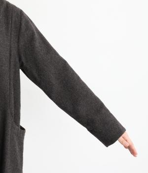 リサイクルウールを使用した、紡毛エターミン素材で仕立てました。ざっくりと甘く織られたカジュアルな表面感が、ゆたかな表情をつくります。空気をふくんだようなふくらみと、紡毛特有のぬくもりを感じるやさしい風合いが魅力です。