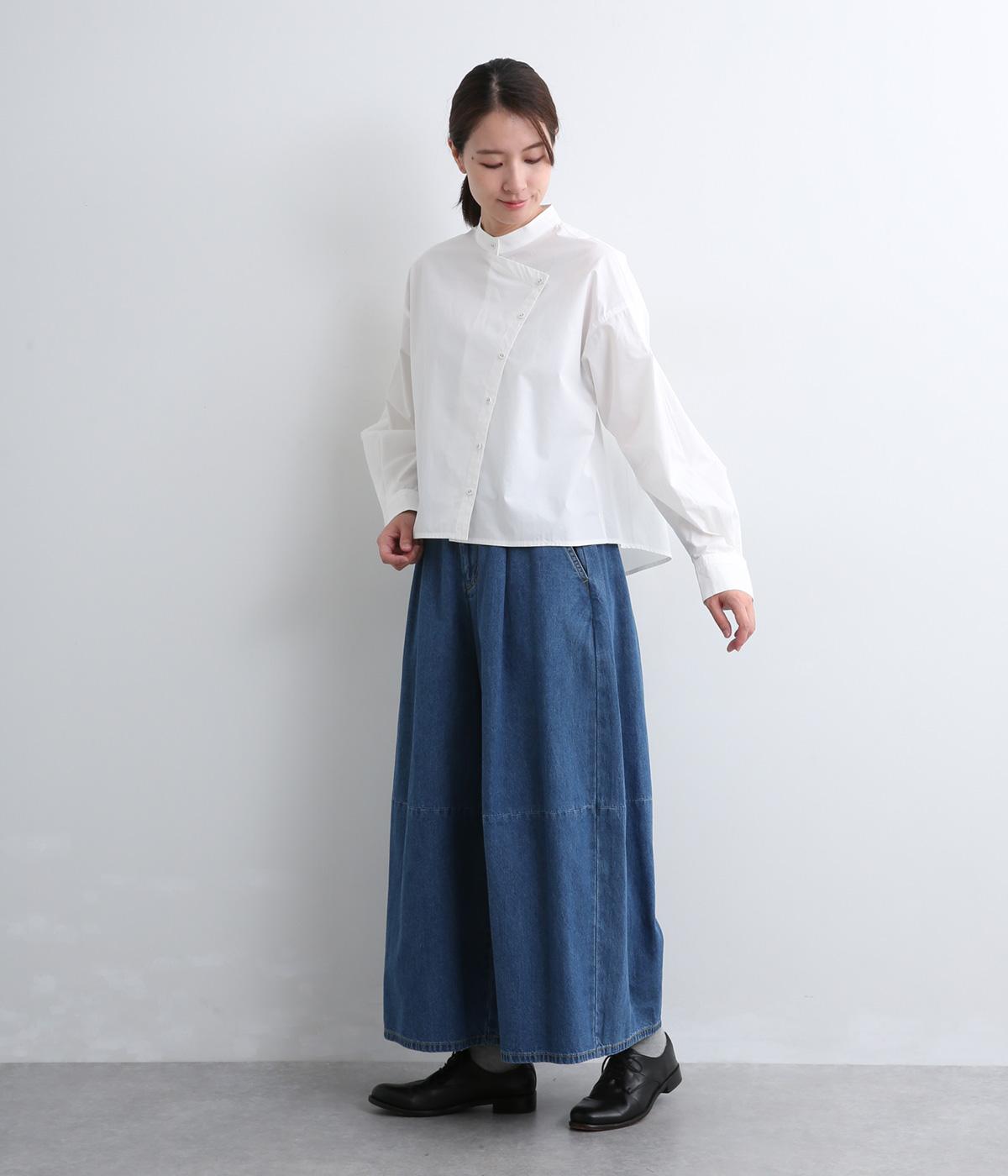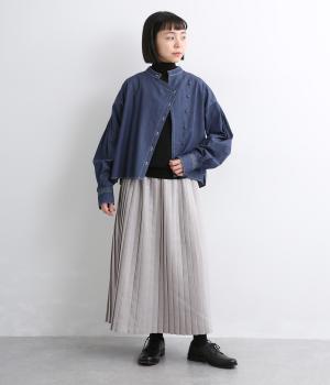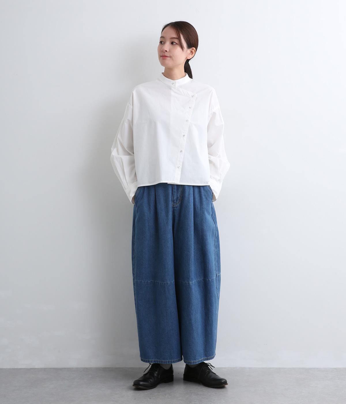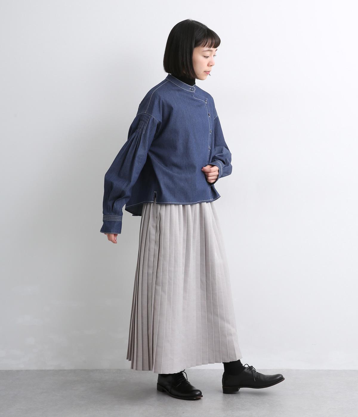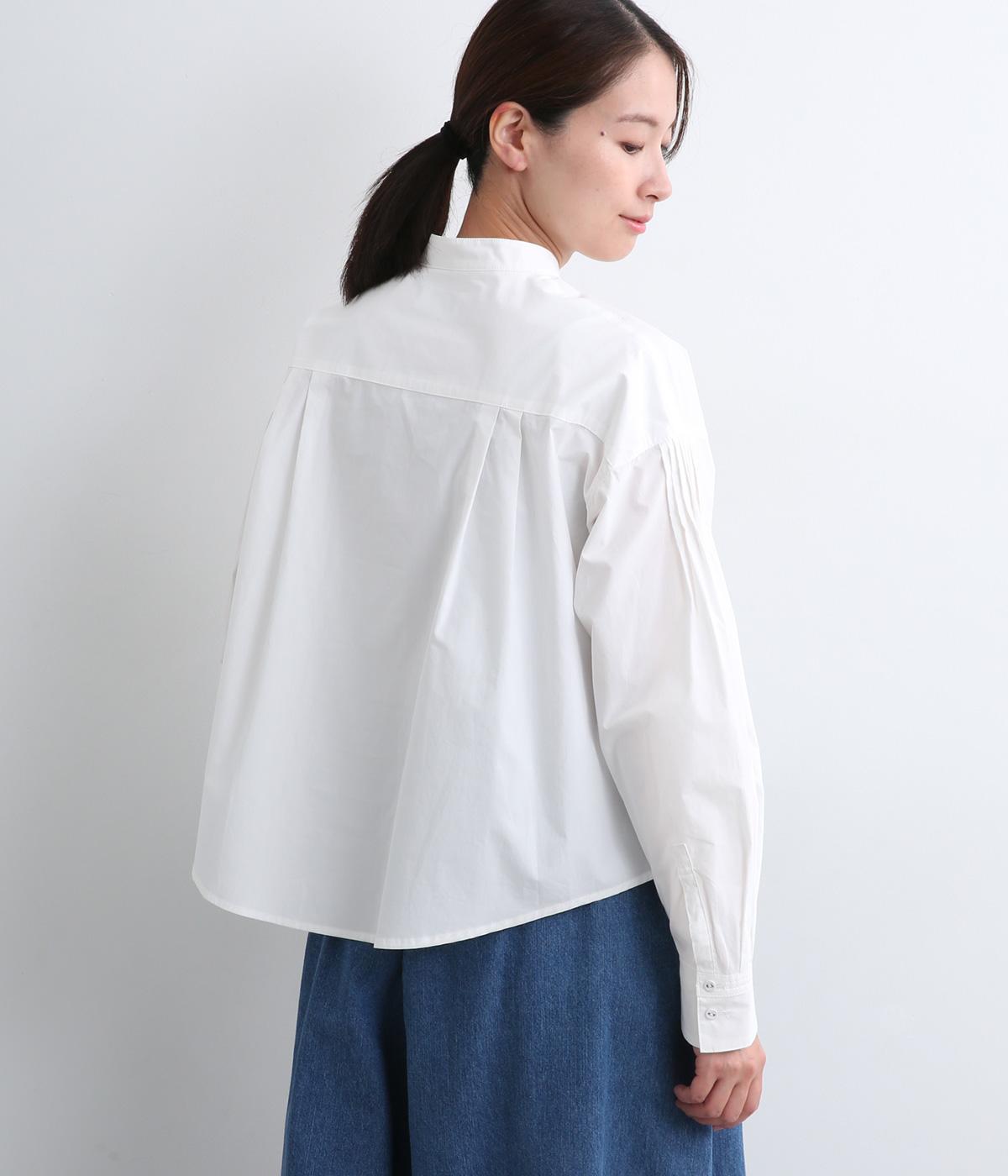 フロントボタンの配置がアイキャッチになったブラウスは、ピンタックの袖やボトルネックなどクラシカル要素を取り入れています。裾は前後差をつけ、後ろはタックでフレア感を出しているのでラフなトップスアウトもお洒落にきまります。
