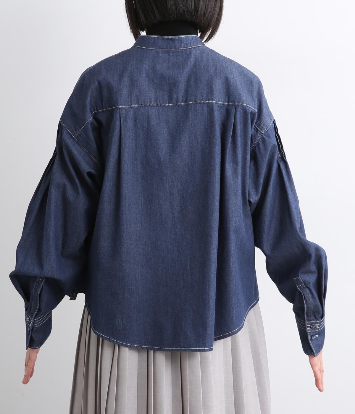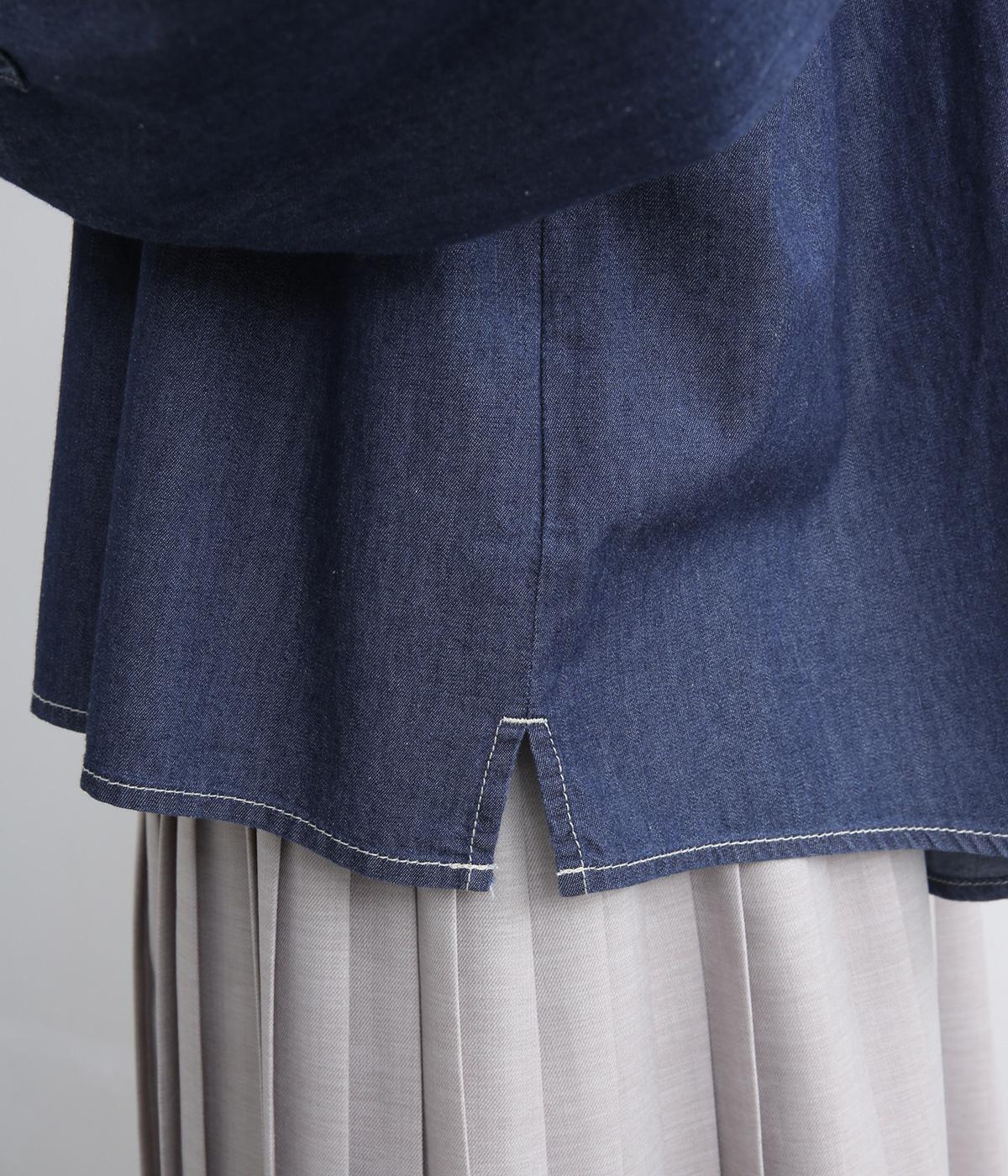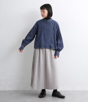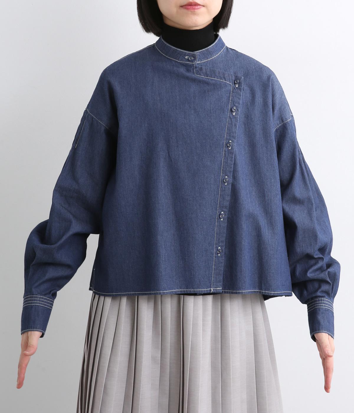 フロントボタンの配置がアイキャッチになったブラウスは、ピンタックの袖やボトルネックなどクラシカル要素を取り入れています。裾は前後差をつけ、後ろはタックでフレア感を出しているのでラフなトップスアウトもお洒落にきまります。