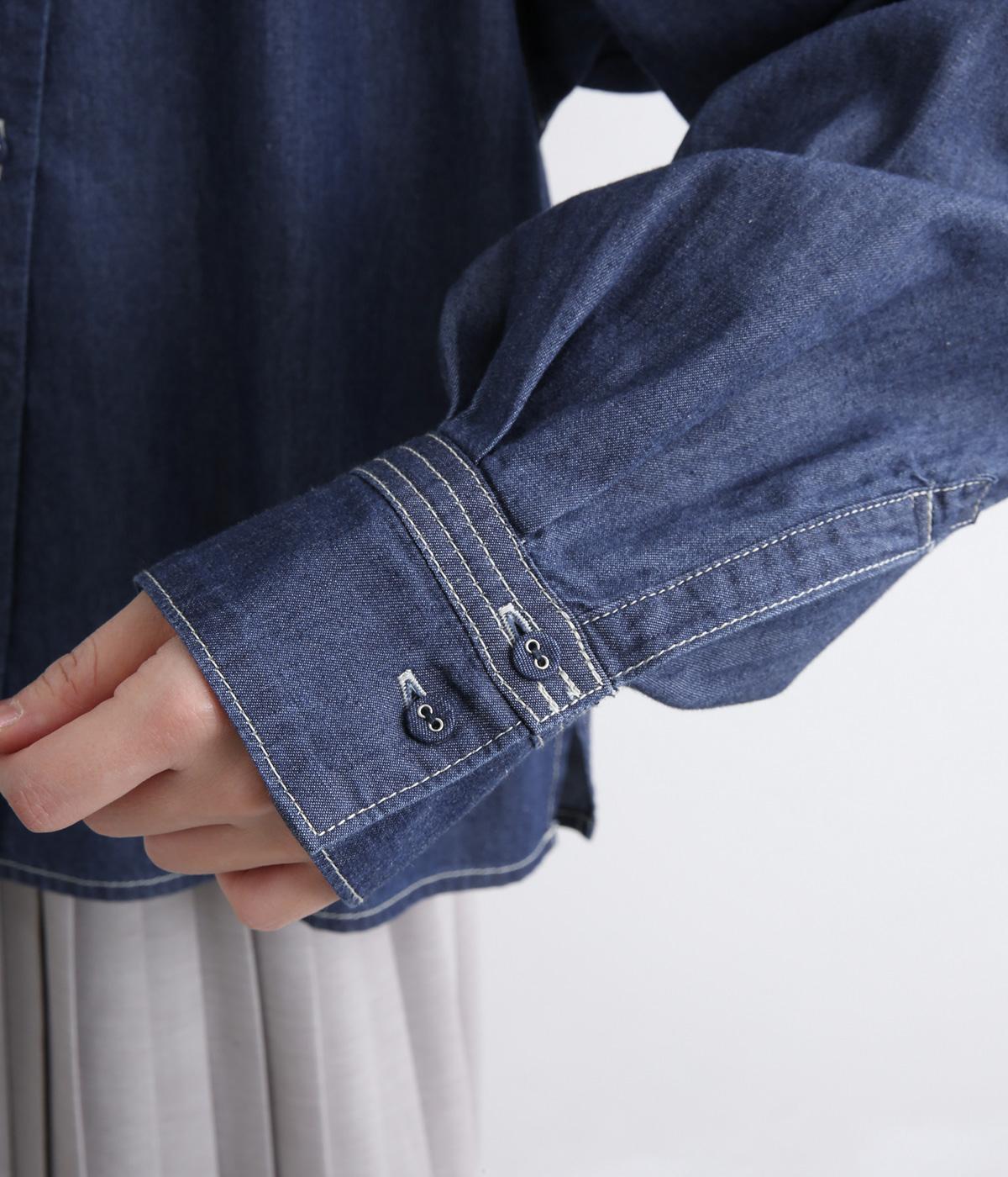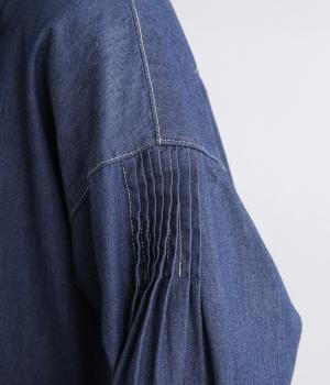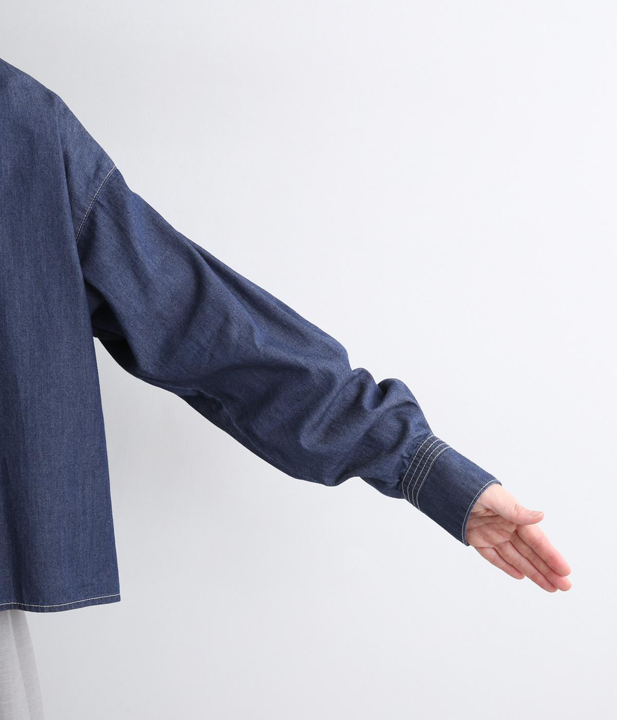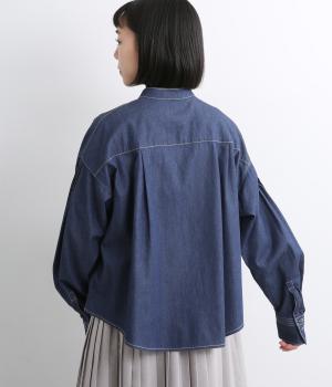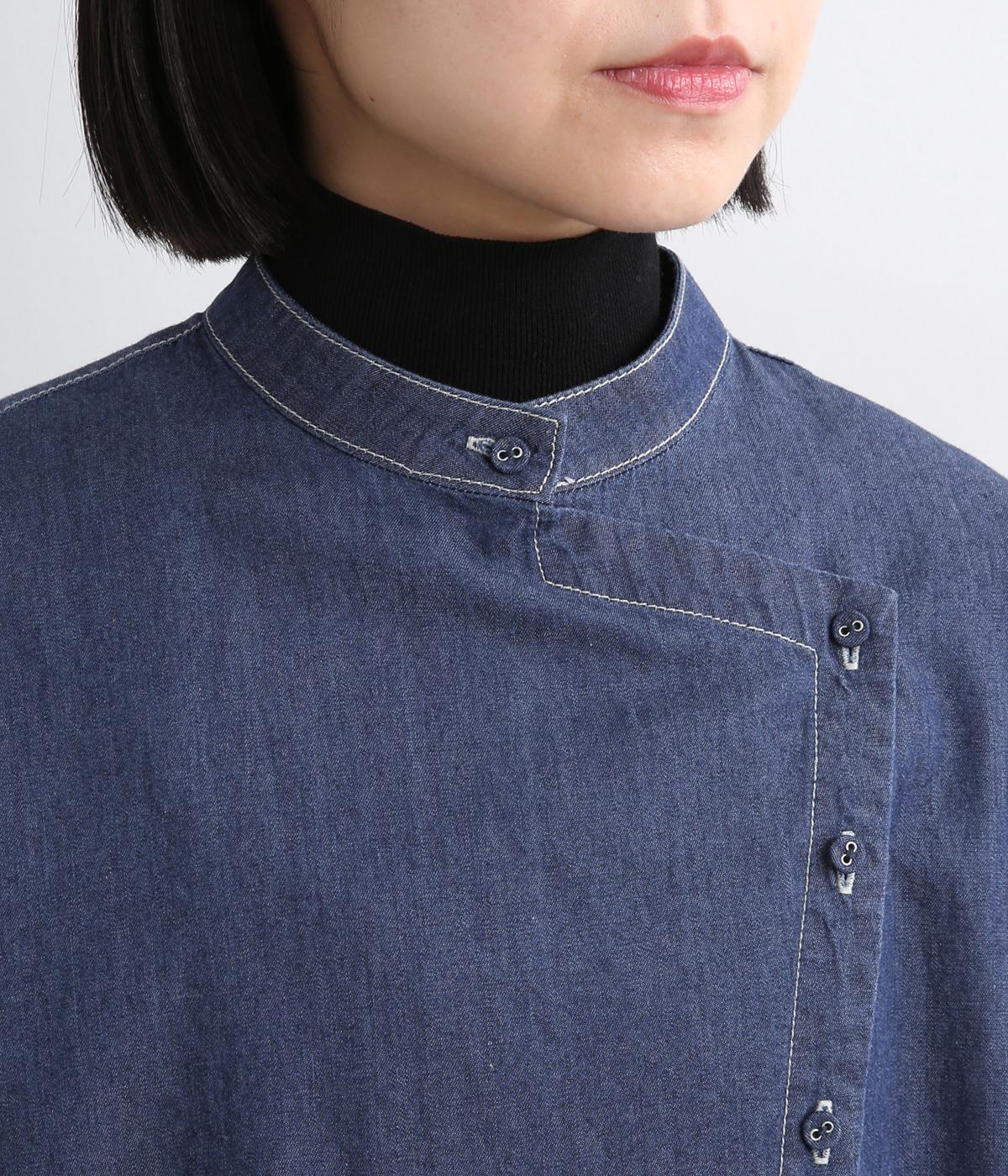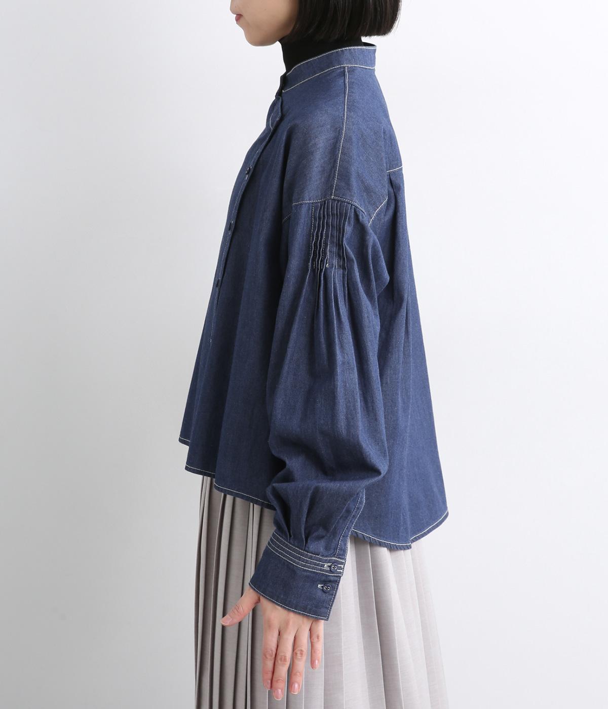 フロントボタンの配置がアイキャッチになったブラウスは、ピンタックの袖やボトルネックなどクラシカル要素を取り入れています。裾は前後差をつけ、後ろはタックでフレア感を出しているのでラフなトップスアウトもお洒落にきまります。