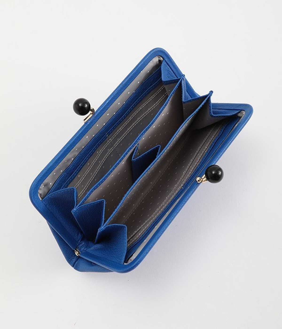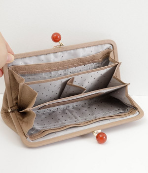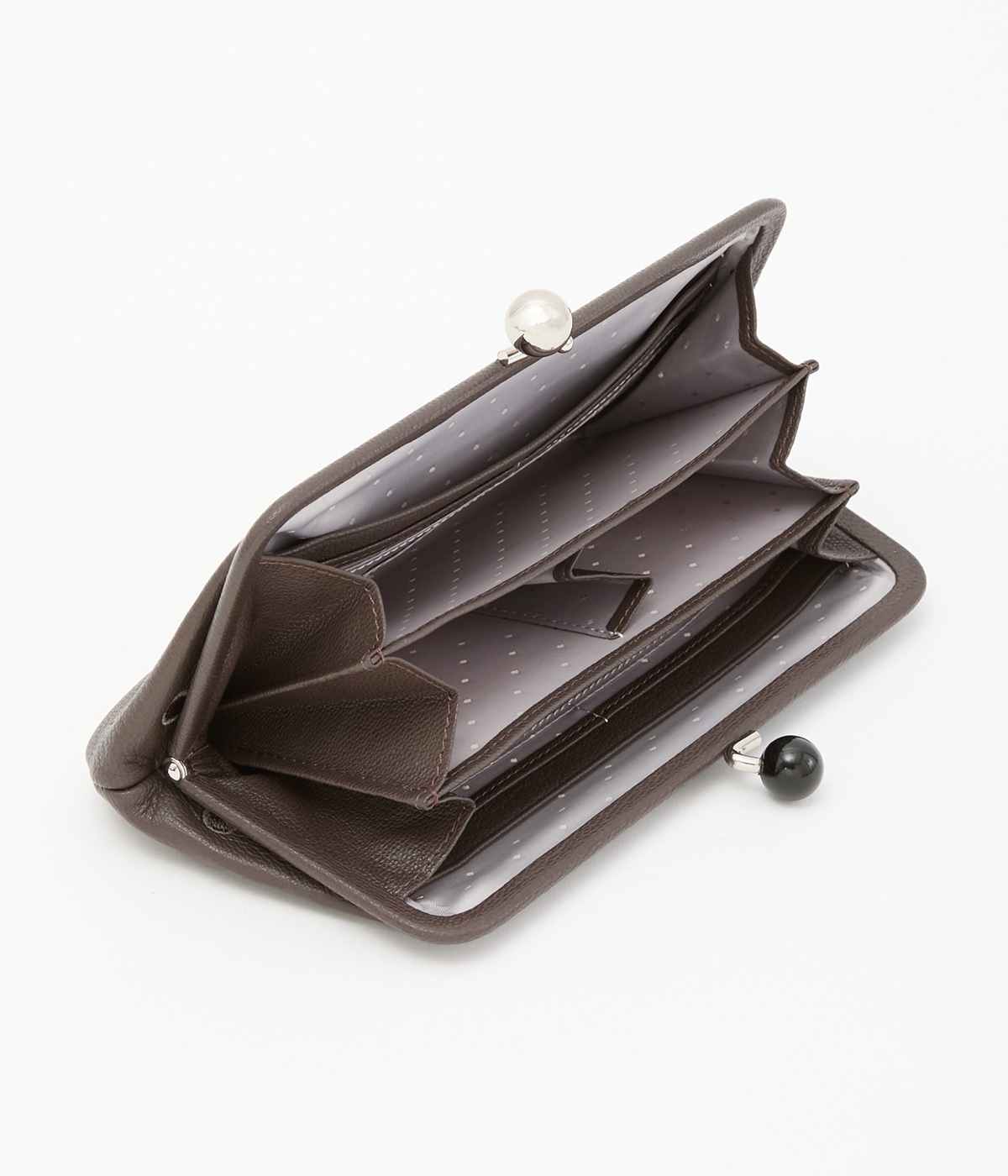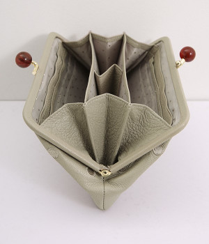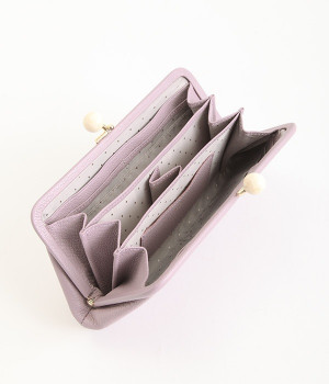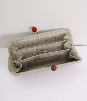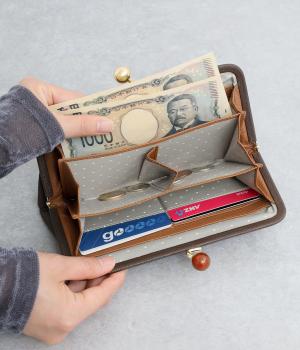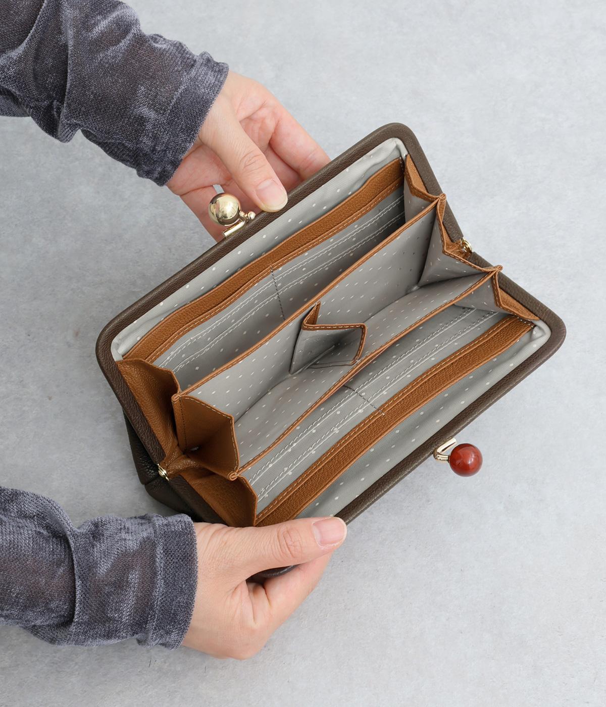 一見シンプルに見えますが、がま口を開けると中は細かく仕切られており、整理しやすく優れた収納力があります。小銭入れ部分は仕切りのみで蓋がないため、中身が一目でわかるのもうれしい。がま口部分も大玉で開閉しやすいです。