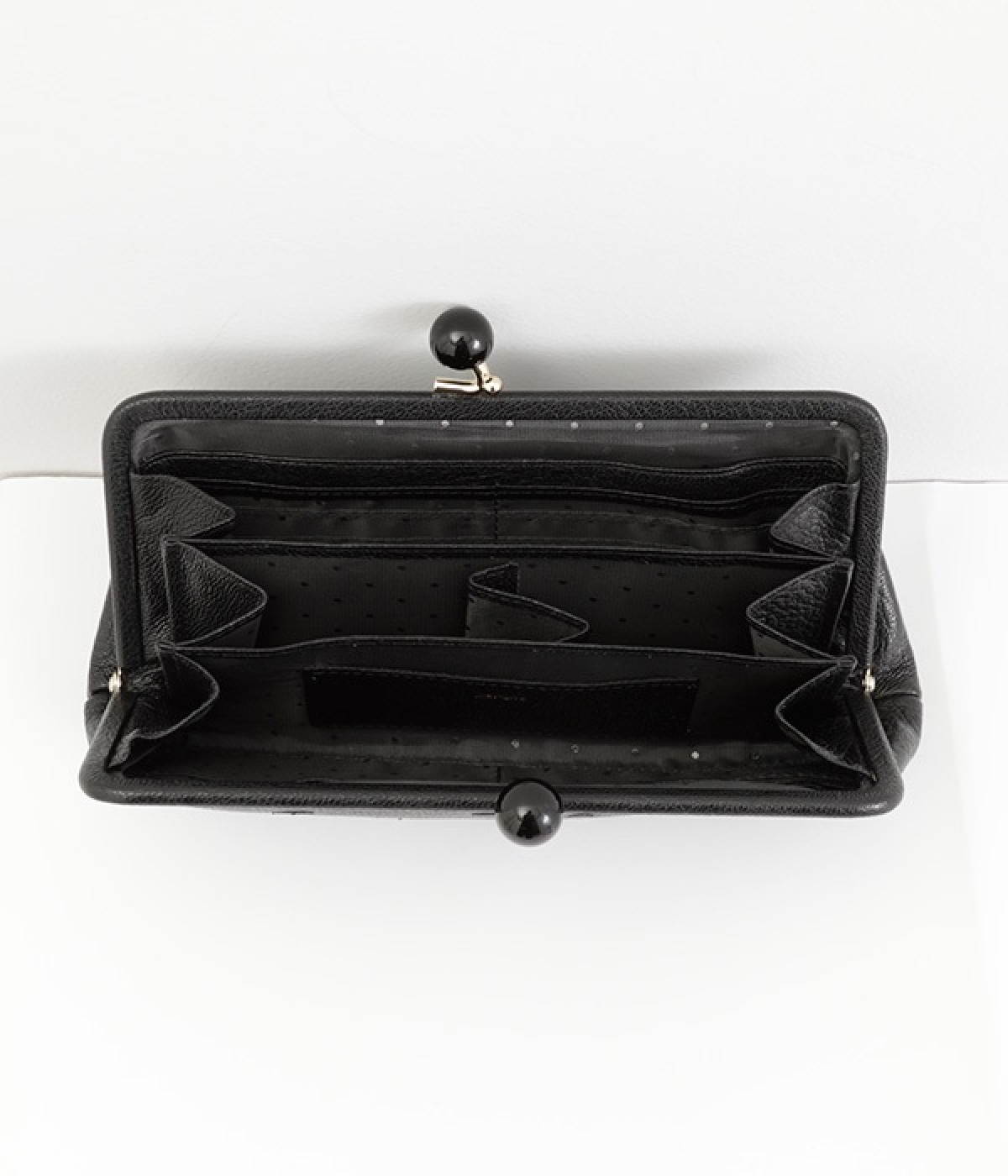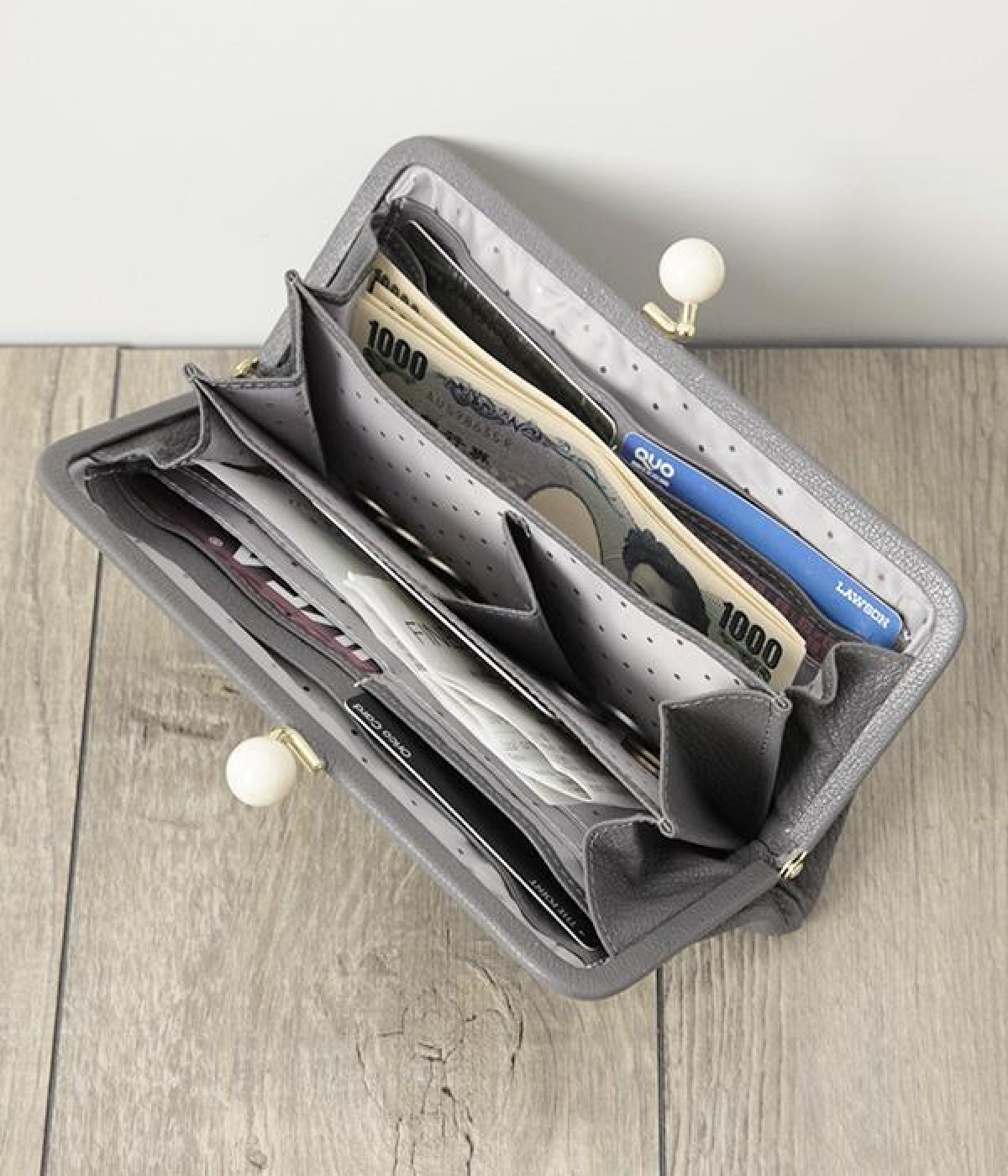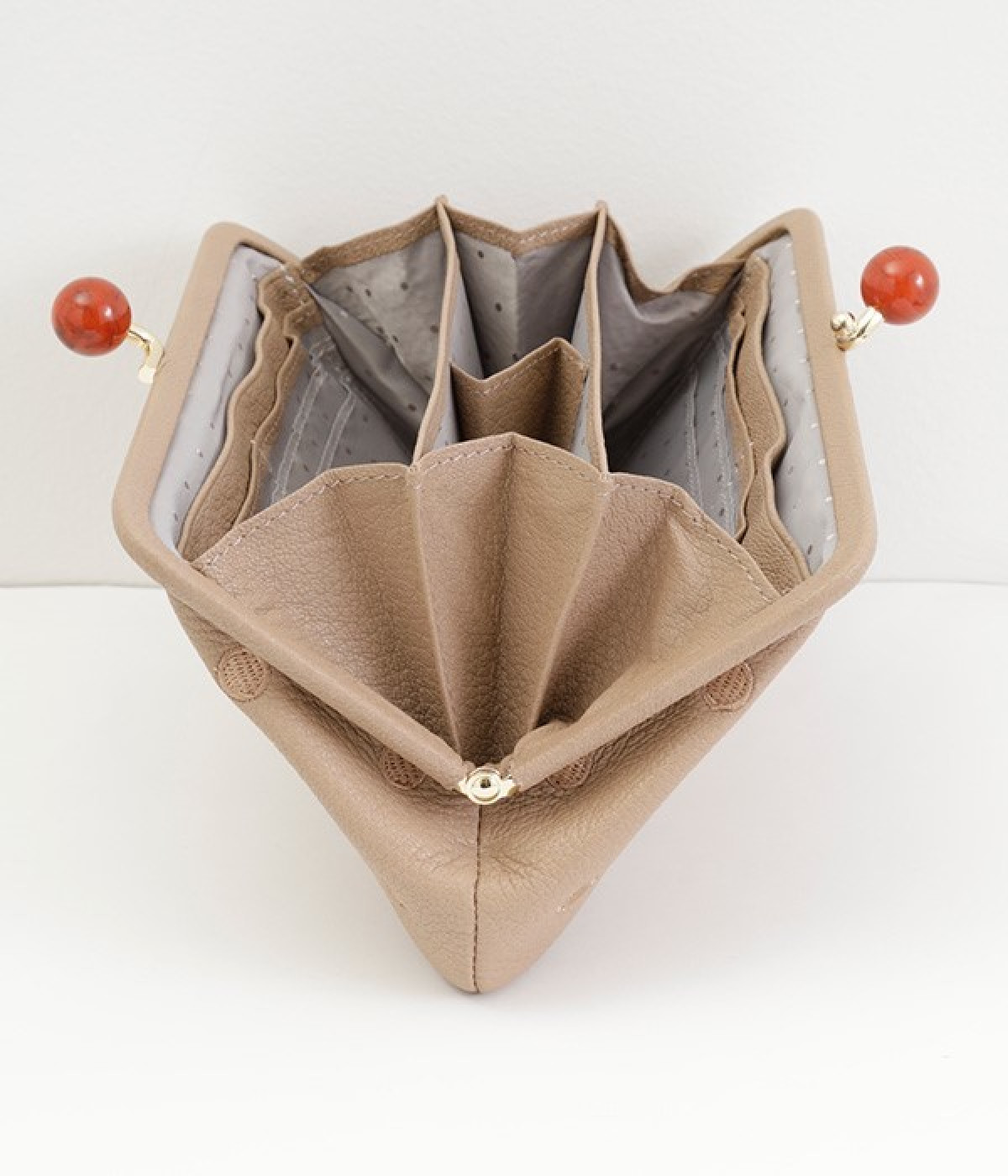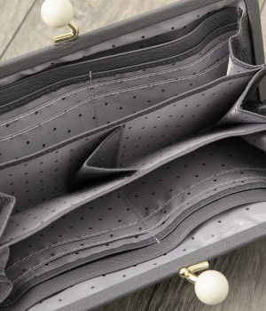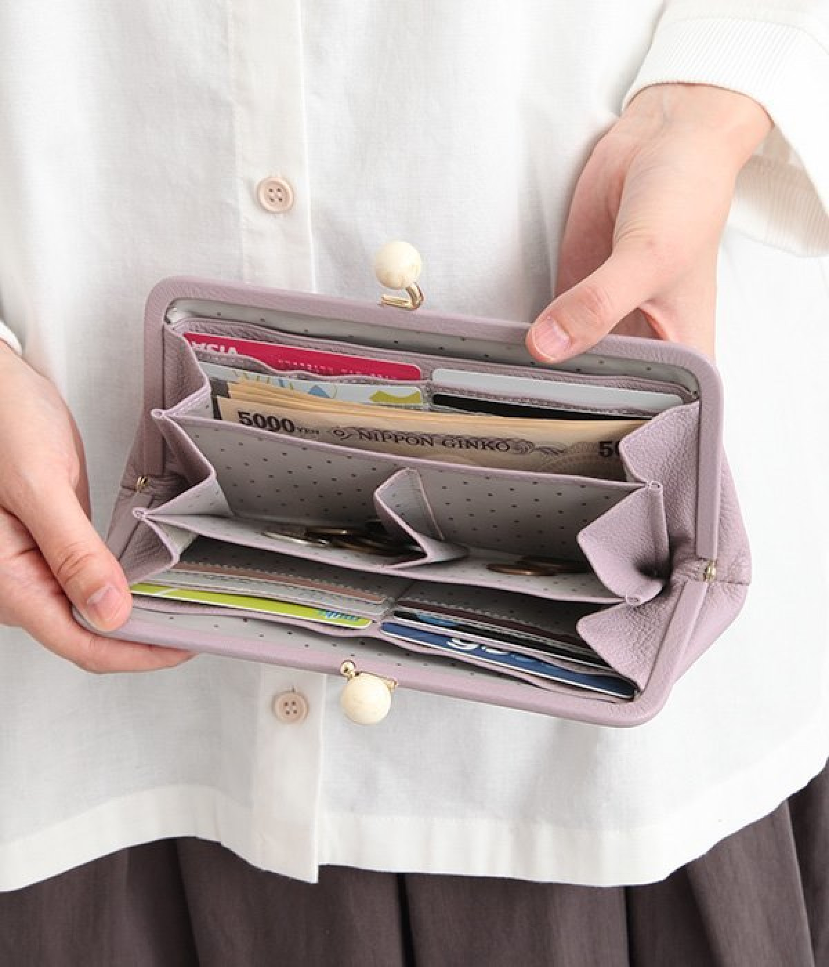 一見シンプルに見えますが、がま口を開けると中は細かく仕切られており、整理しやすく優れた収納力があります。小銭入れ部分は仕切りのみで蓋がないため、中身が一目でわかるのもうれしい。がま口部分も大玉で開閉しやすいです。