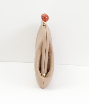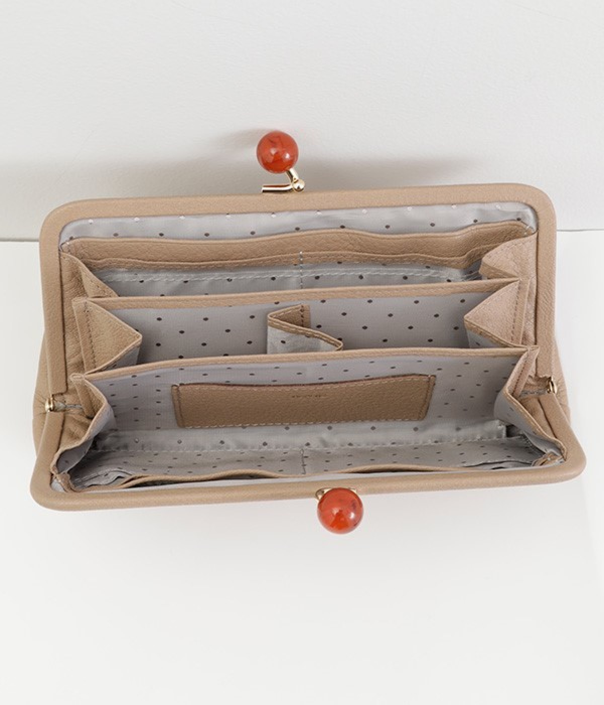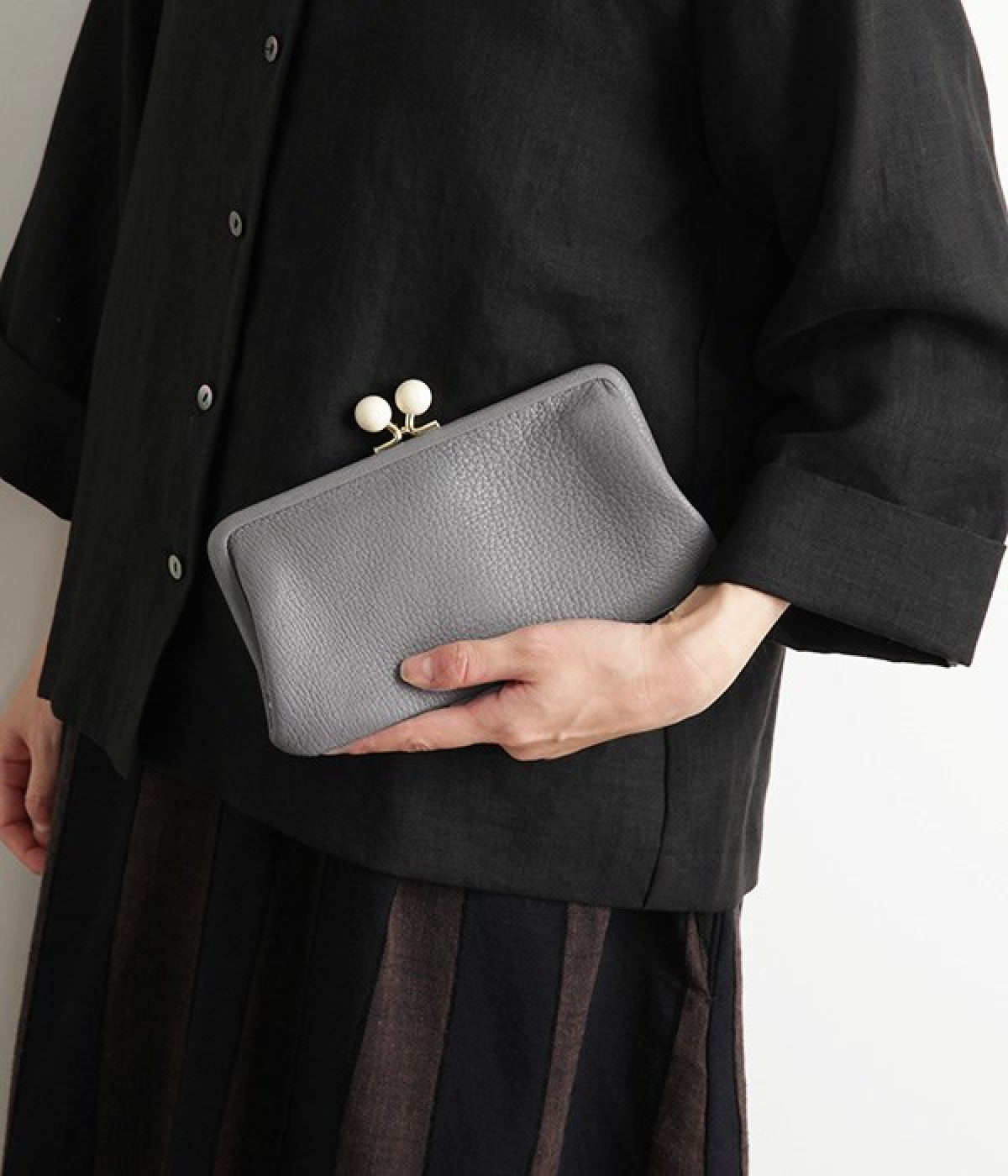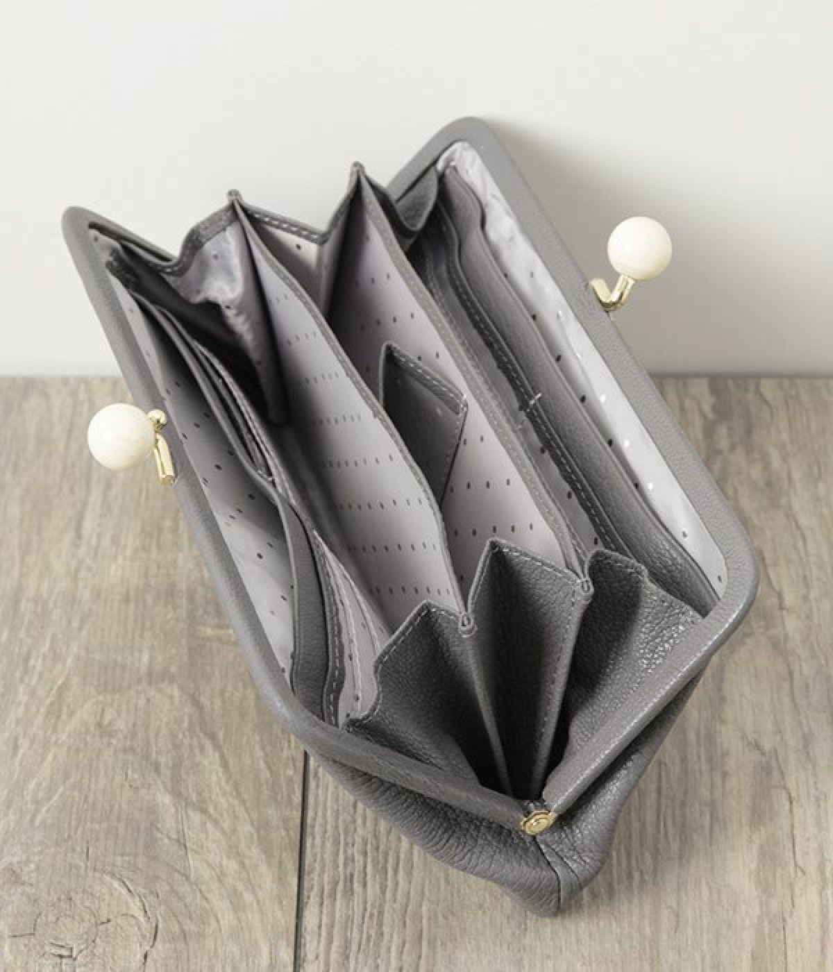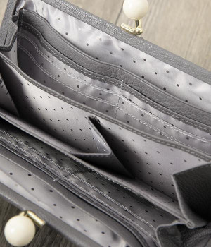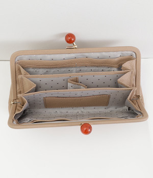 一見シンプルに見えますが、がま口を開けると中は細かく仕切られており、整理しやすく優れた収納力があります。小銭入れ部分は仕切りのみで蓋がないため、中身が一目でわかるのもうれしい。がま口部分も大玉で開閉しやすいです。