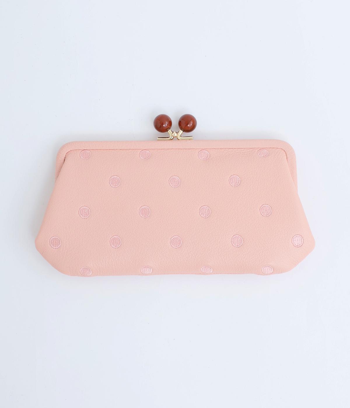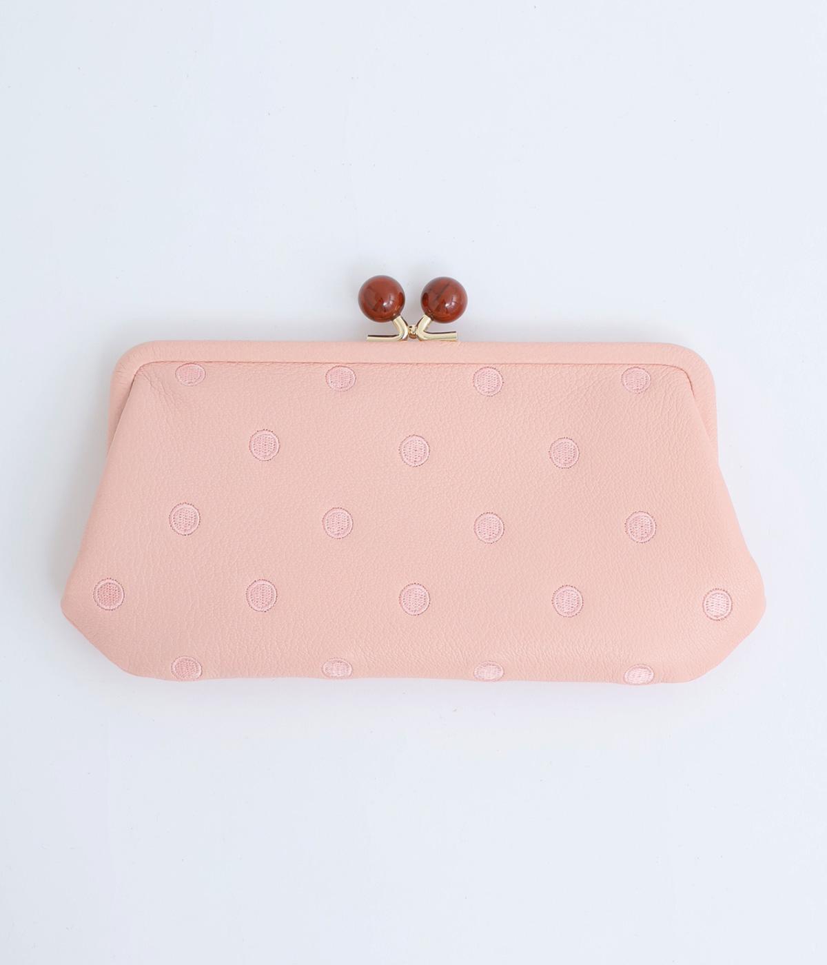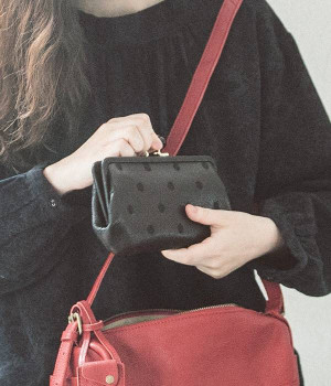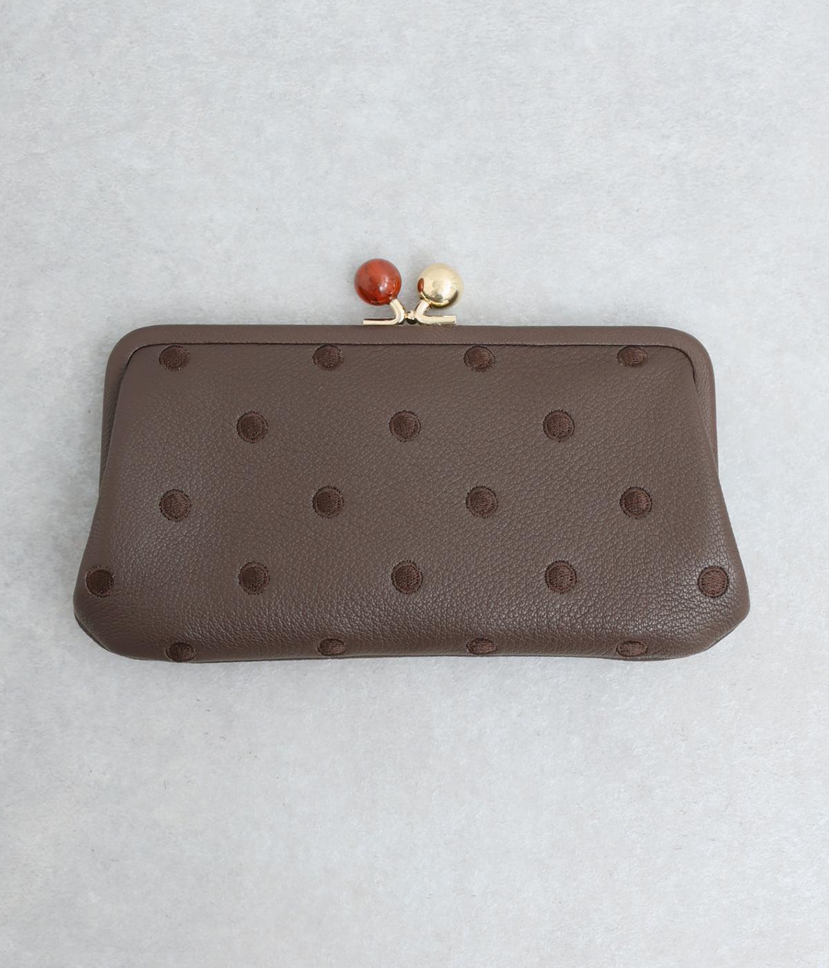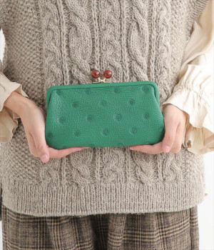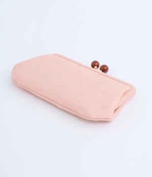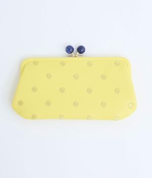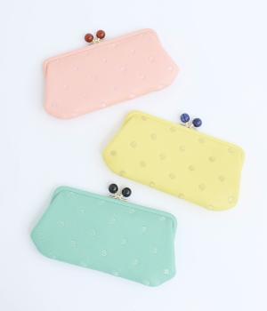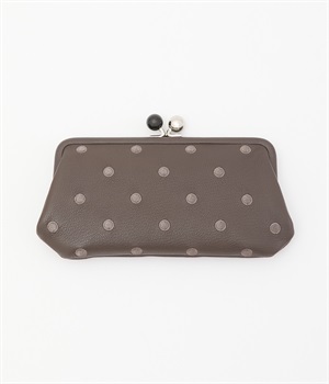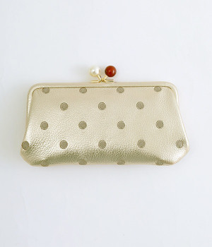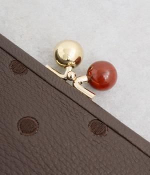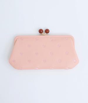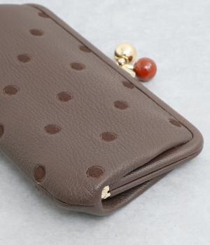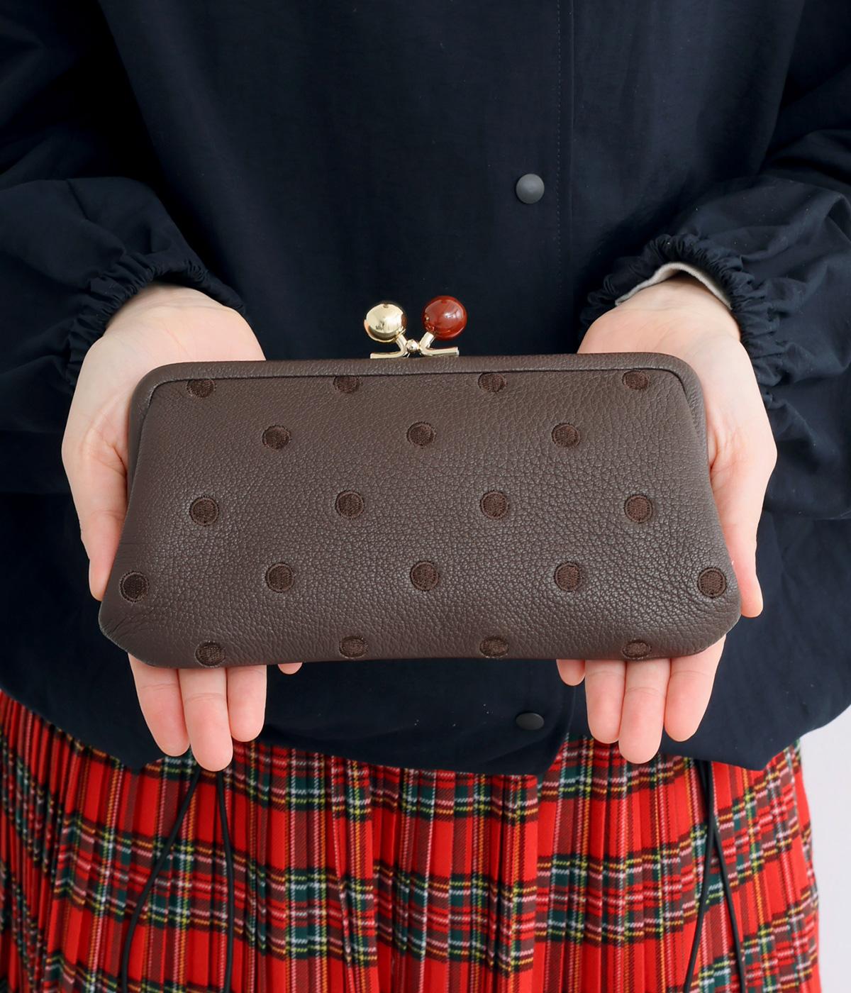 ふんわりとした手触りの山羊革に、ドットの刺しゅうをあしらって可愛らしく仕上げました。中の裏地にもドット柄が入っています。ゴールド金具とがま口部分のアクリル玉がアクセント。