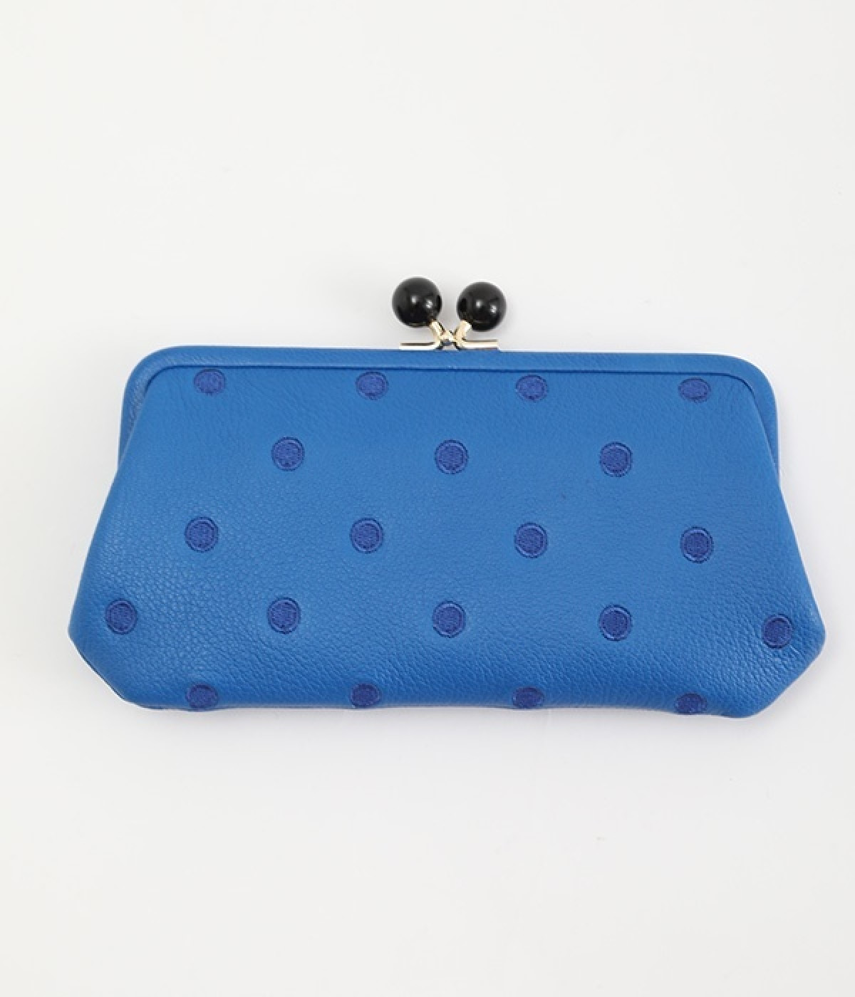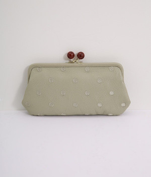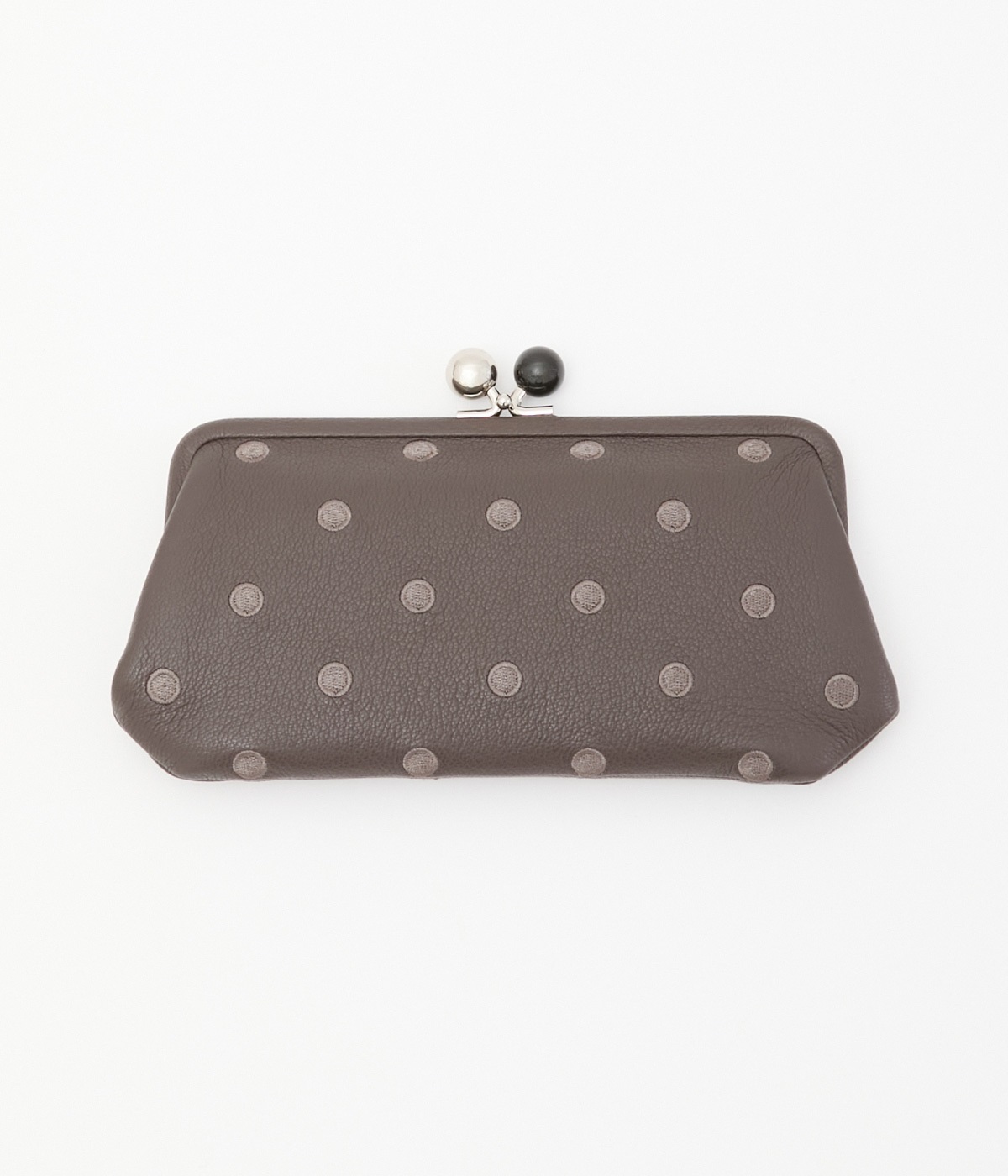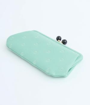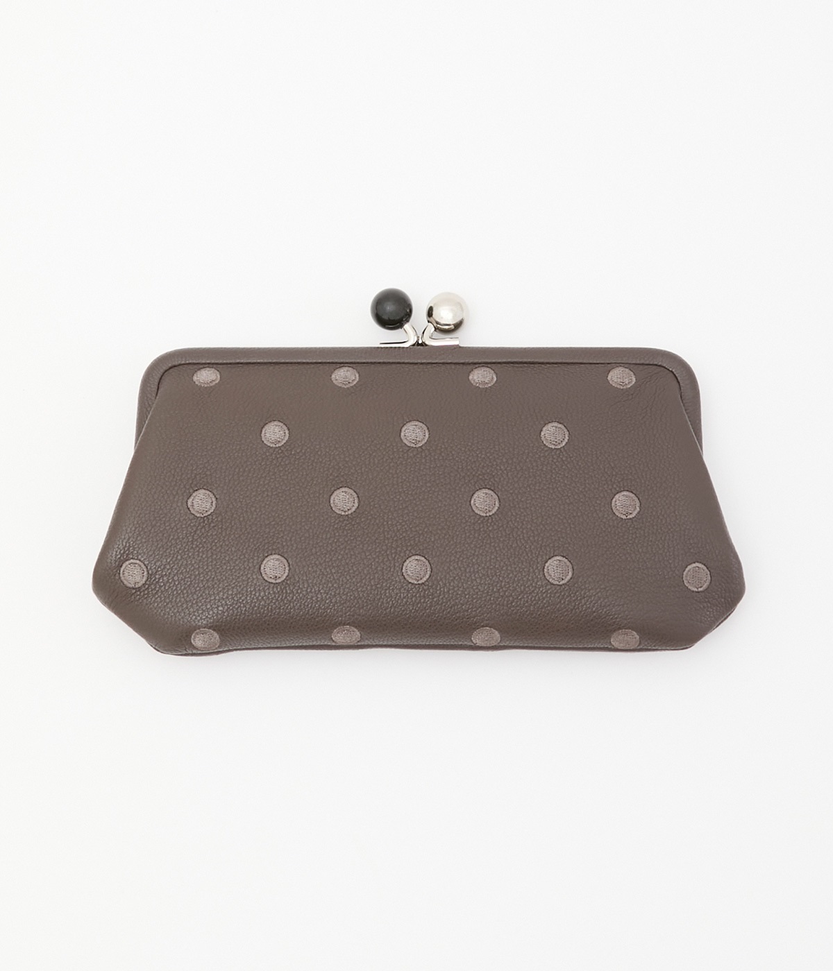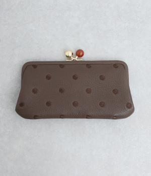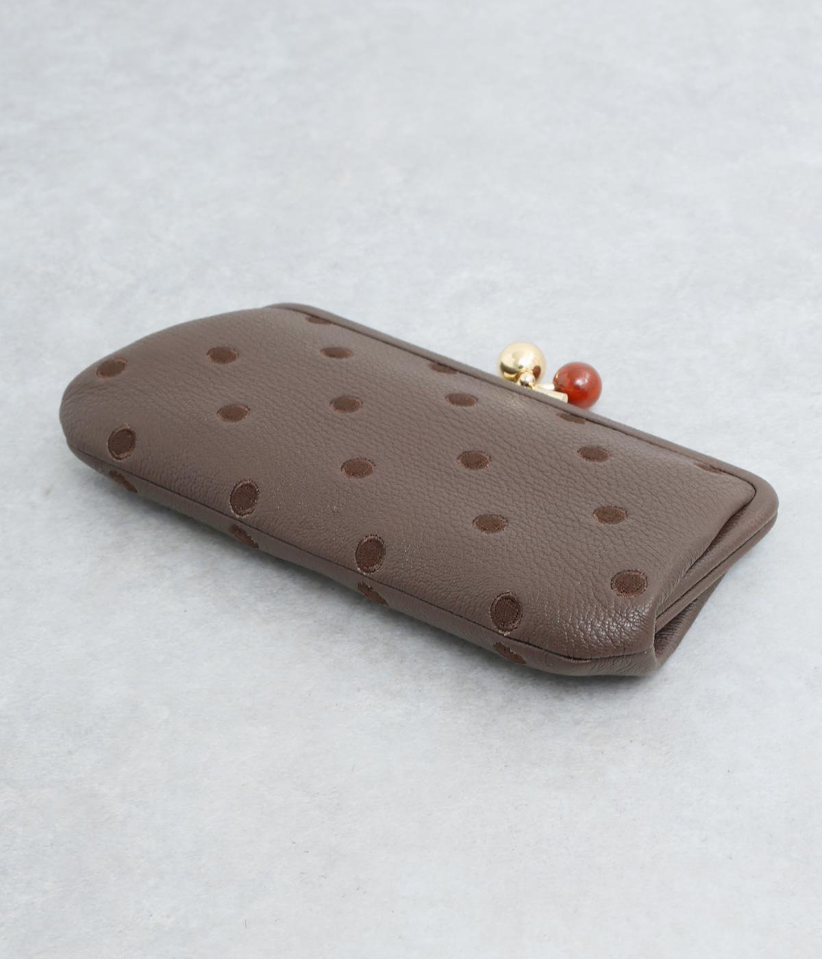 ふんわりとした手触りの山羊革に、ドットの刺しゅうをあしらって可愛らしく仕上げました。中の裏地にもドット柄が入っています。ゴールド金具とがま口部分のアクリル玉がアクセント。