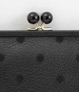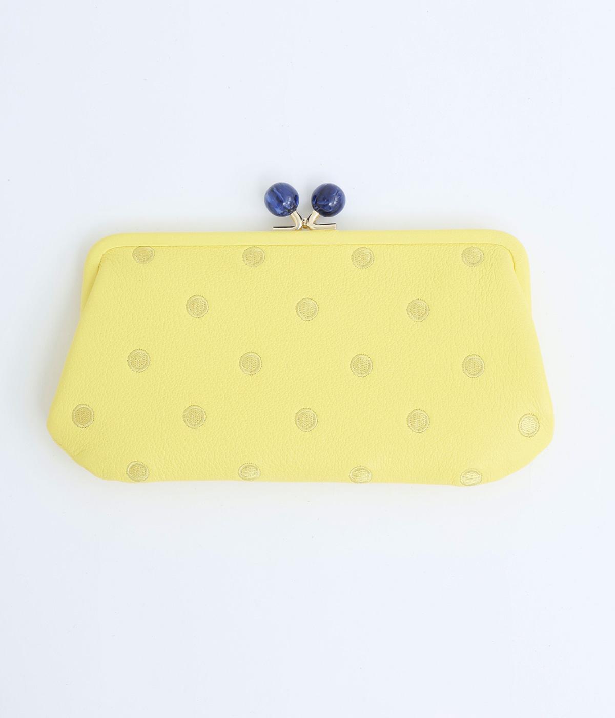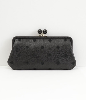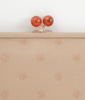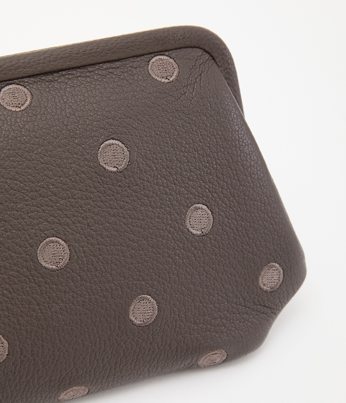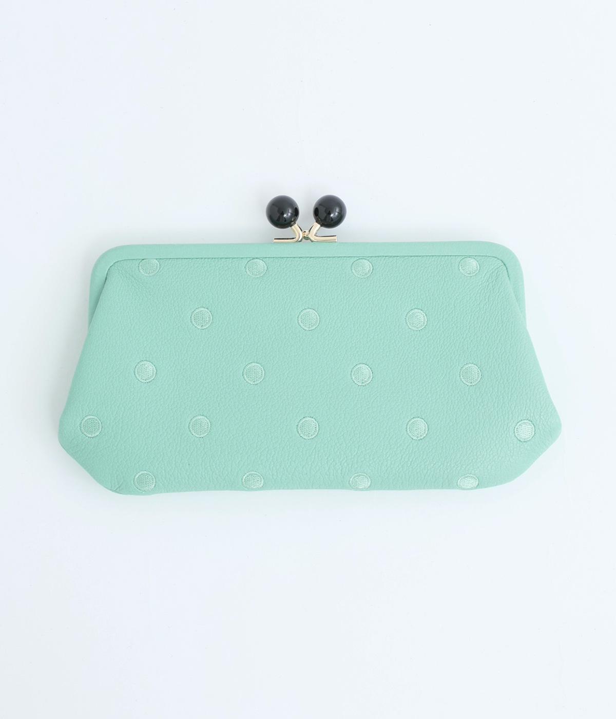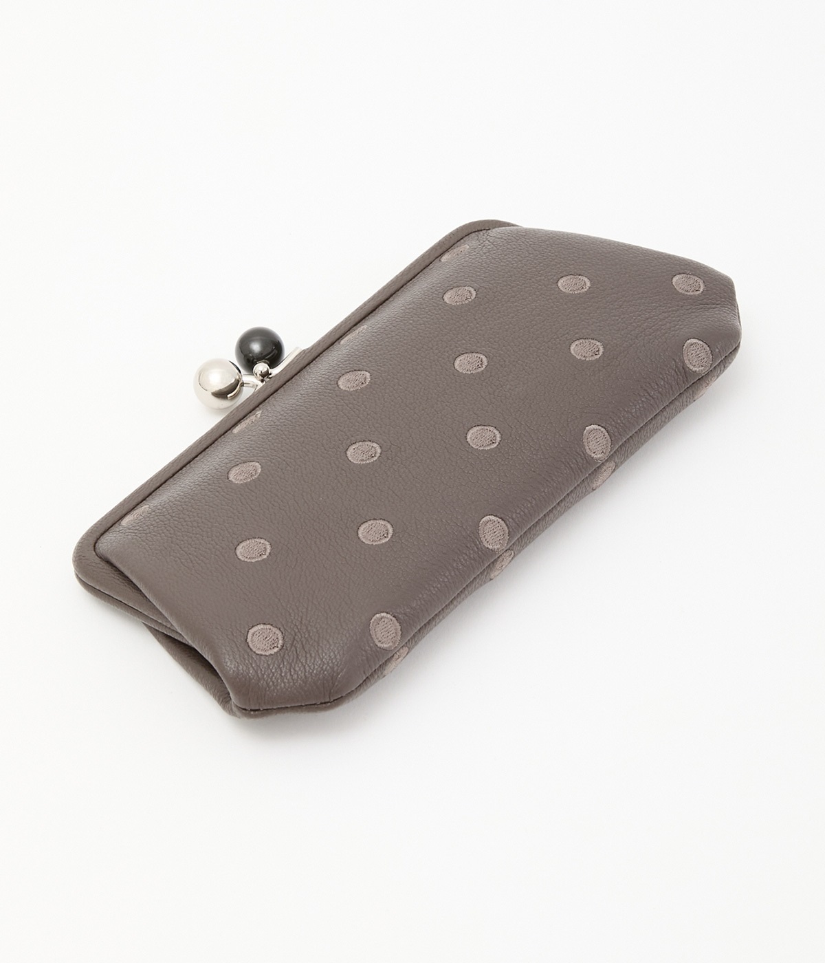 ふんわりとした手触りの山羊革に、ドットの刺しゅうをあしらって可愛らしく仕上げました。中の裏地にもドット柄が入っています。ゴールド金具とがま口部分のアクリル玉がアクセント。