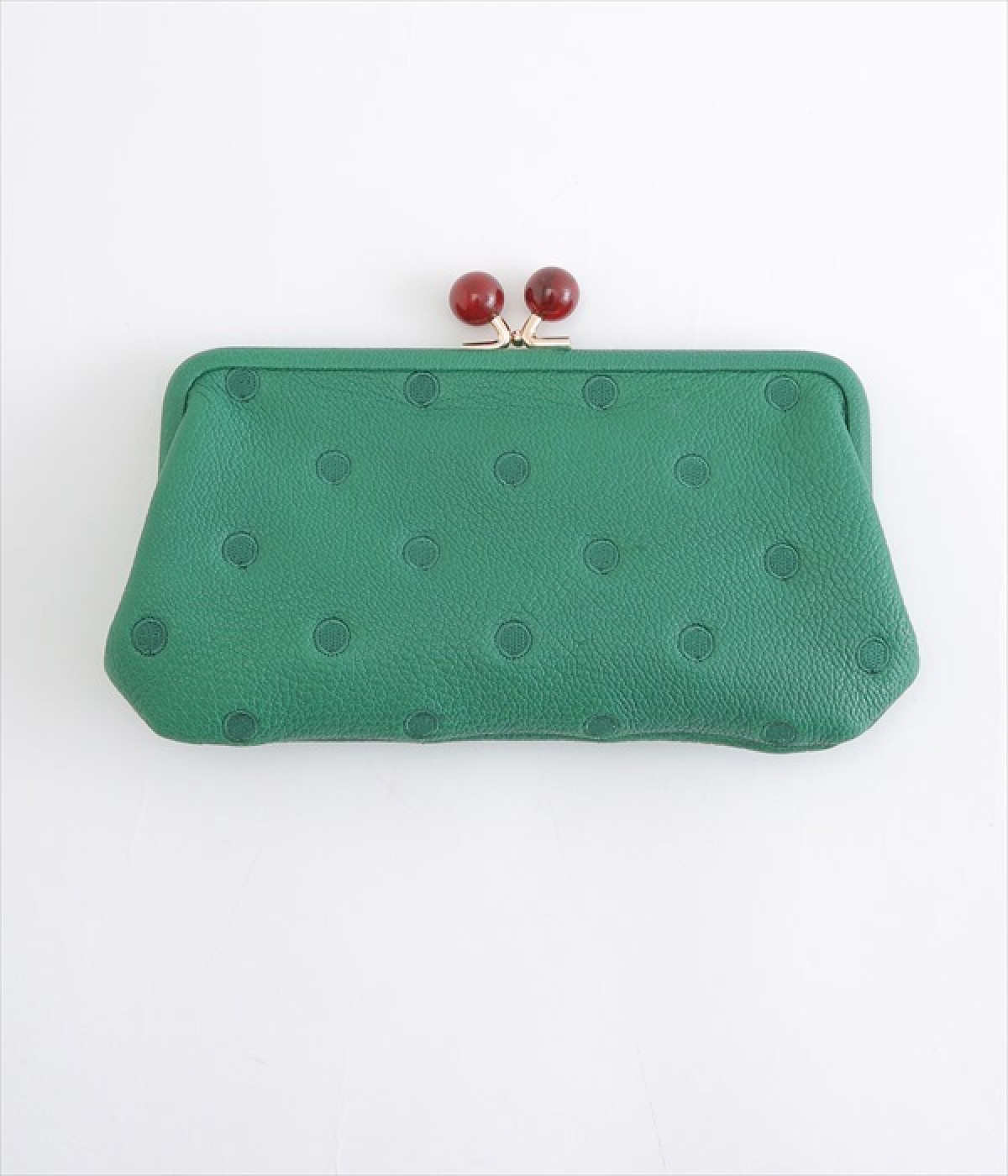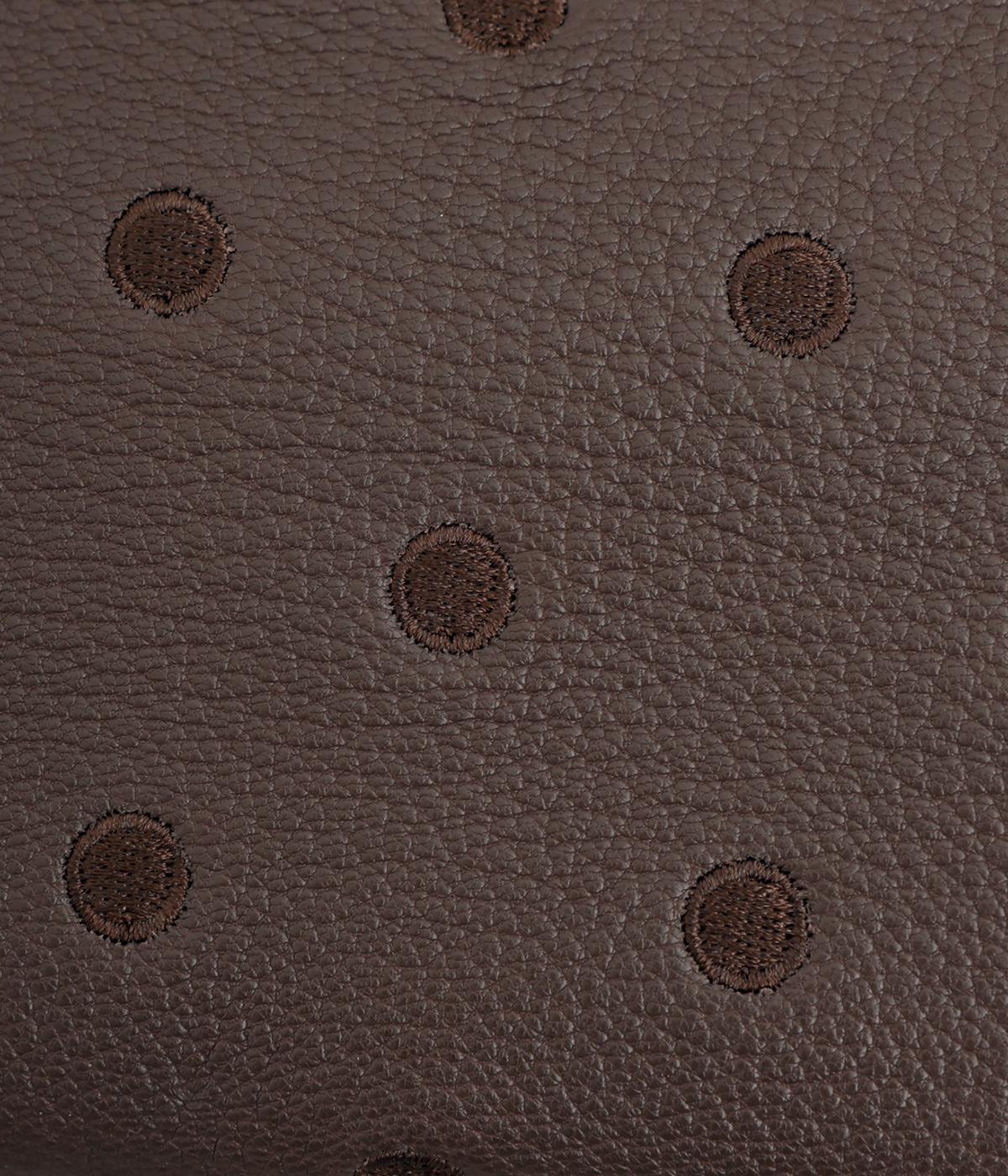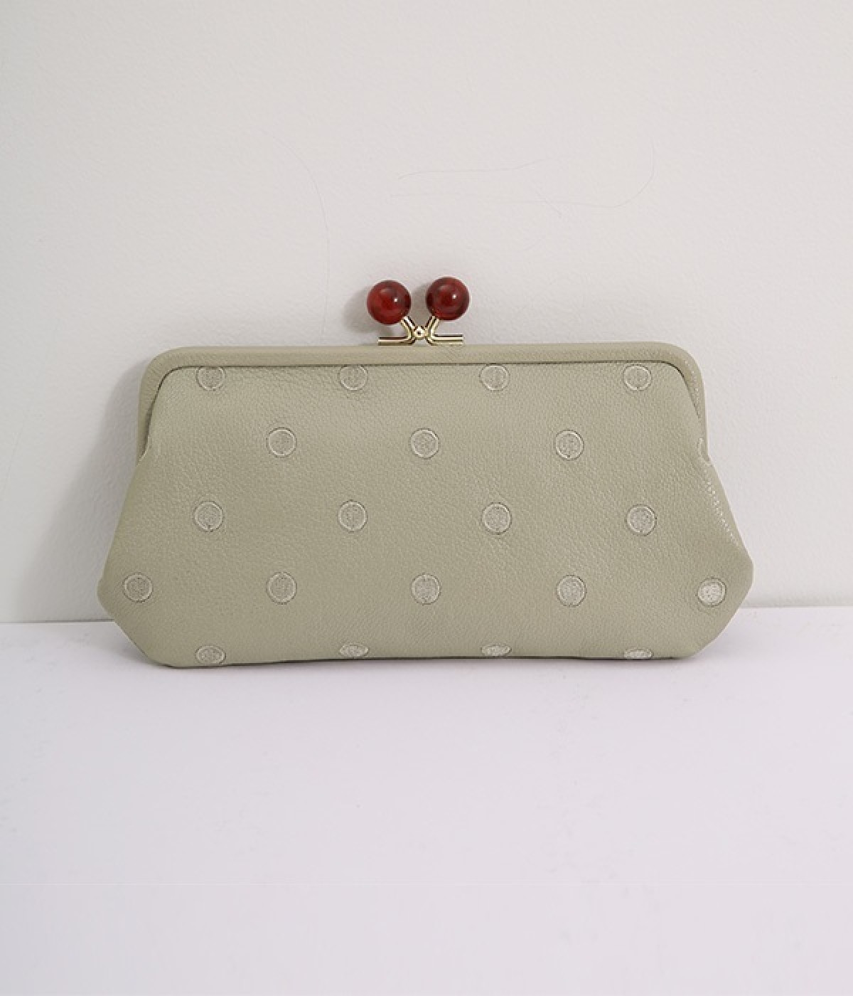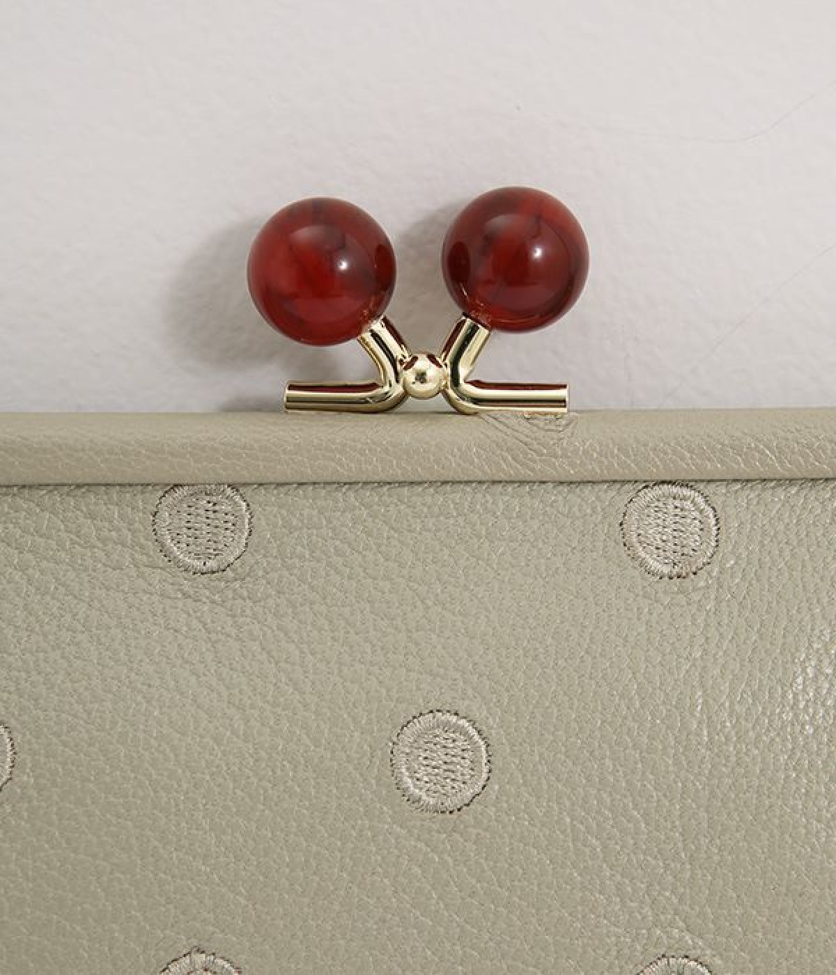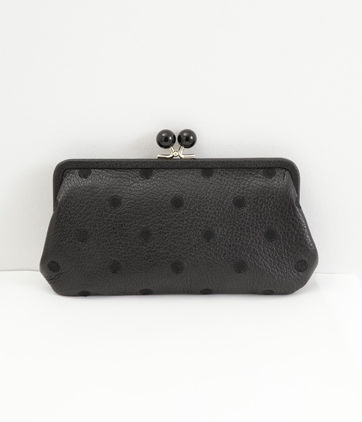 ふんわりとした手触りの山羊革に、ドットの刺しゅうをあしらって可愛らしく仕上げました。中の裏地にもドット柄が入っています。ゴールド金具とがま口部分のアクリル玉がアクセント。