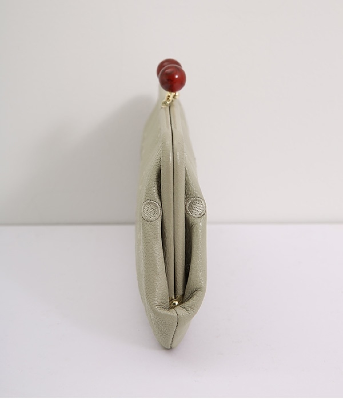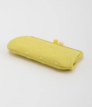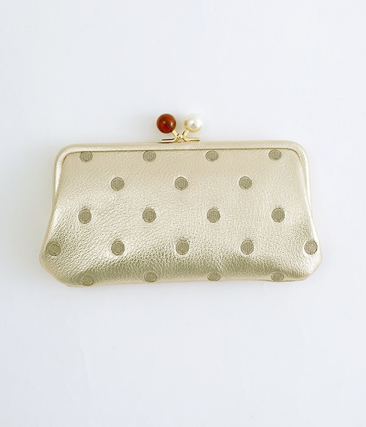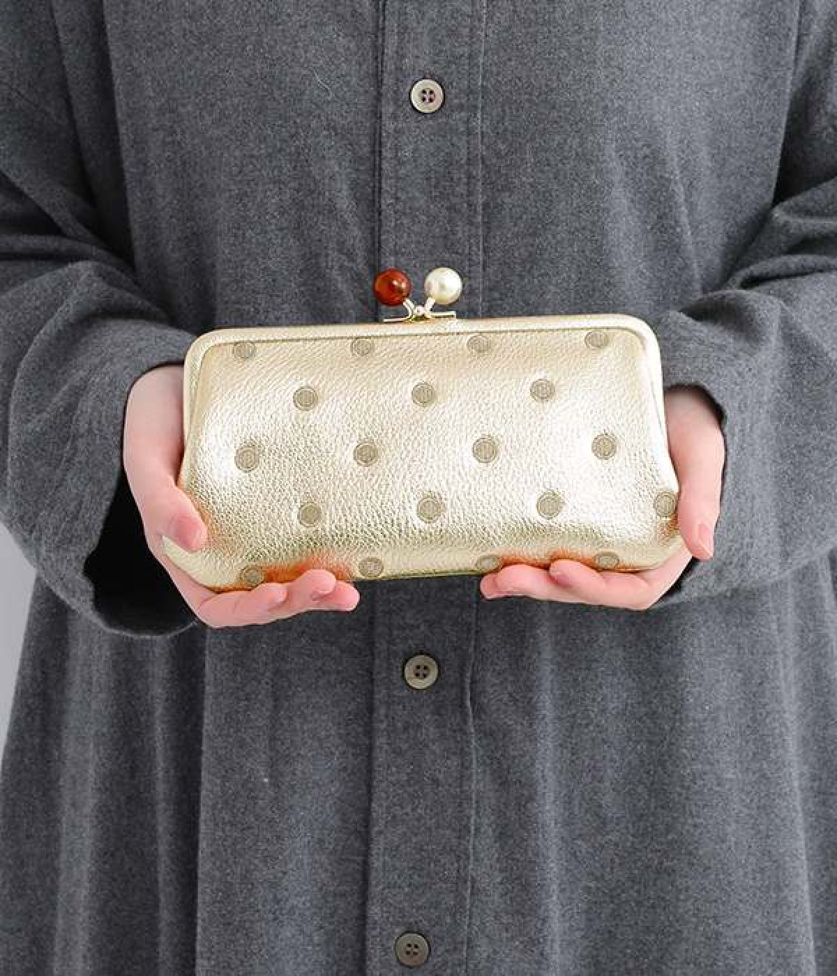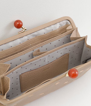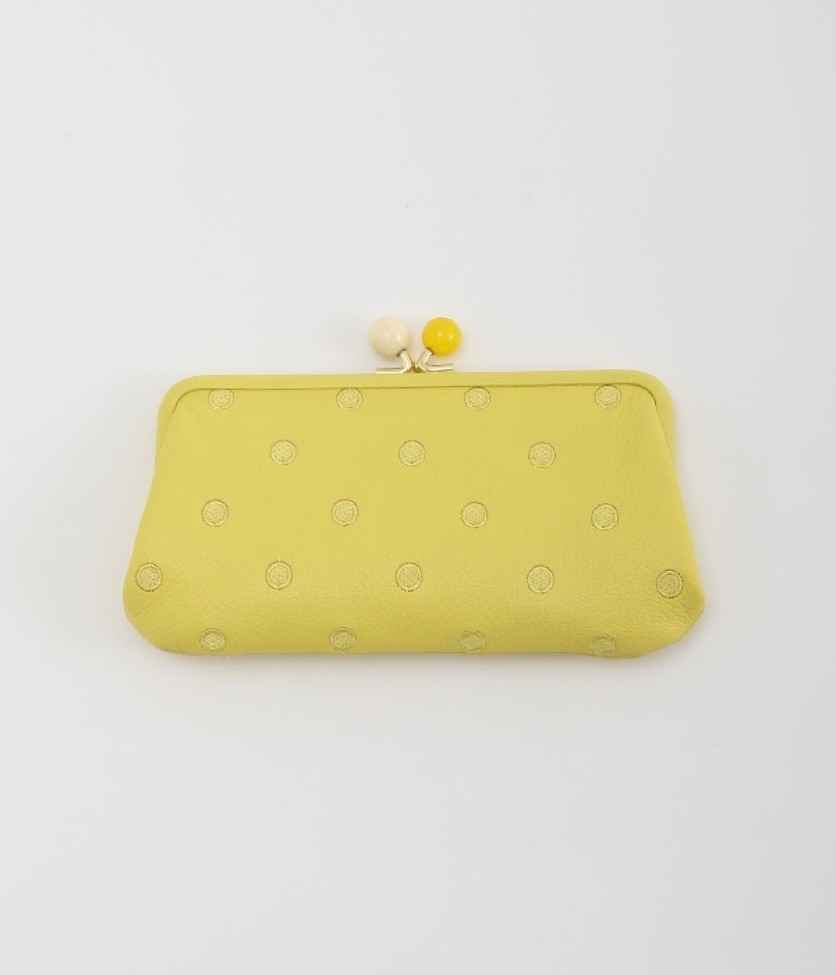 ふんわりとした手触りの山羊革に、ドットの刺しゅうをあしらって可愛らしく仕上げました。中の裏地にもドット柄が入っています。ゴールド金具とがま口部分のアクリル玉がアクセント。
