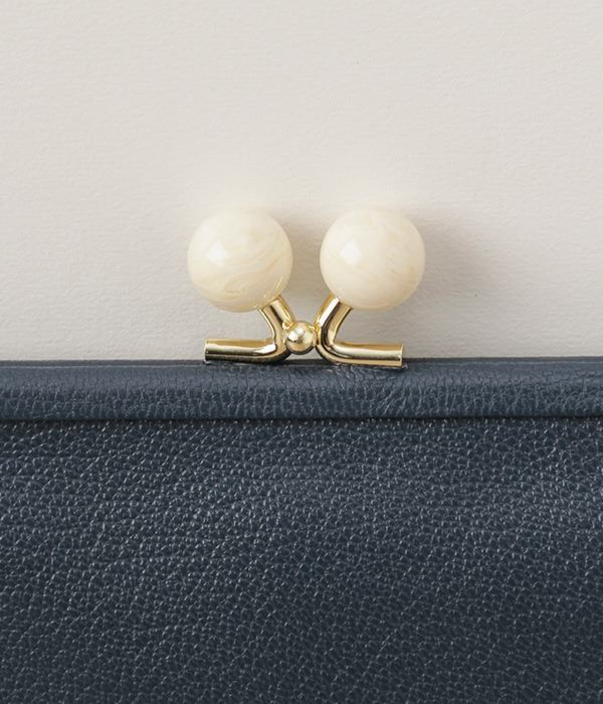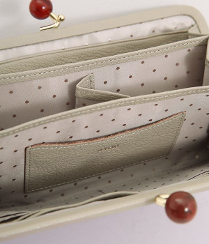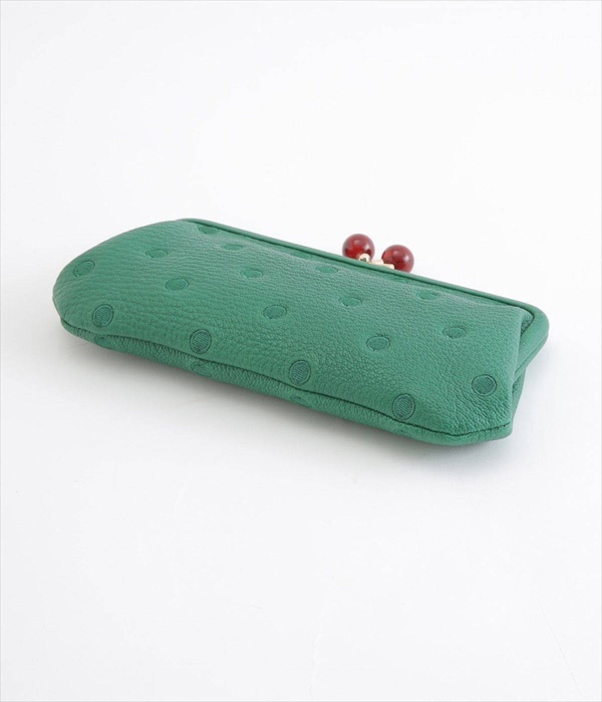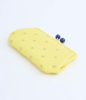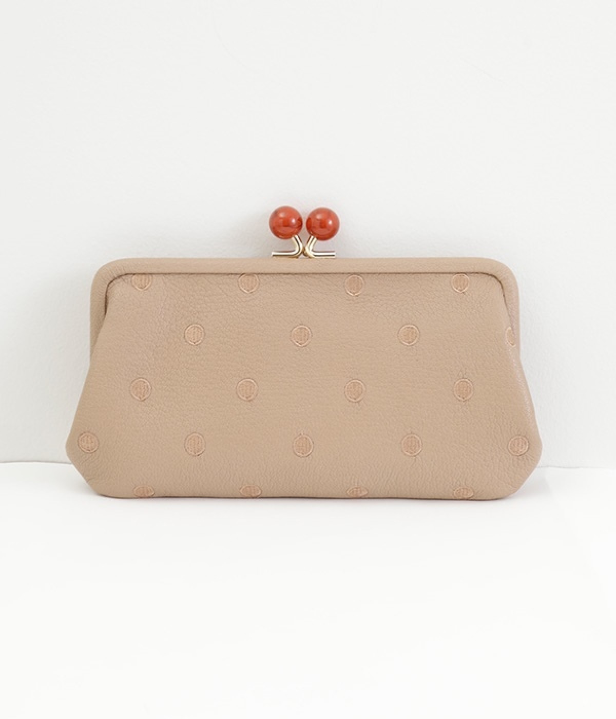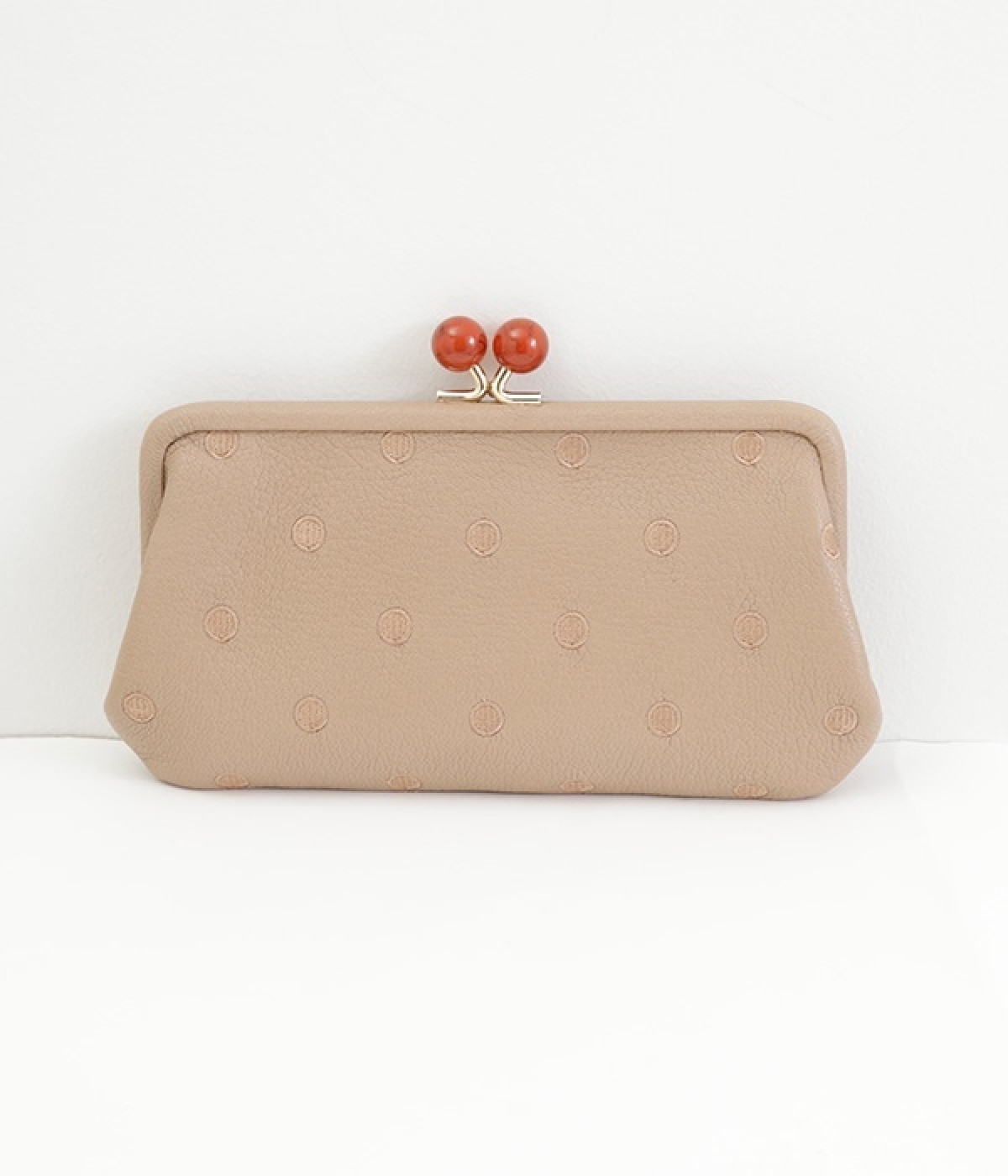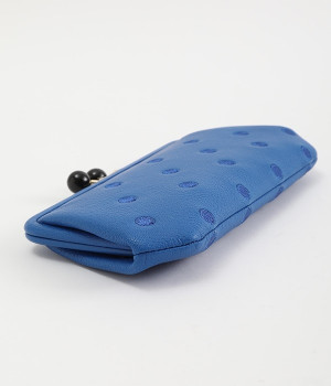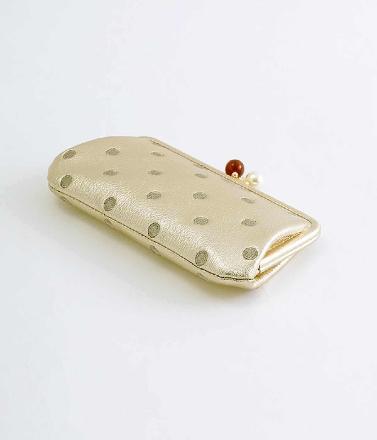 ふんわりとした手触りの山羊革に、ドットの刺しゅうをあしらって可愛らしく仕上げました。中の裏地にもドット柄が入っています。ゴールド金具とがま口部分のアクリル玉がアクセント。