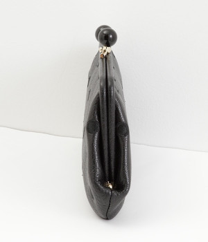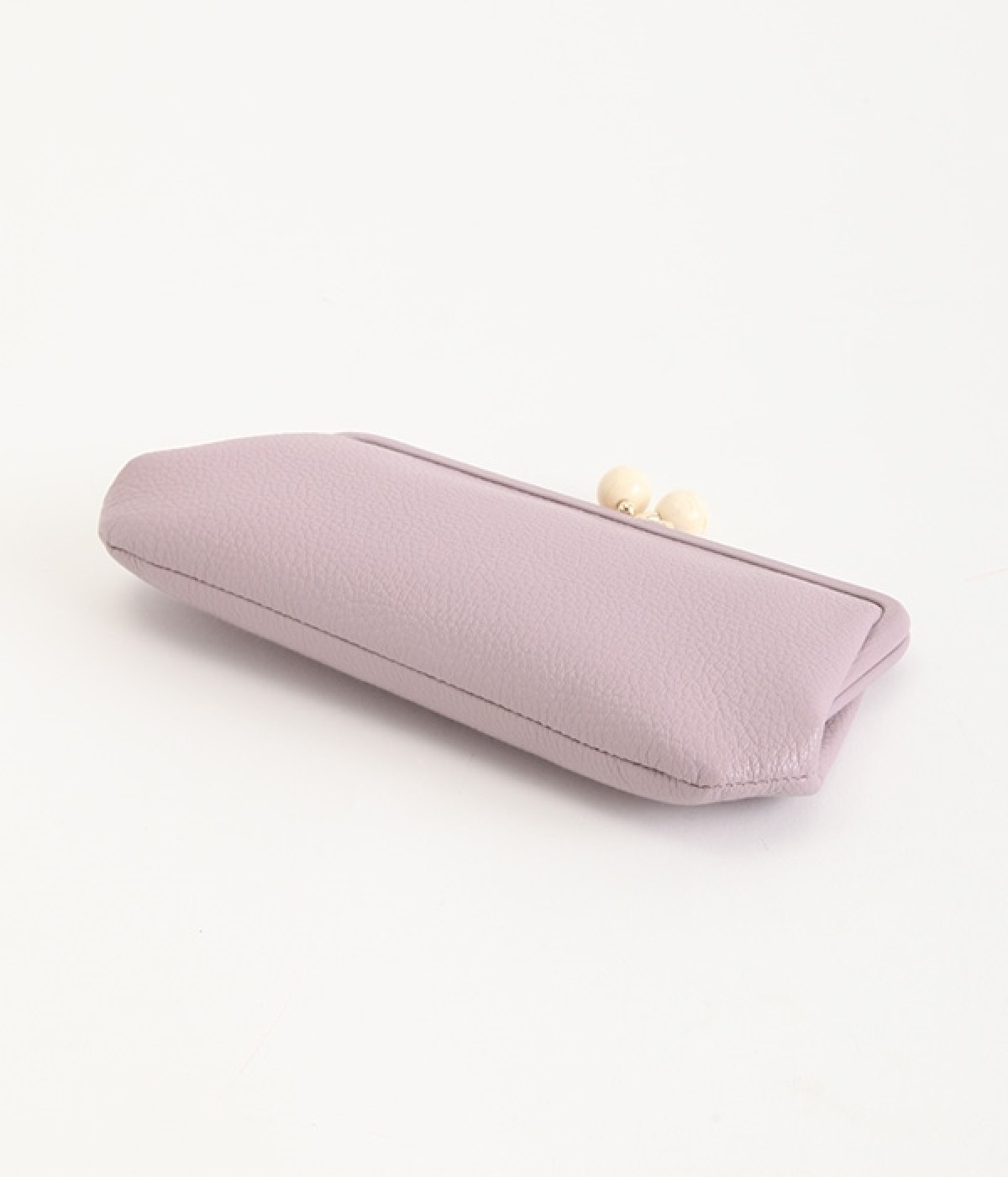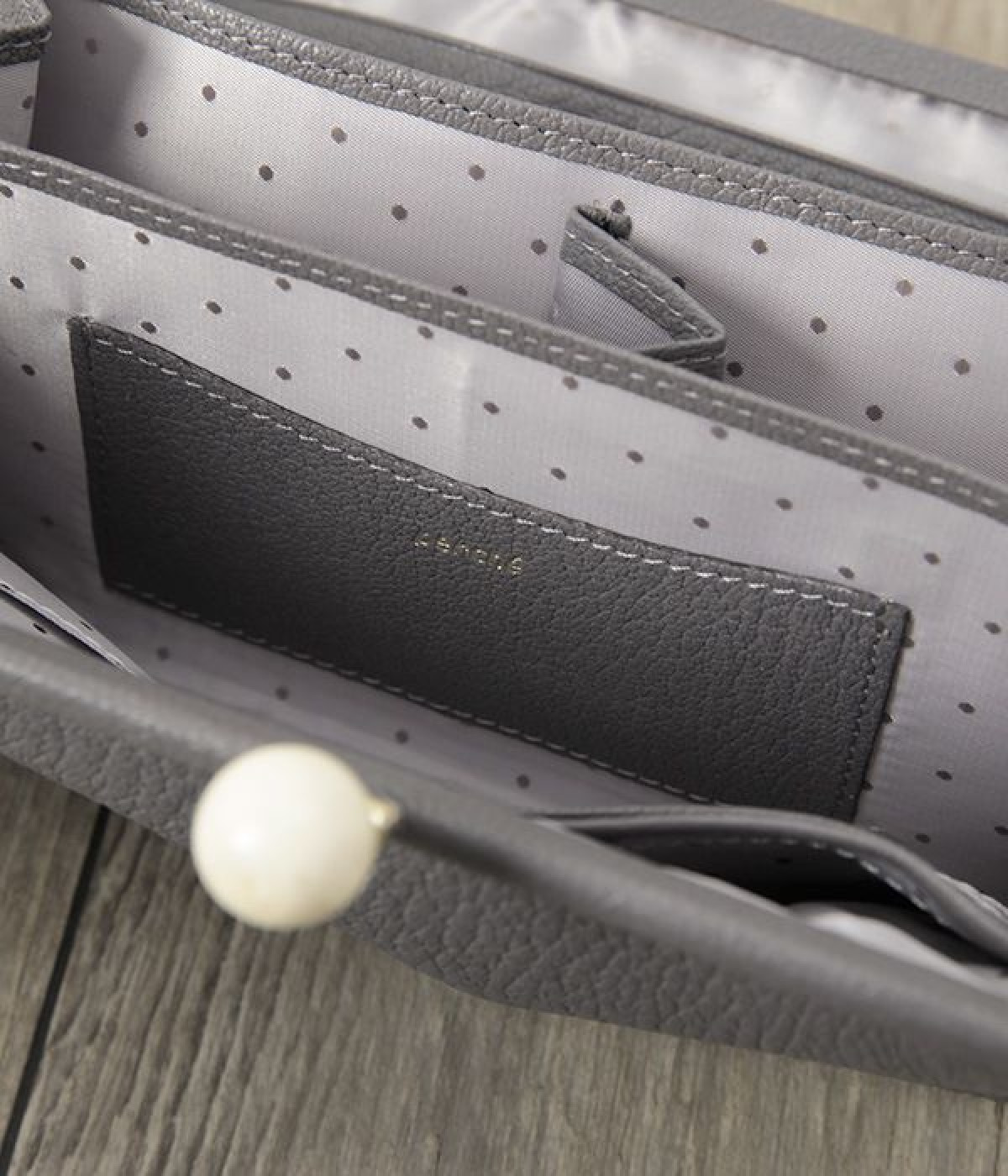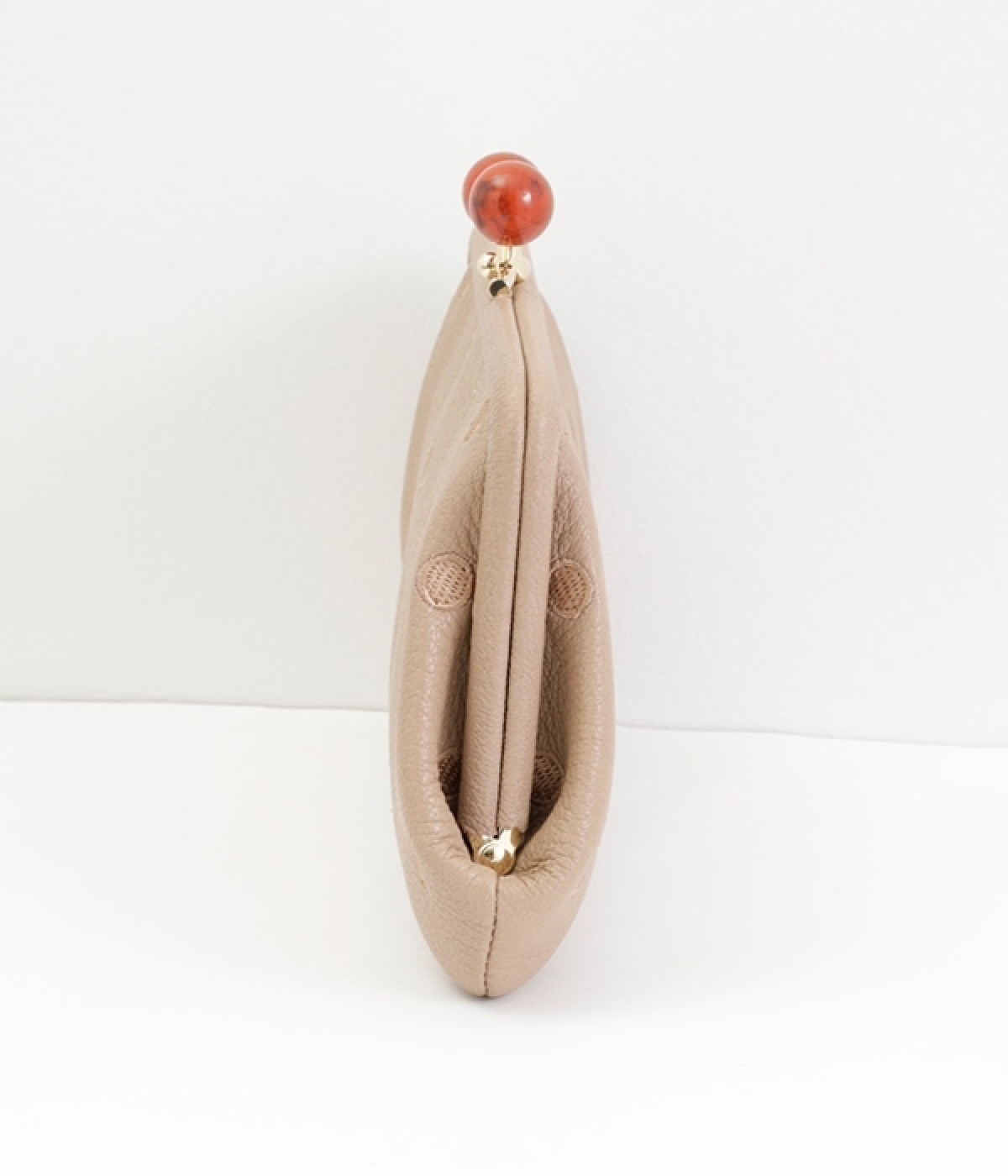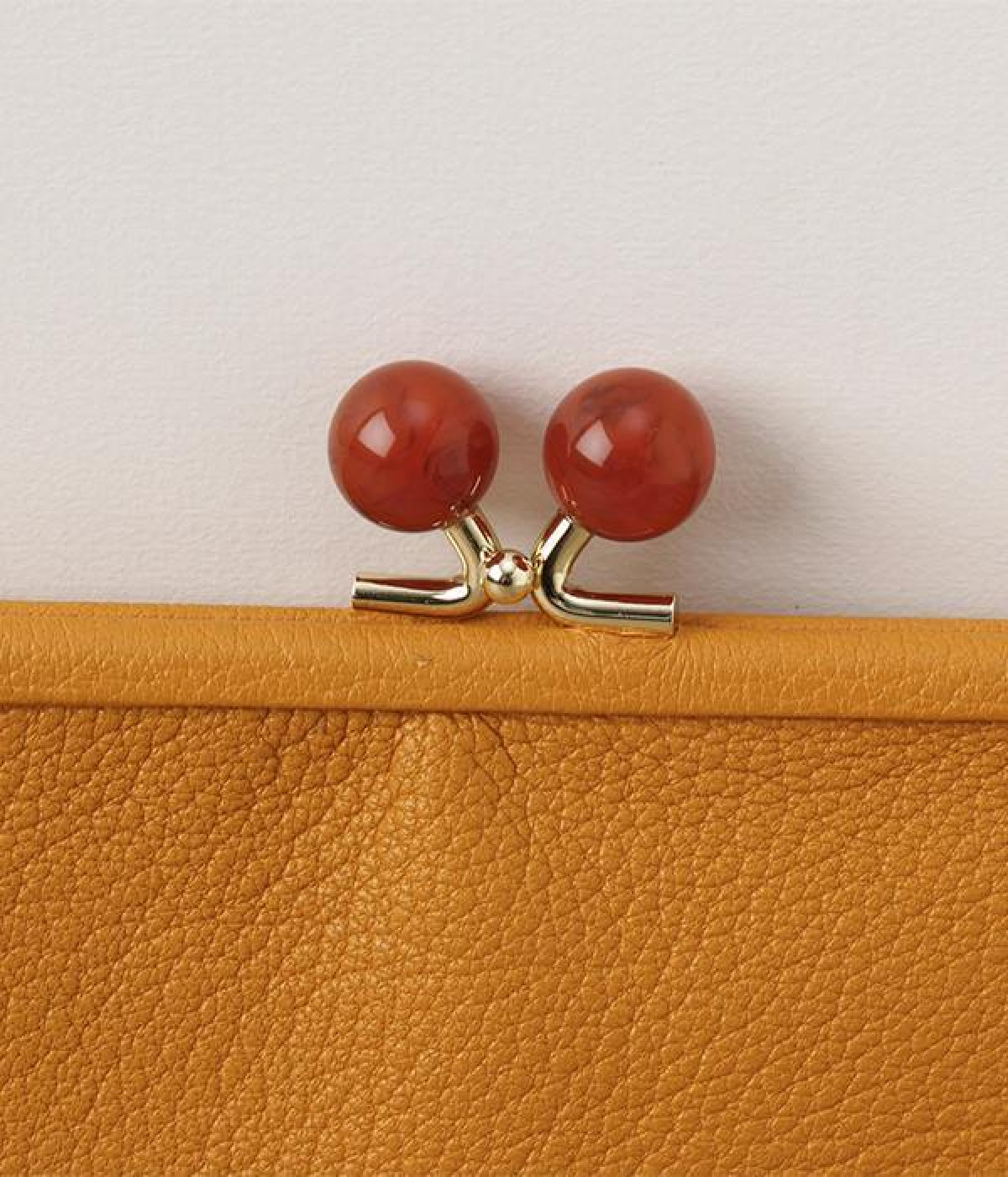 ふんわりとした手触りの山羊革に、ドットの刺しゅうをあしらって可愛らしく仕上げました。中の裏地にもドット柄が入っています。ゴールド金具とがま口部分のアクリル玉がアクセント。