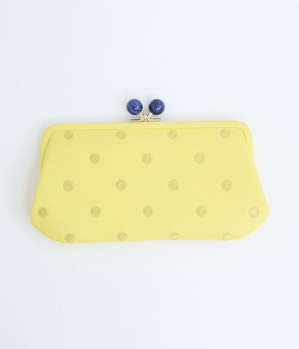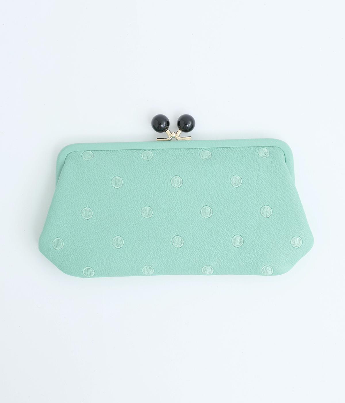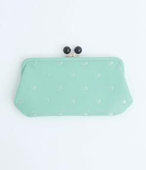 ふんわりとした手触りの山羊革に、ドットの刺しゅうをあしらって可愛らしく仕上げました。中の裏地にもドット柄が入っています。ゴールド金具とがま口部分のアクリル玉がアクセント。