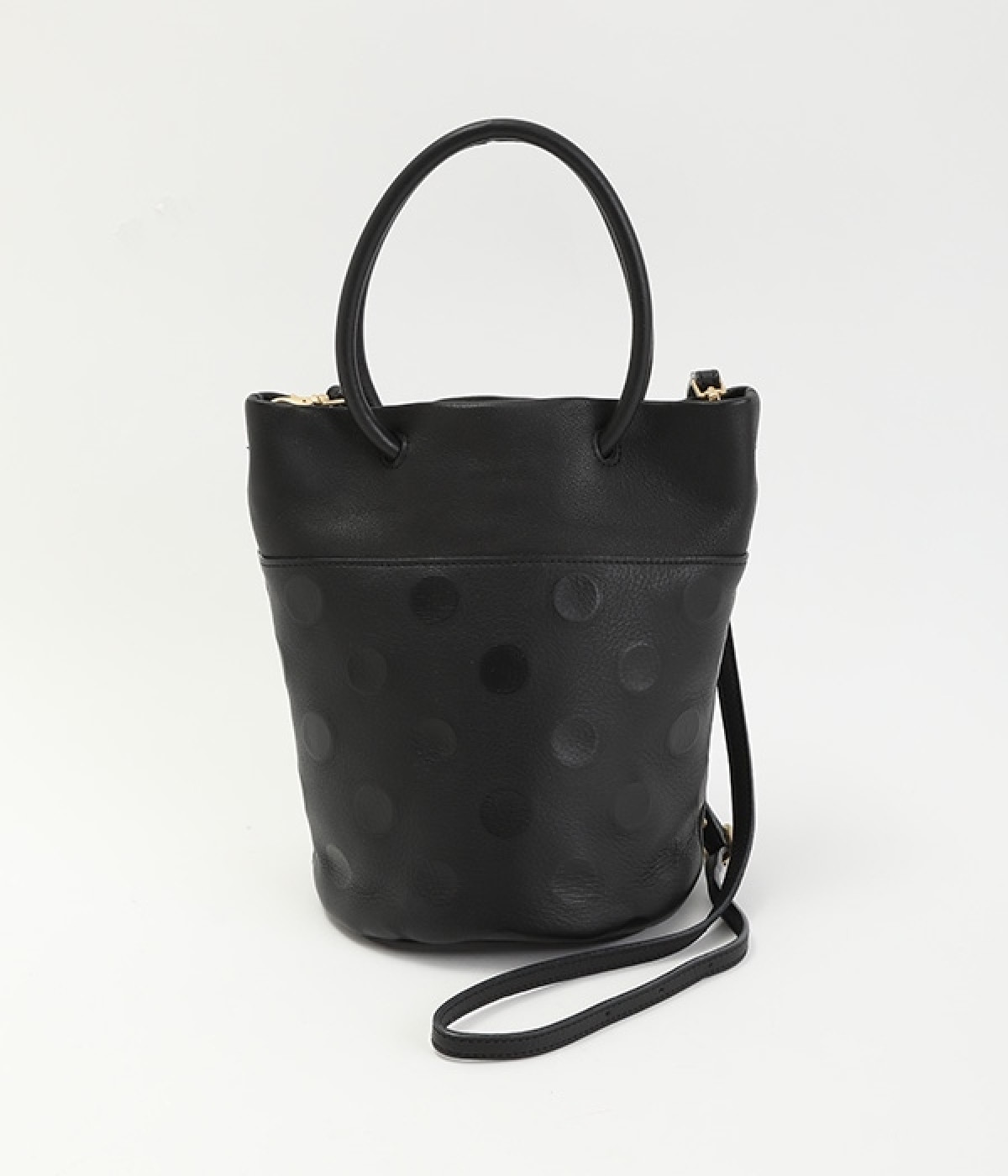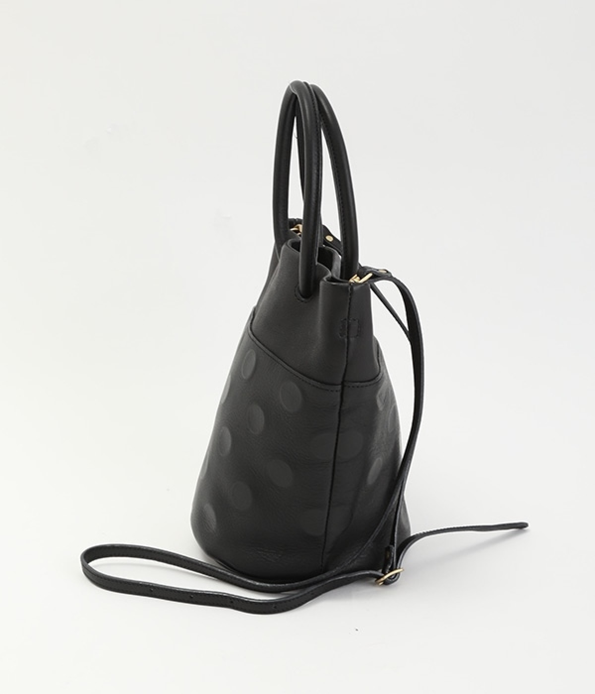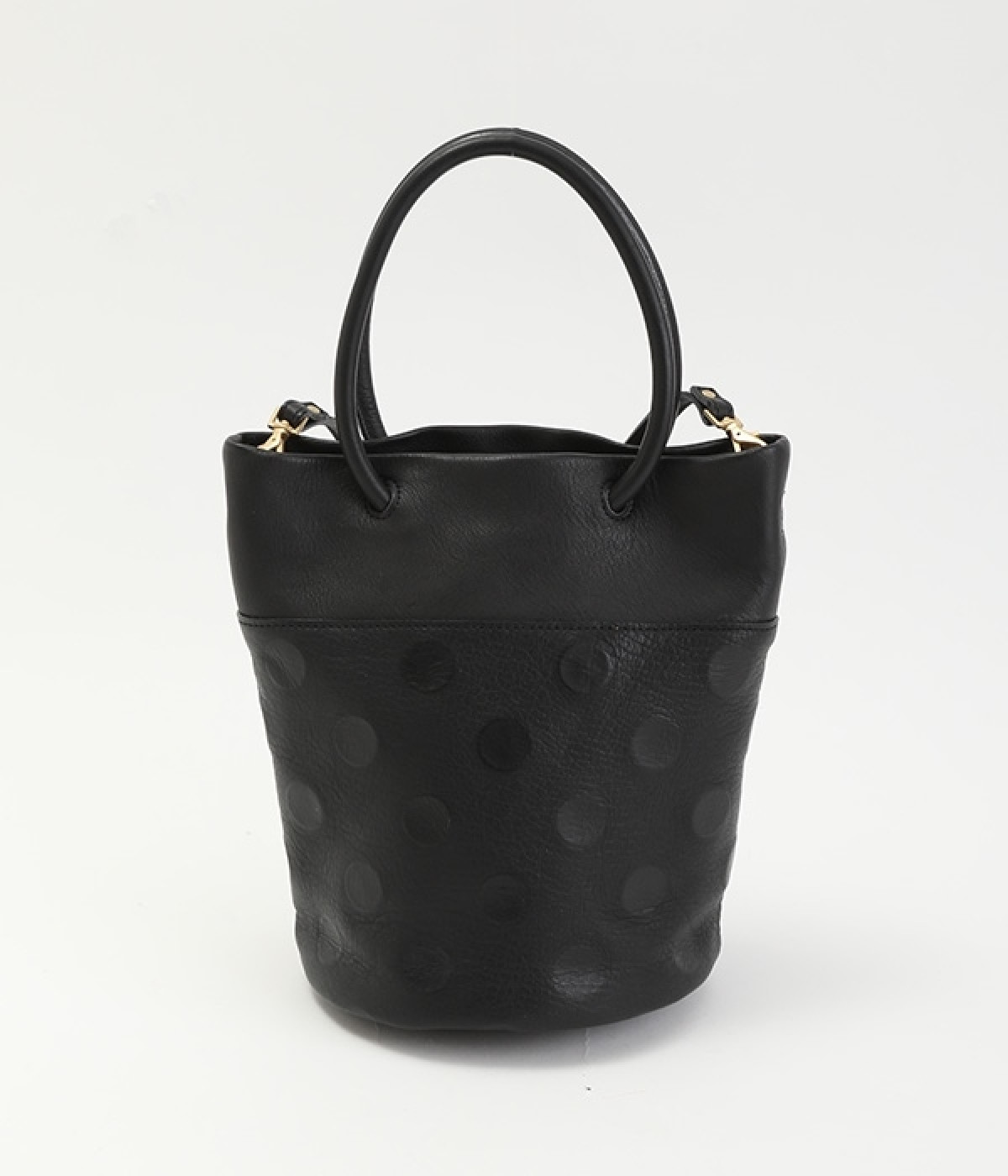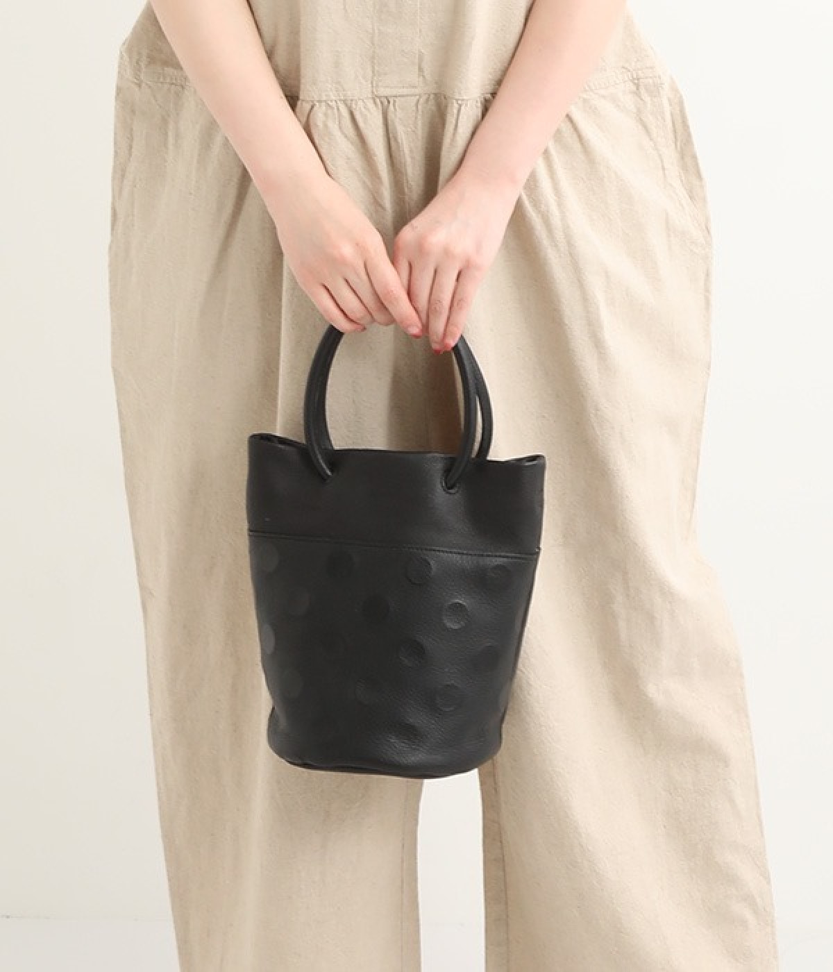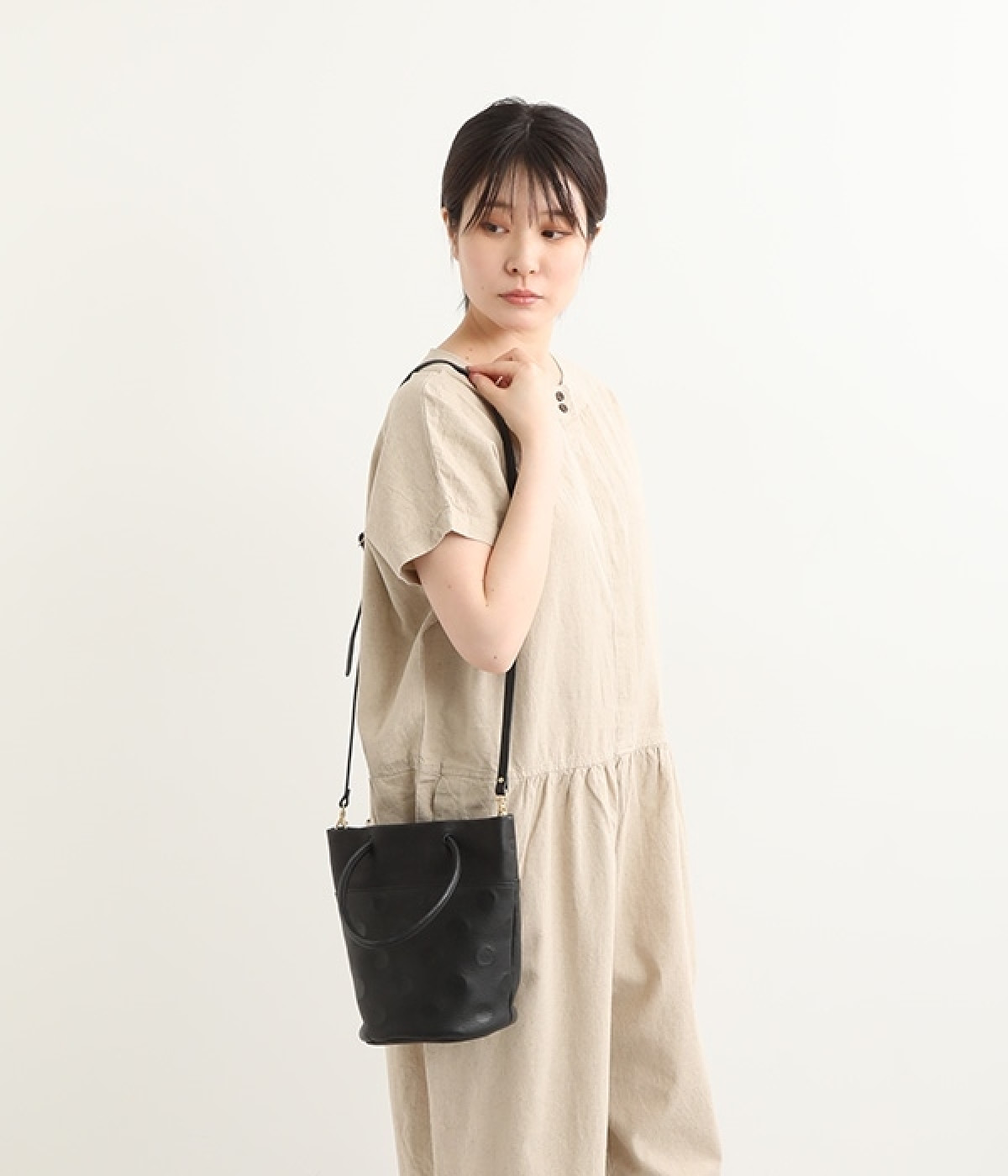 ナチュラン11周年記念商品です。柔らかでツヤ感の美しい姫路レザーを使ったバケツバッグです。丸い持ち手が女性らしさをプラスしてくれるデザイン。長財布、ポーチ、500mlのペットボトルなどが入るサイズで、肩がけも可能なショルダー付きなのでデイリーユースにおすすめです。開口部はマグネットボタン仕様。ドットの型押しはナチュラン先行のweb限定アイテムです。