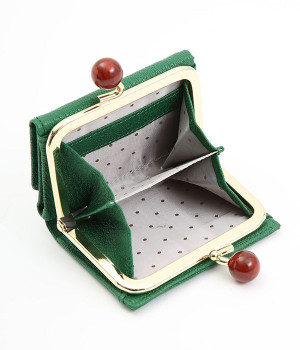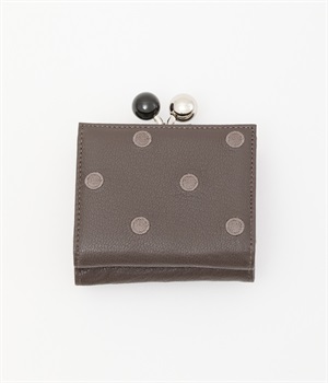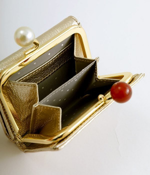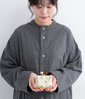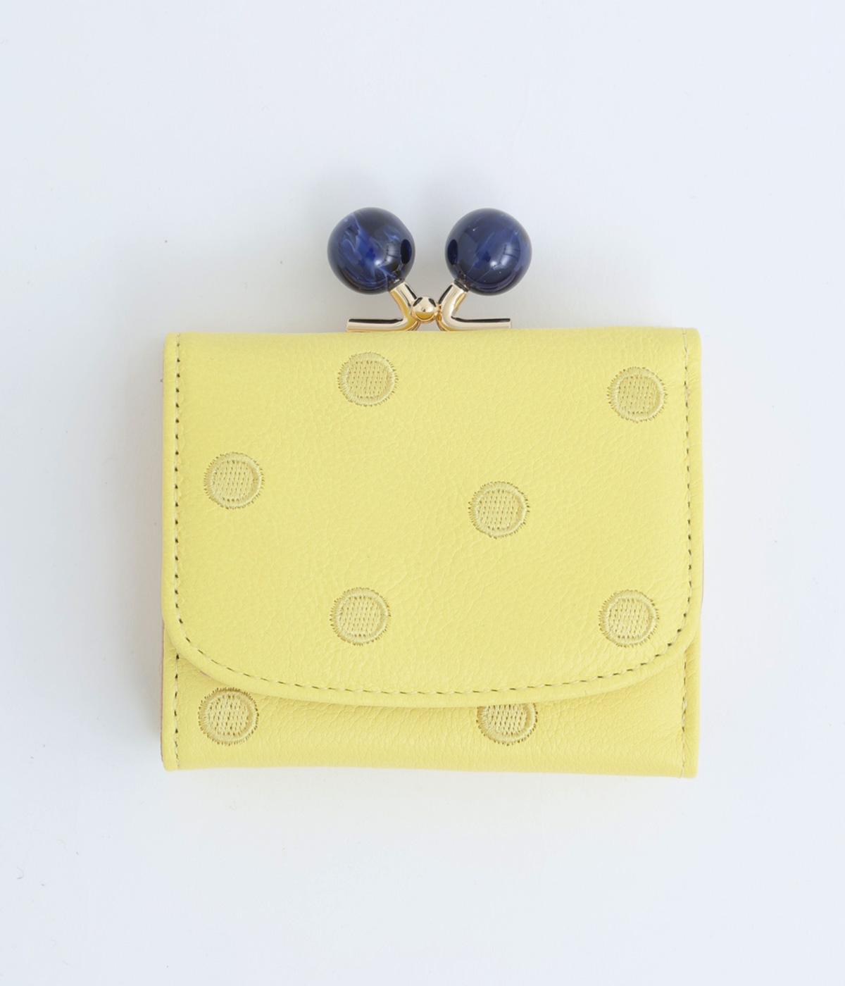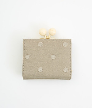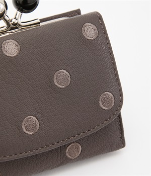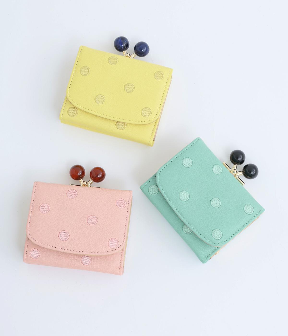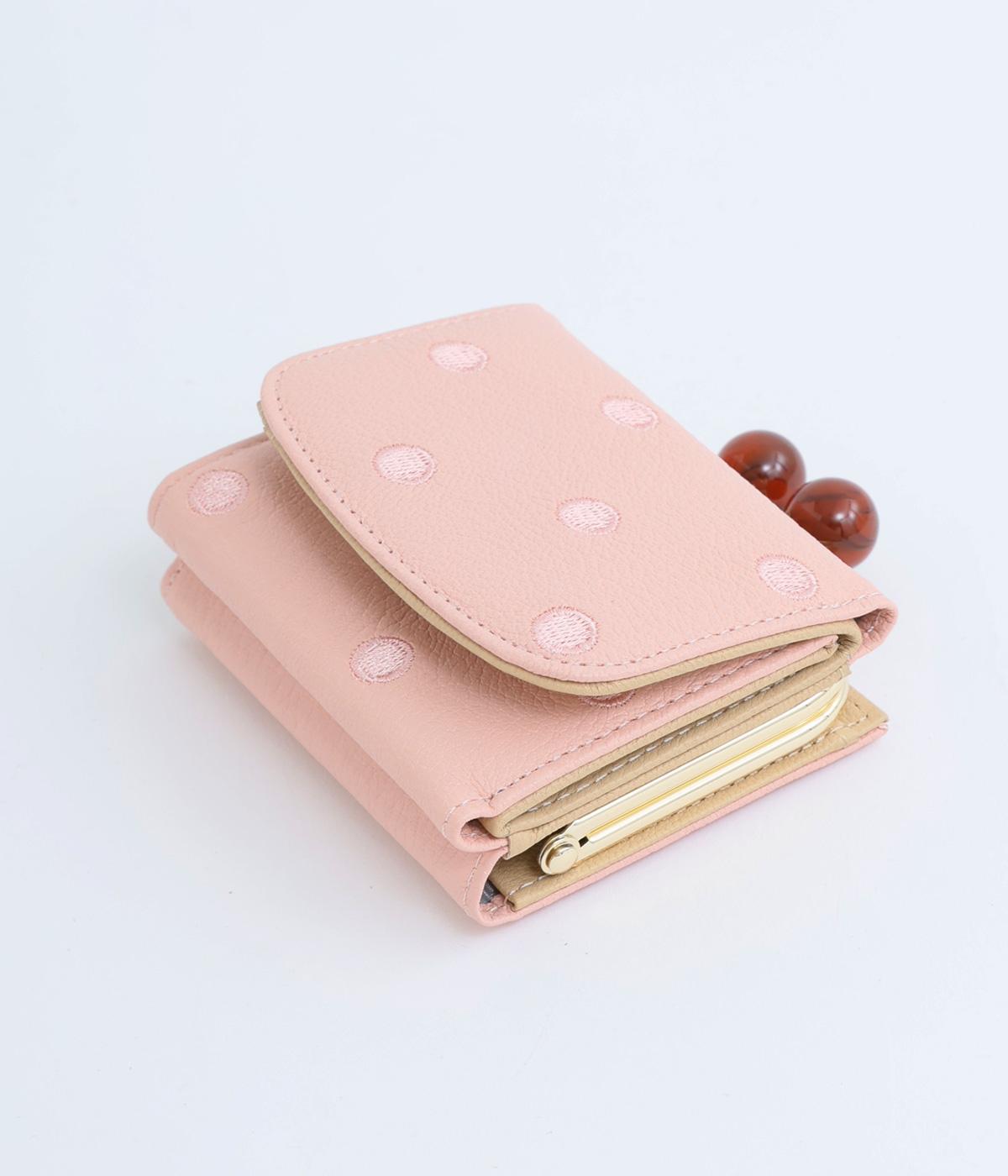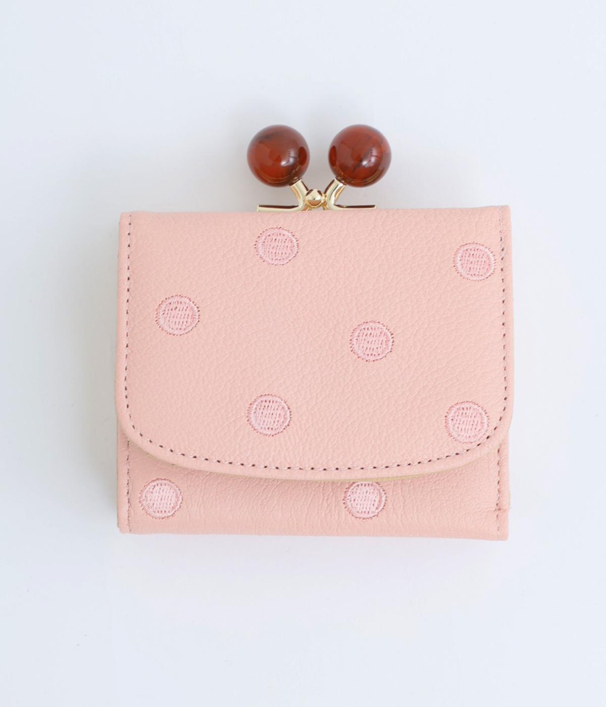 ふんわりとした手触りの山羊革に、ドットの刺しゅうをあしらって可愛らしく仕上げました。中の裏地にもドット柄が入っています。ゴールド金具とがま口部分のアクリル玉がアクセント。