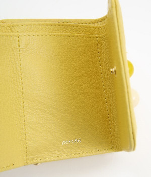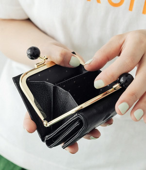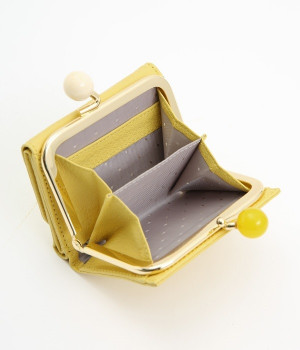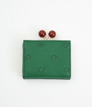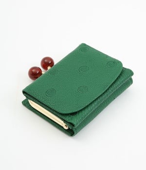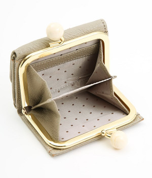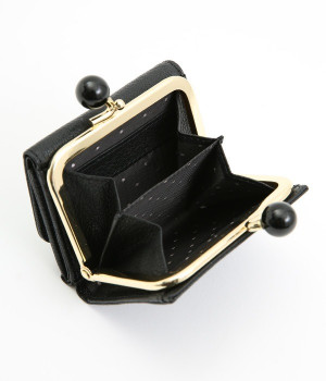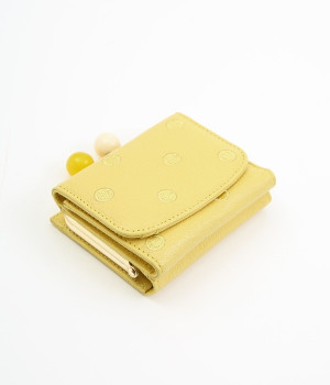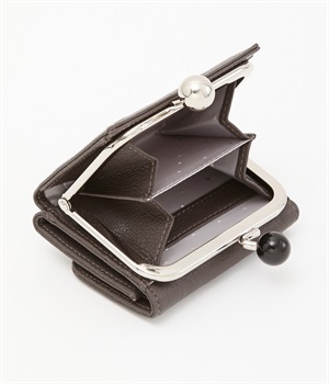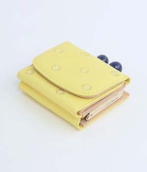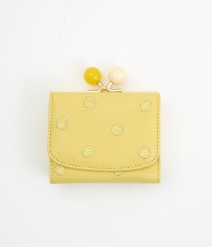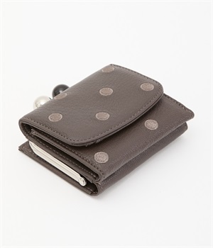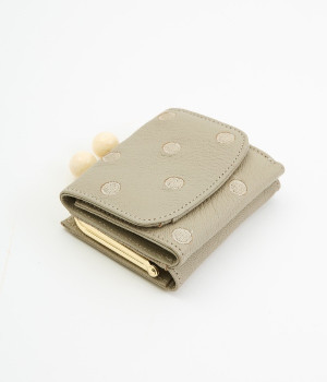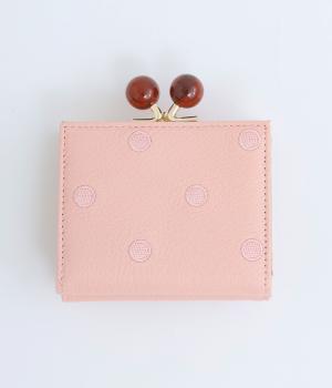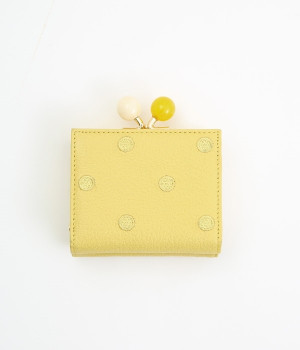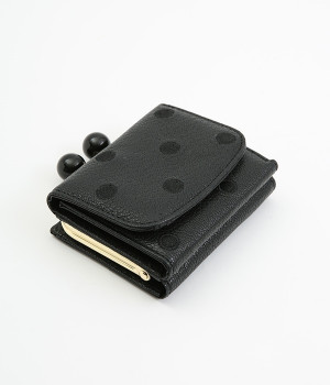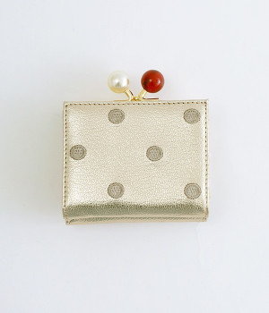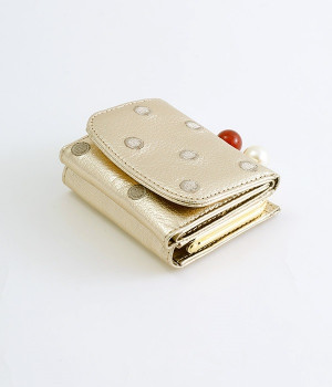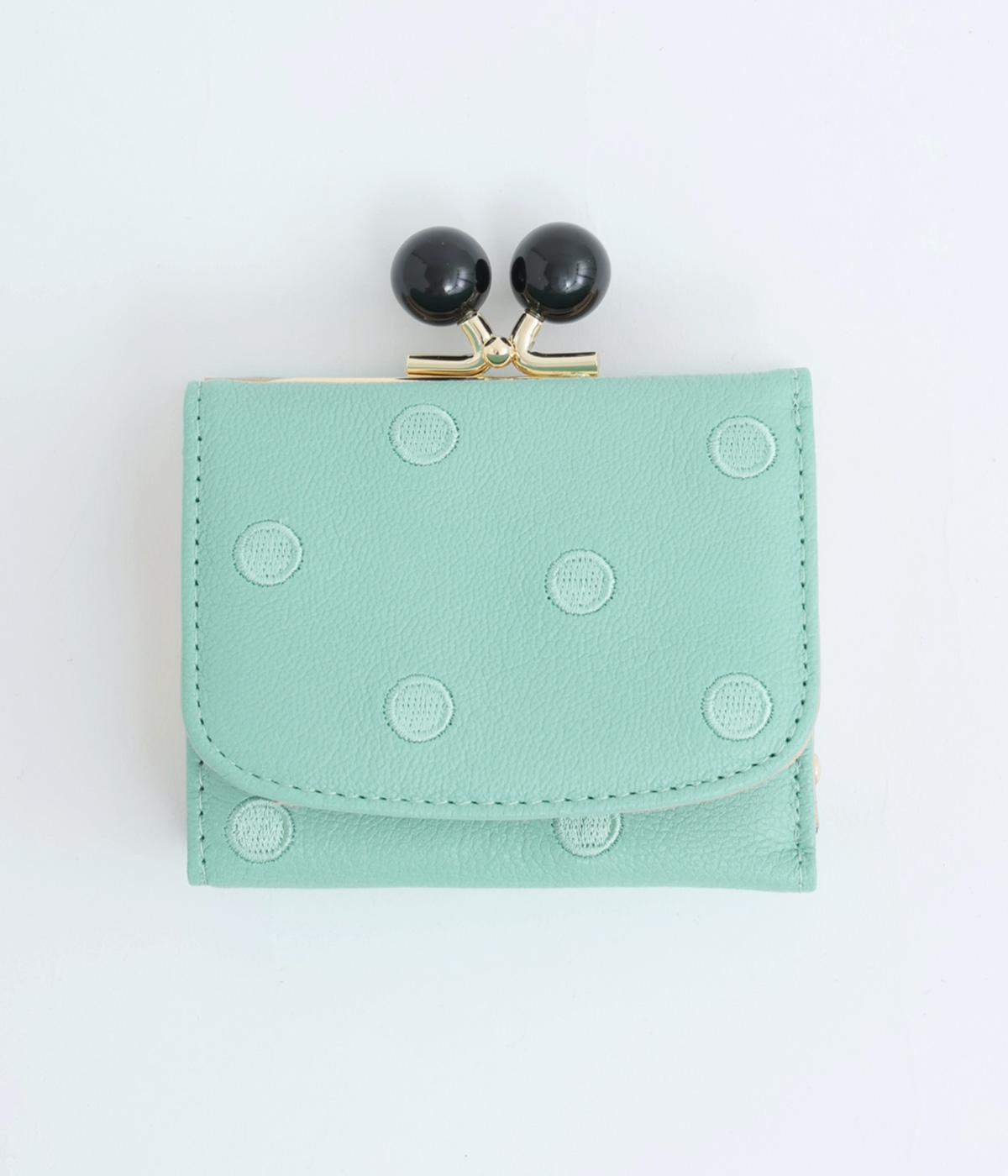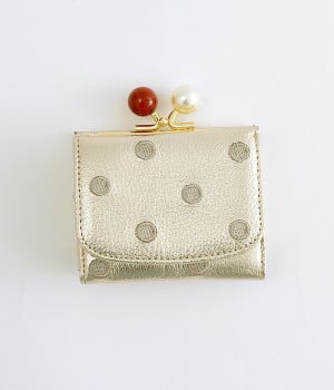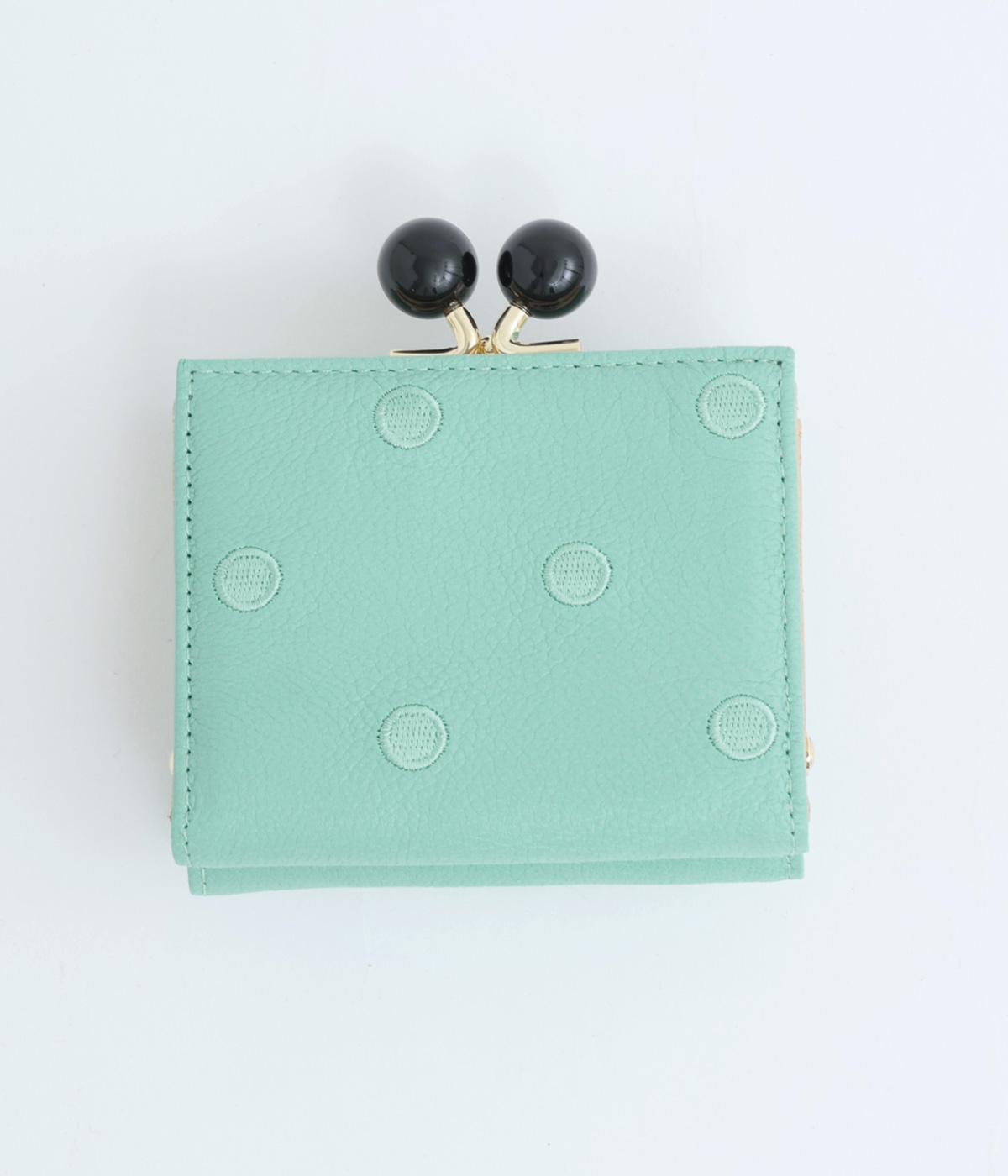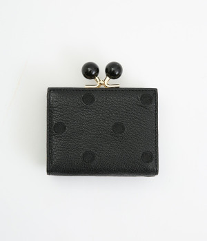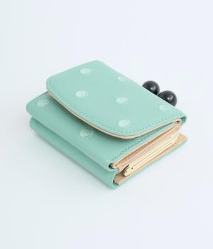 ドット柄とがま口のアクリル玉がかわいい三つ折り財布です。持ち歩きやすいコンパクトなサイズ感ながら、ホックを開けるとカード入れが6か所、お札入れや小銭入れも完備。しっかりと収納力を備えています。