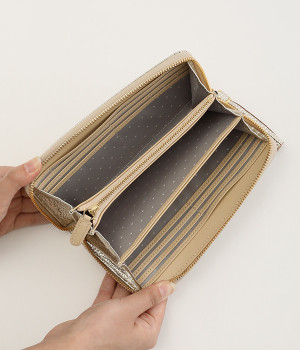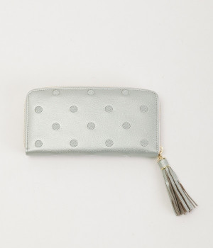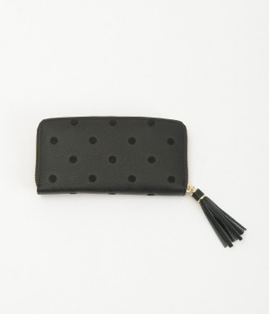 シンプルな中にもフェミニンな要素をさりげなく取り入れる、女性のためのブランドペルケ。牛革に同系色の糸で刺繍でドット柄を施した長財布。カード入れやポケットの仕切りが細かく、整理しやすいお財布です。内側の生地もドット柄。ジッパーについたタッセルもポイント。箱入りなので、プレゼントにも最適です。