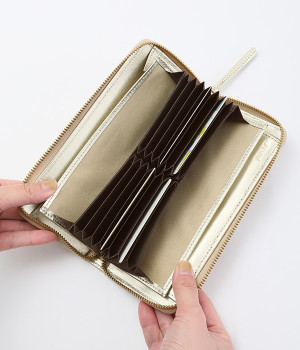 箔加工は職人による特別な技法で染色していない無垢の状態の皮革へ箔を貼り付け、真空状態にして圧着をした素材です。そのため継続的なご使用により、革の表面が擦れ革の地肌の透けは避けることが出来ません。特に摩擦や、アルコール消毒液等の付着にご注意下さい。剥げてしまった色は修復が難しい性質となっておりますので、ご了承ください。