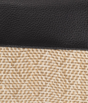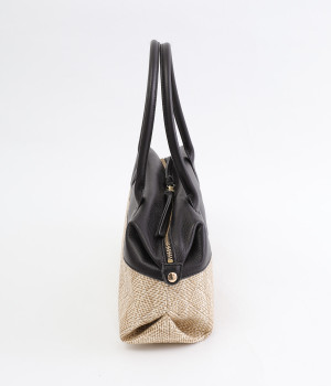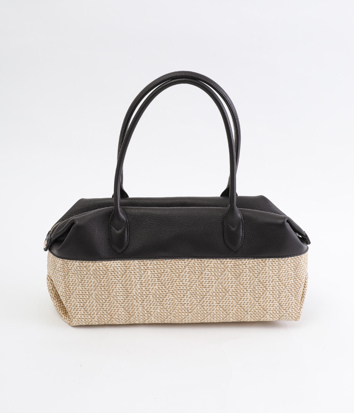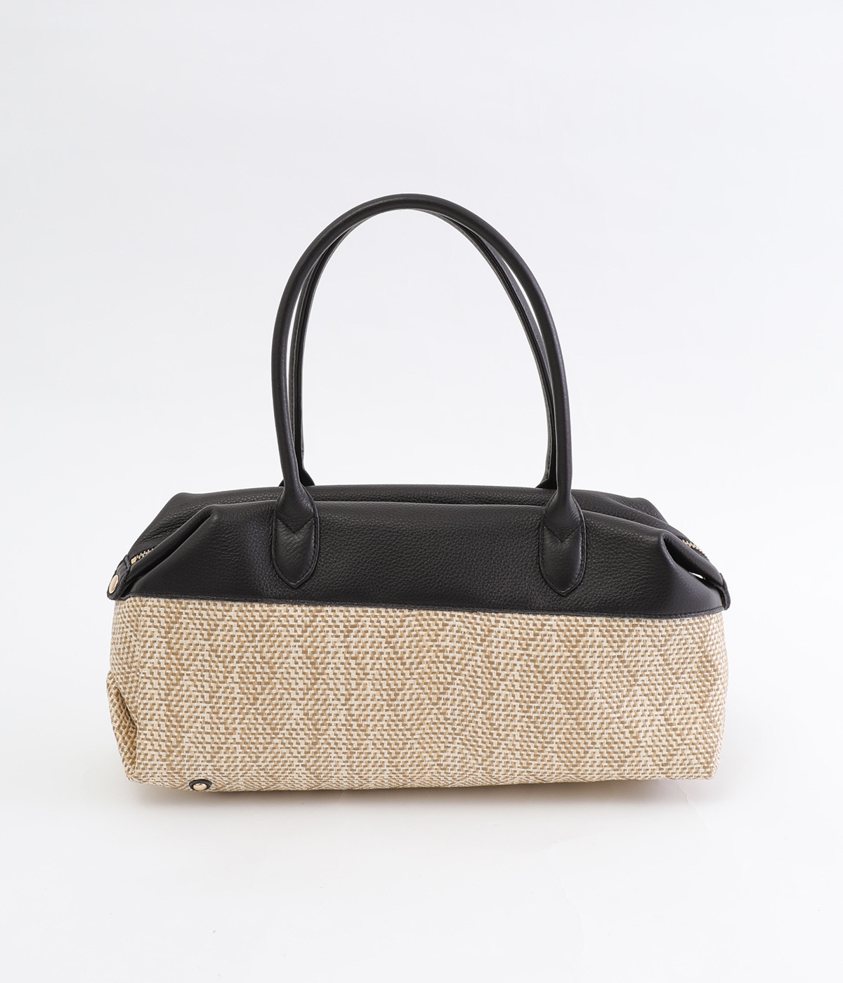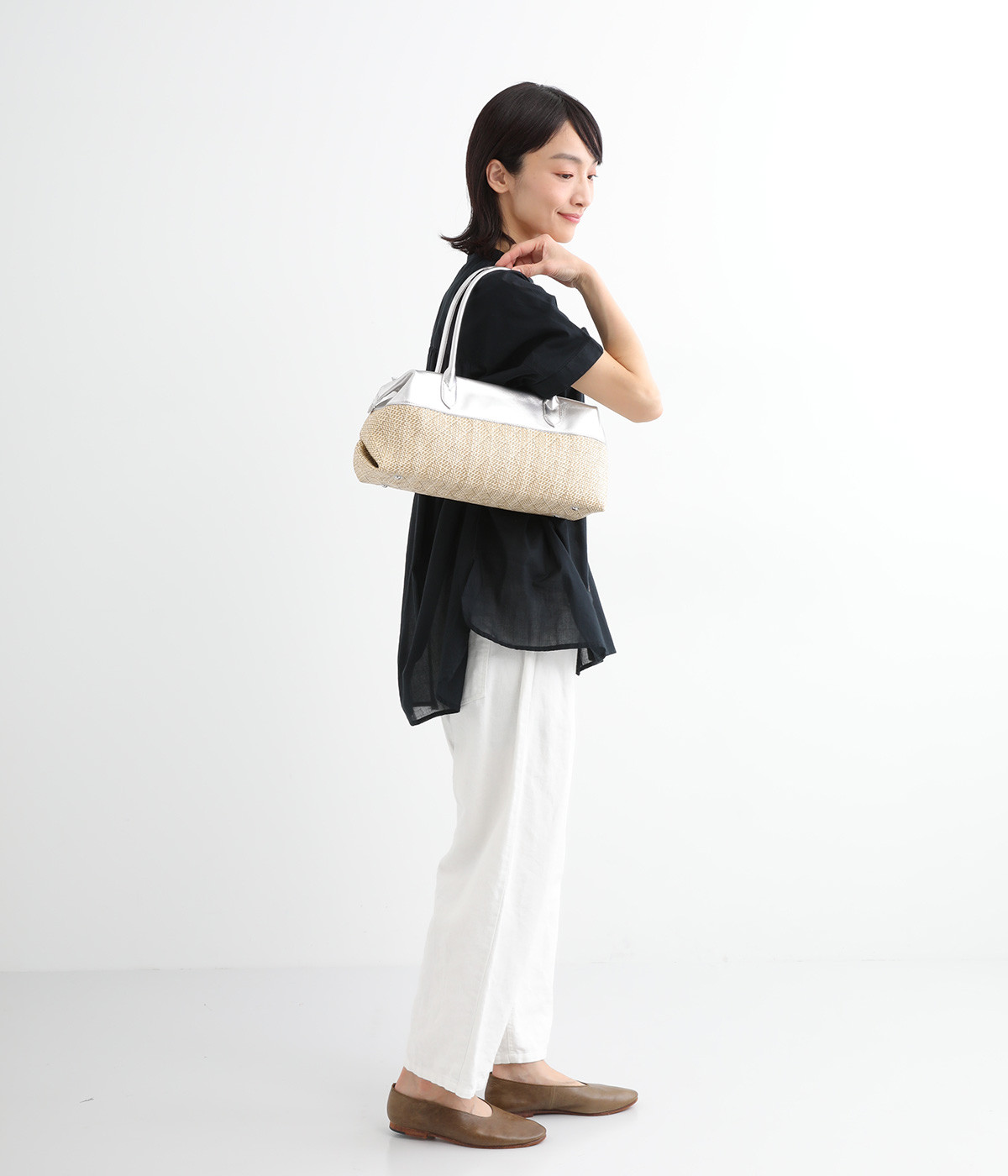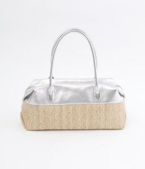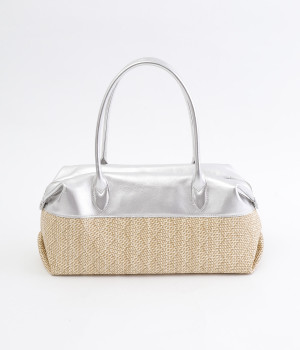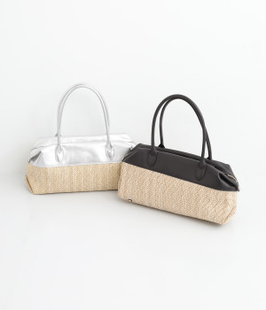 コットンやレーヨンなどを混紡した素材と牛革の組み合わせ。本革を合わせることで、大人っぽく上質な雰囲気に仕上がっています。