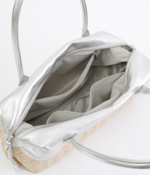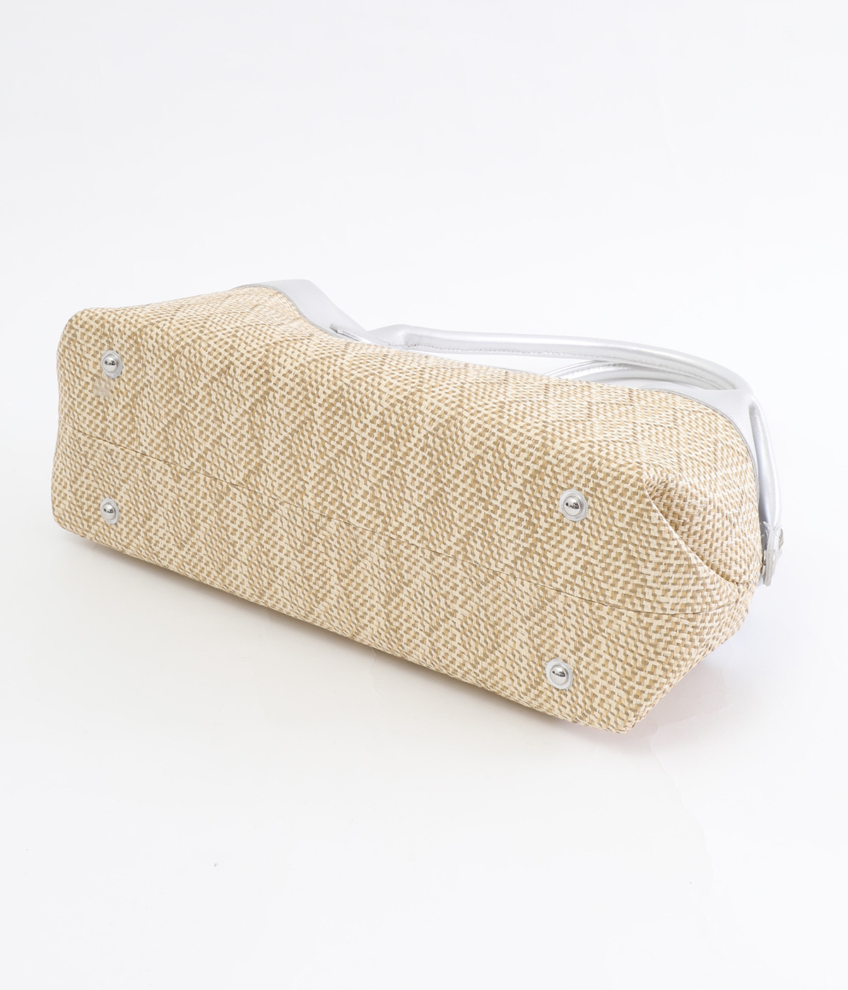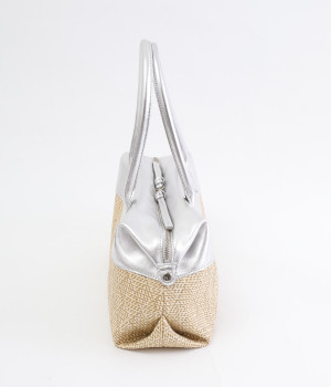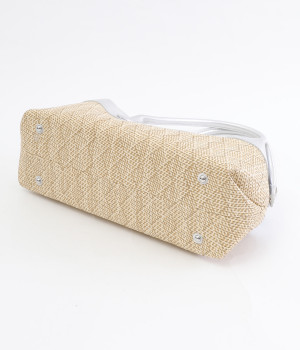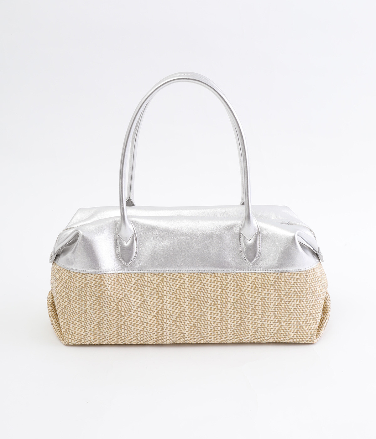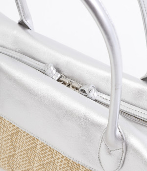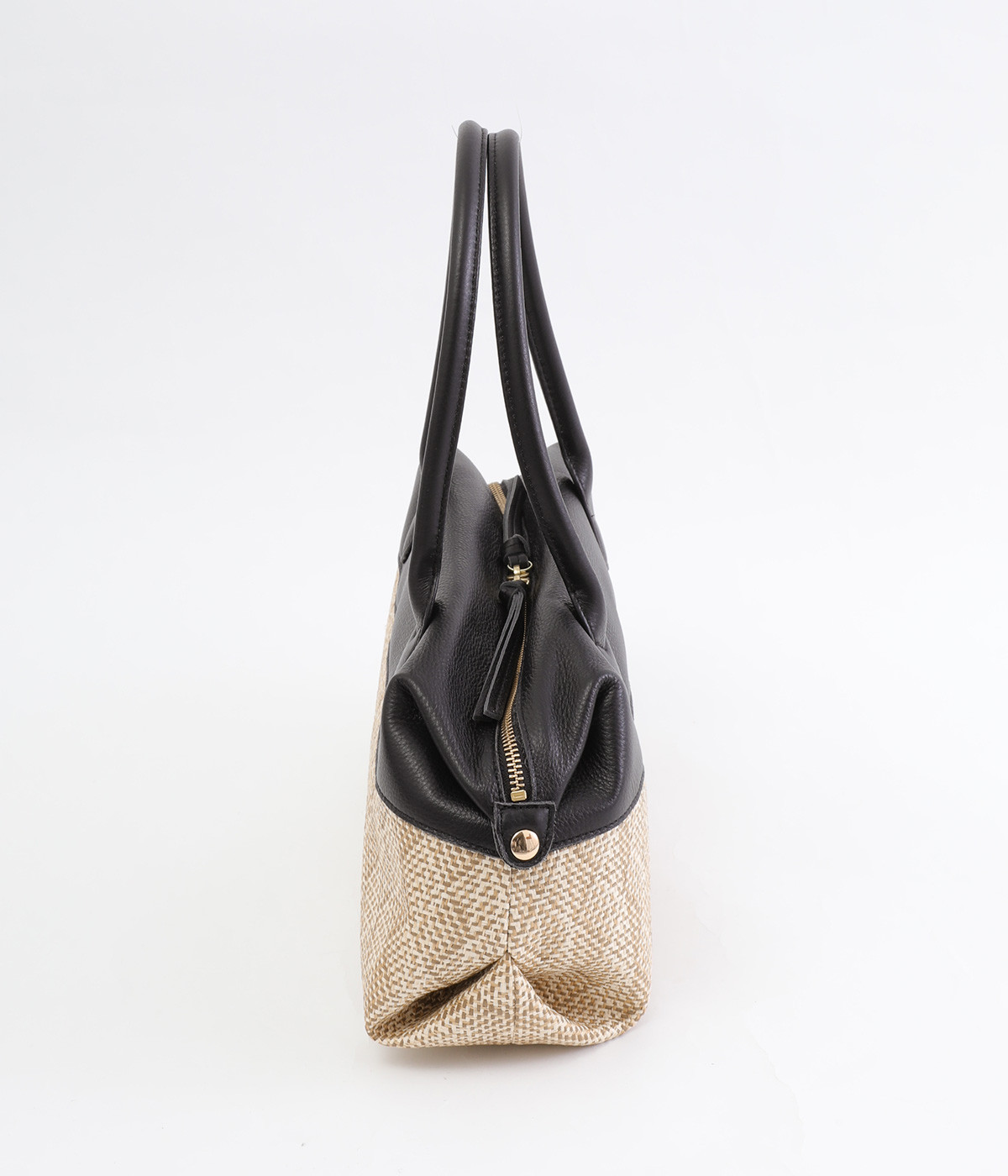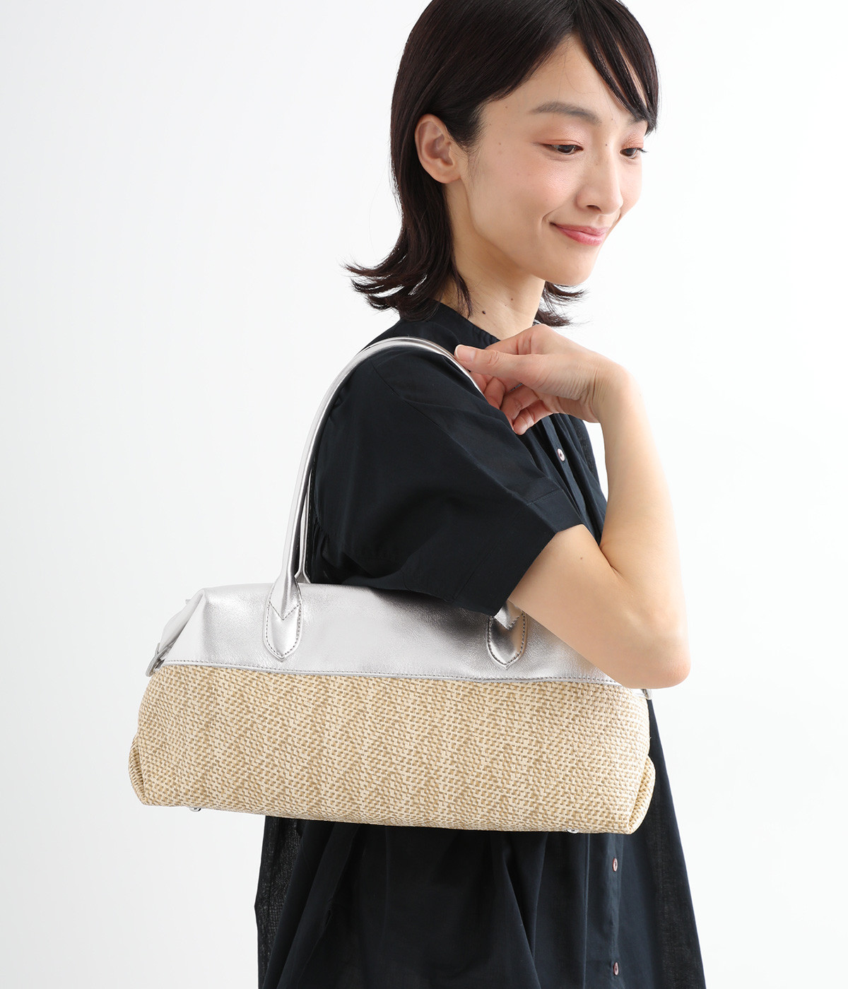 コットンやレーヨンなどを混紡した素材と牛革の組み合わせ。本革を合わせることで、大人っぽく上質な雰囲気に仕上がっています。