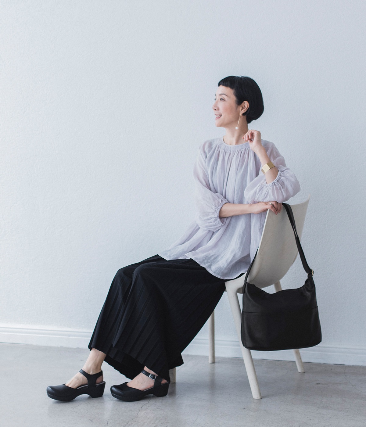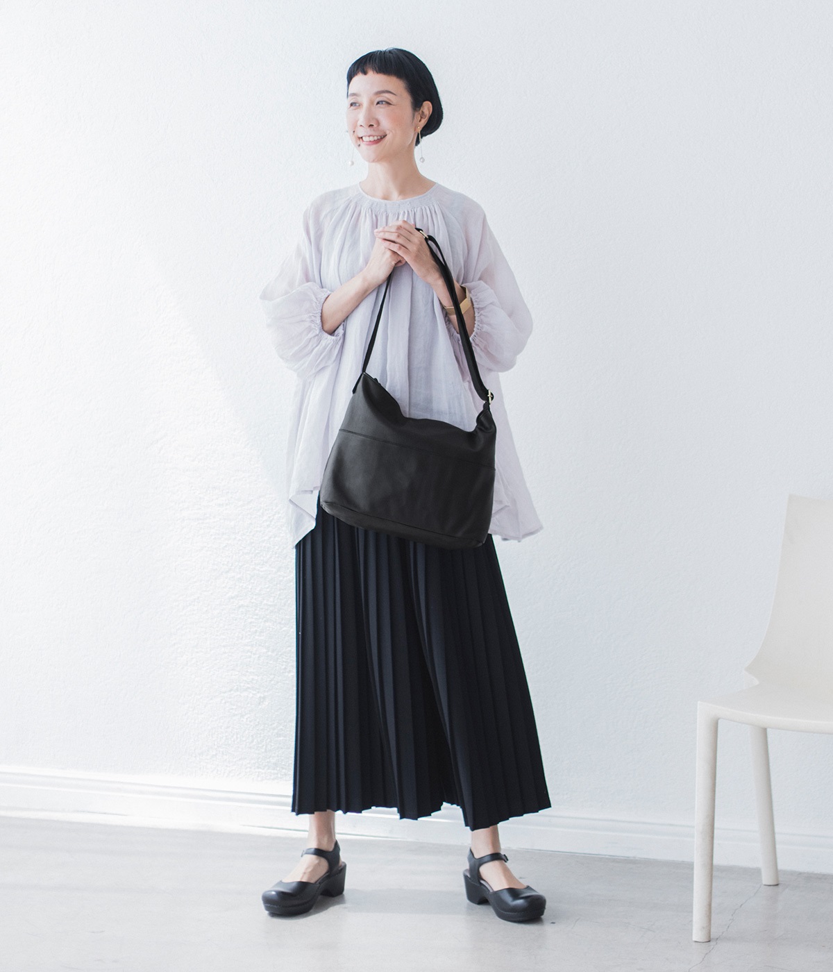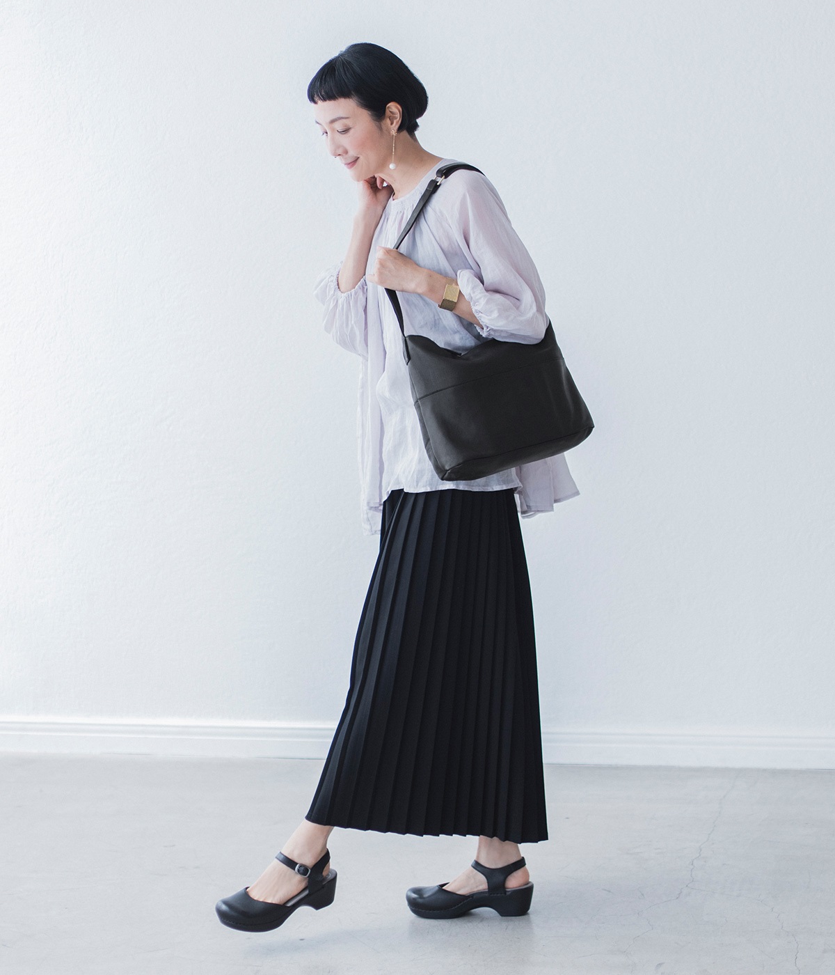 シアーなブラウスにプリーツスカートを合わせた、クラシカルなスタイリングに。上質なレザー素材が、きれいめな装いにもマッチします。