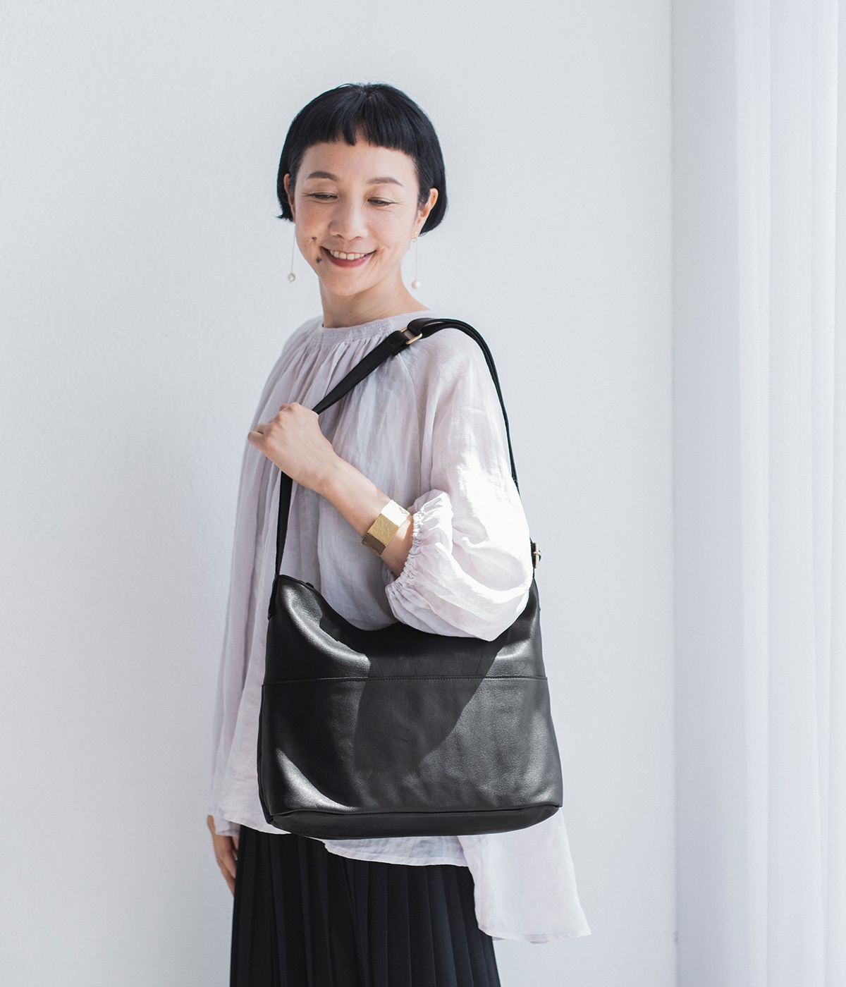 ストラップを短くすれば、肩掛けバッグとしても活躍。気分やスタイルに合わせて雰囲気を変えられるのもポイントです。