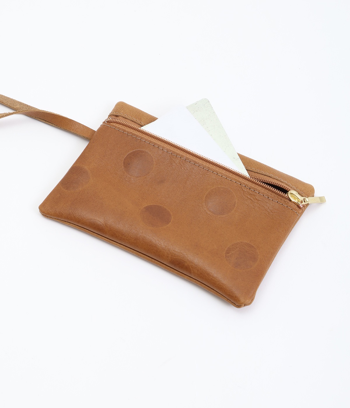 何かと便利なポーチには、環境に配慮した残皮を使用。レザーの風合いを活かしたエンボス加工が、さりげないアクセントになっています。