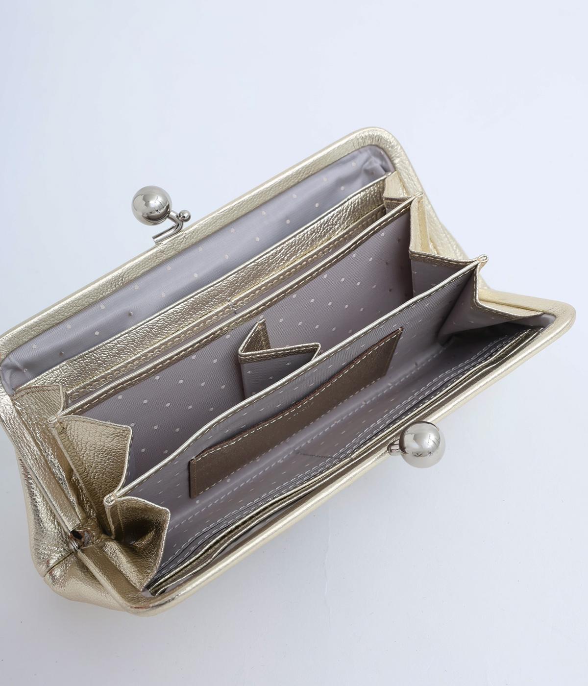 いろいろなサイズや形のスタッズがクールな印象の長財布です。パカっと開くと全体がよく見える使い勝手の良さ。コロンと大きめのがま口の玉や、フリンジ付きのファスナーで開け閉めしやすいのも嬉しいポイントです。