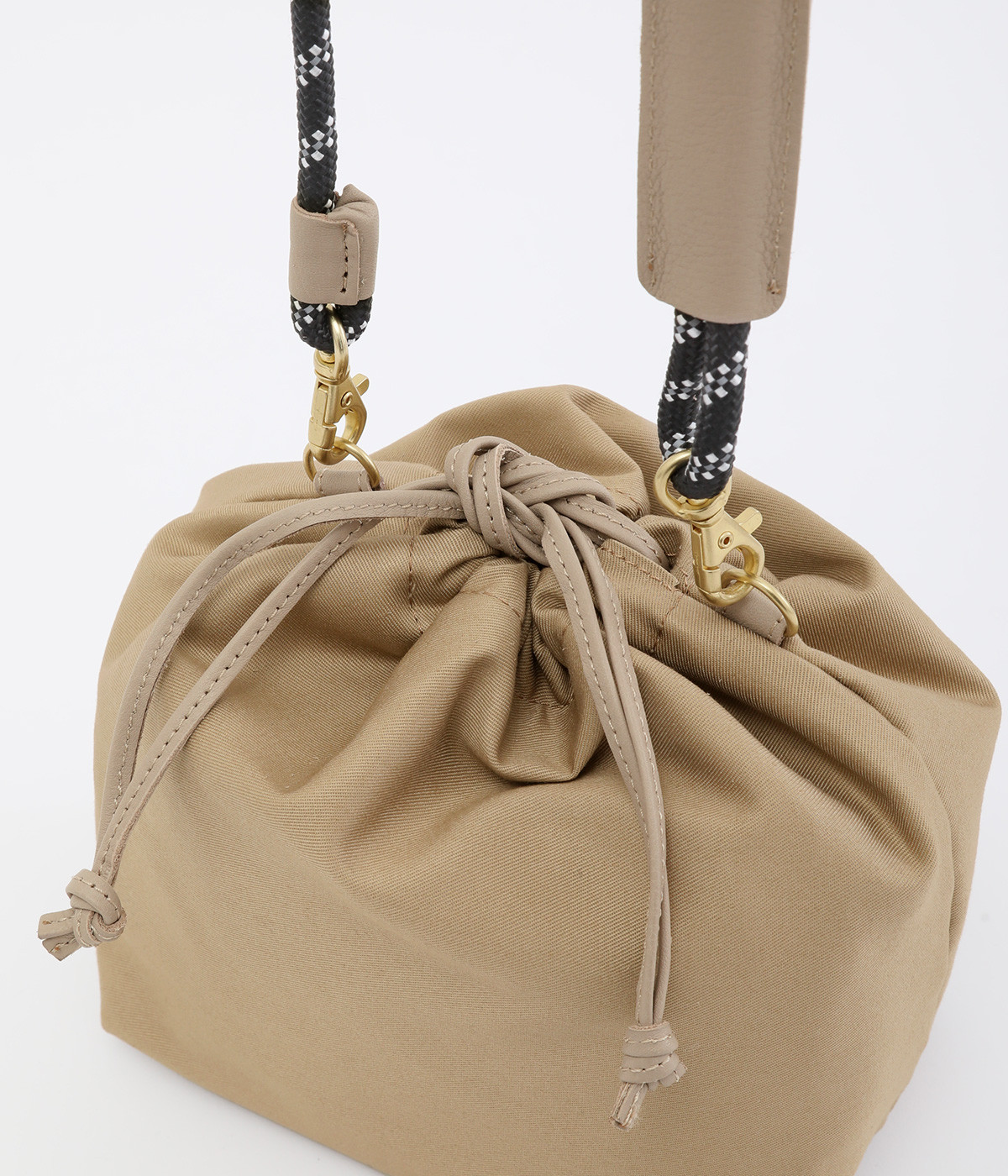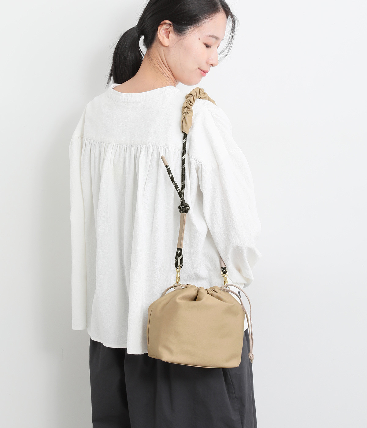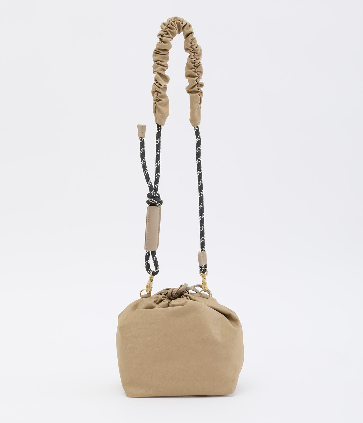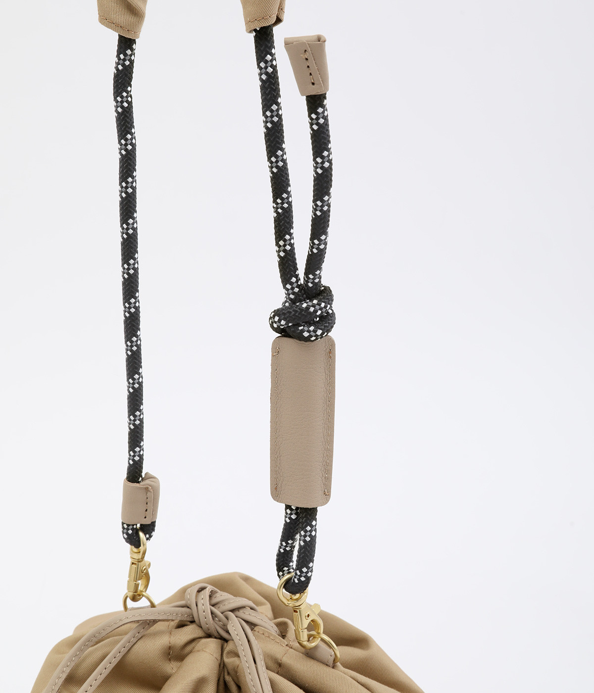 手提げの巾着としても、ショルダーバッグとしても使える2way仕様です。ころんとしたフォルムが着こなしのポイントにも。取り外し可能なショルダーは、コードの一部を布で覆って肩への負担を軽減しつつアクセントになっています。